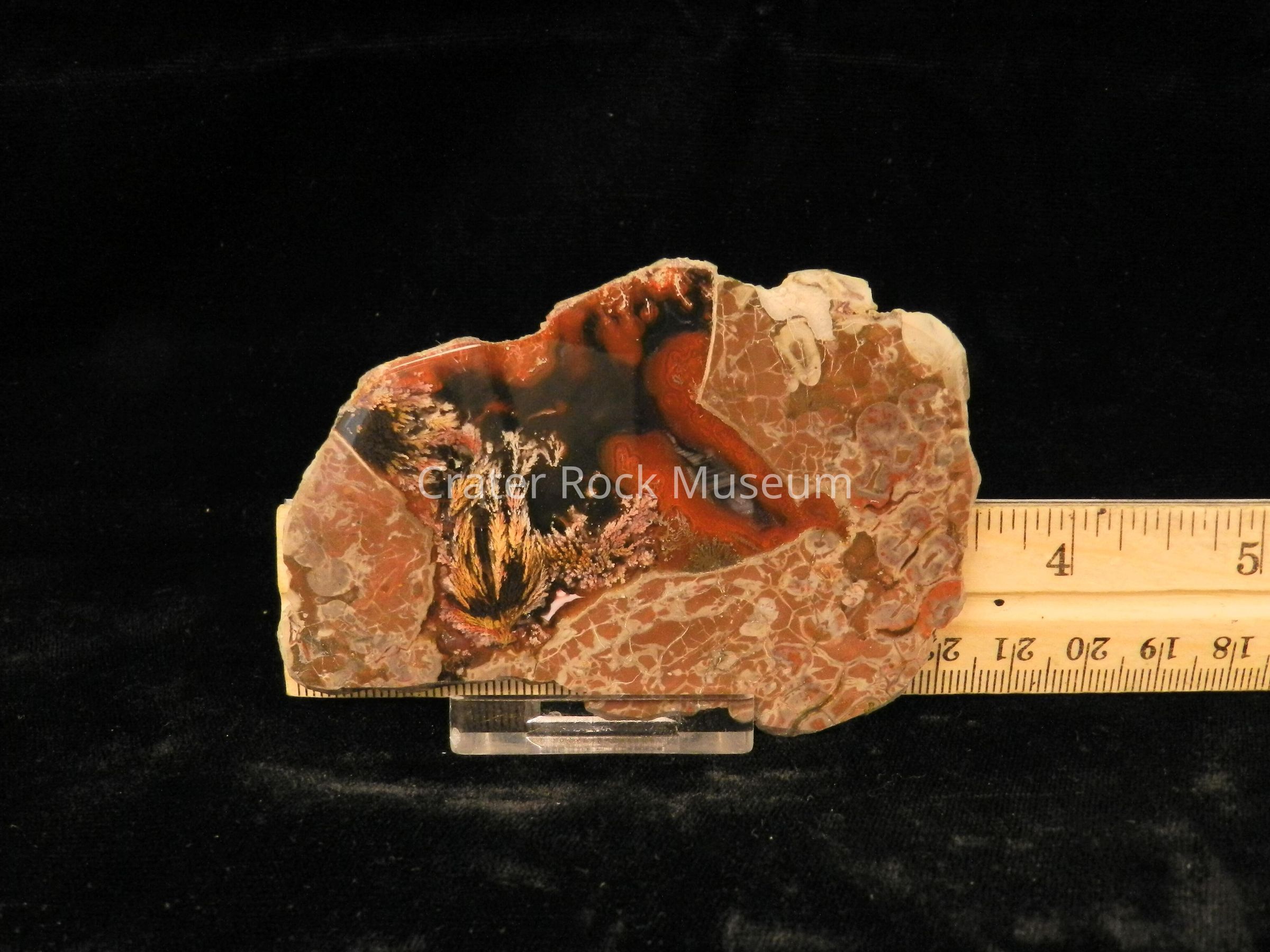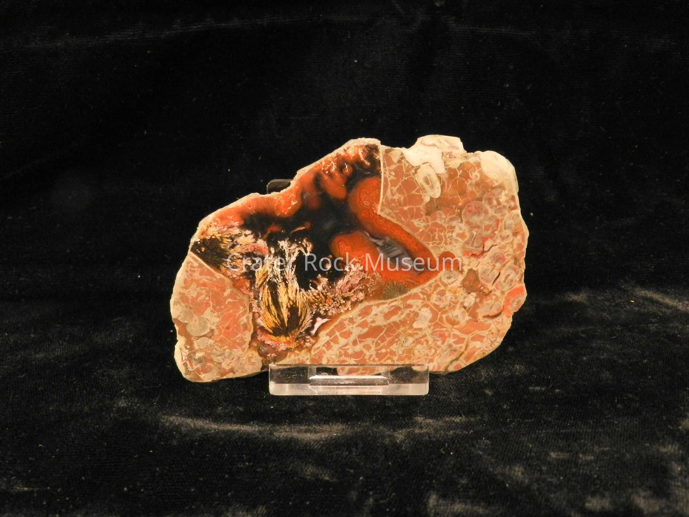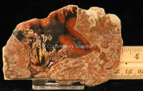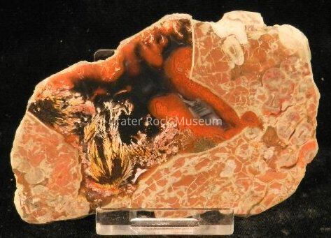 Description: Thin slab with polished face. Multiple cells and orbicular structures of reddish-brown on outer regions with dark red and black inner areas and a yellow and dull pink plume in center area.Collection