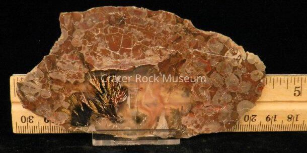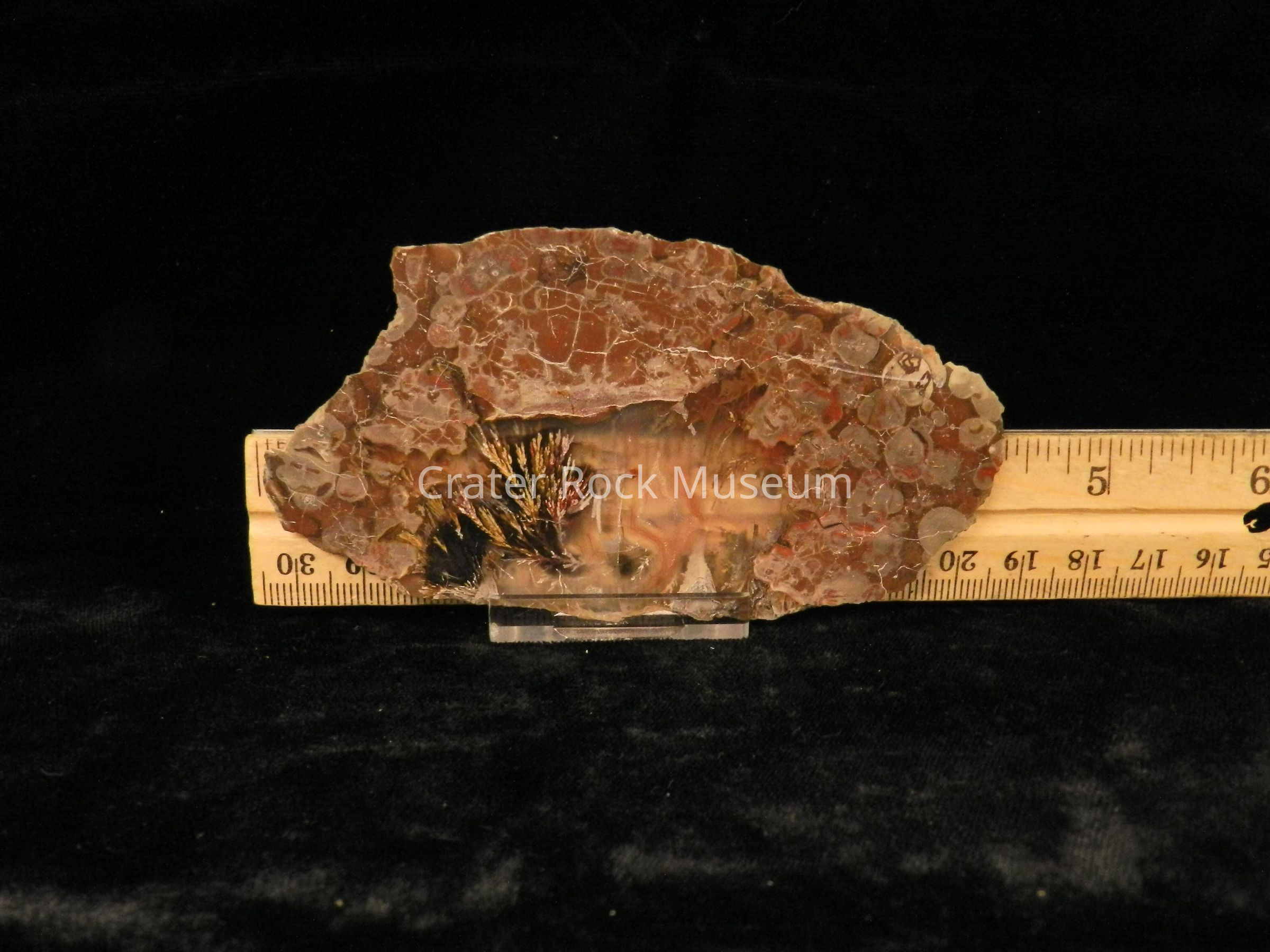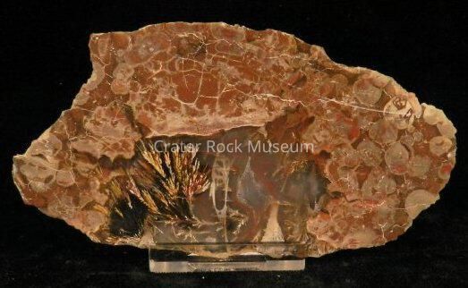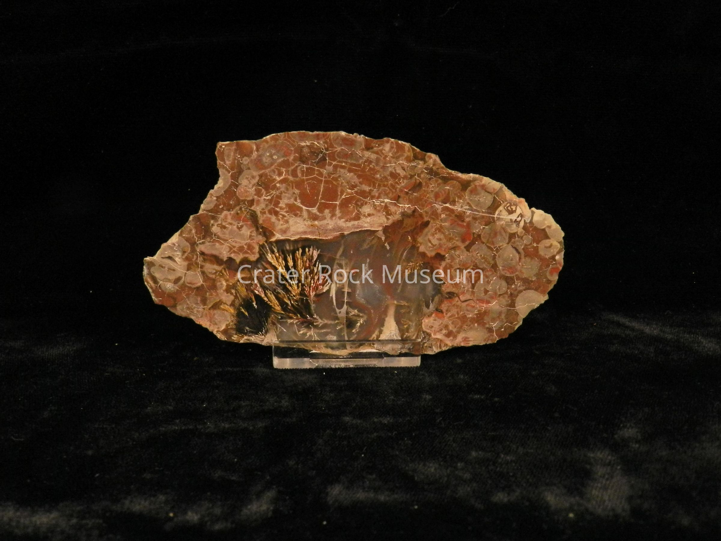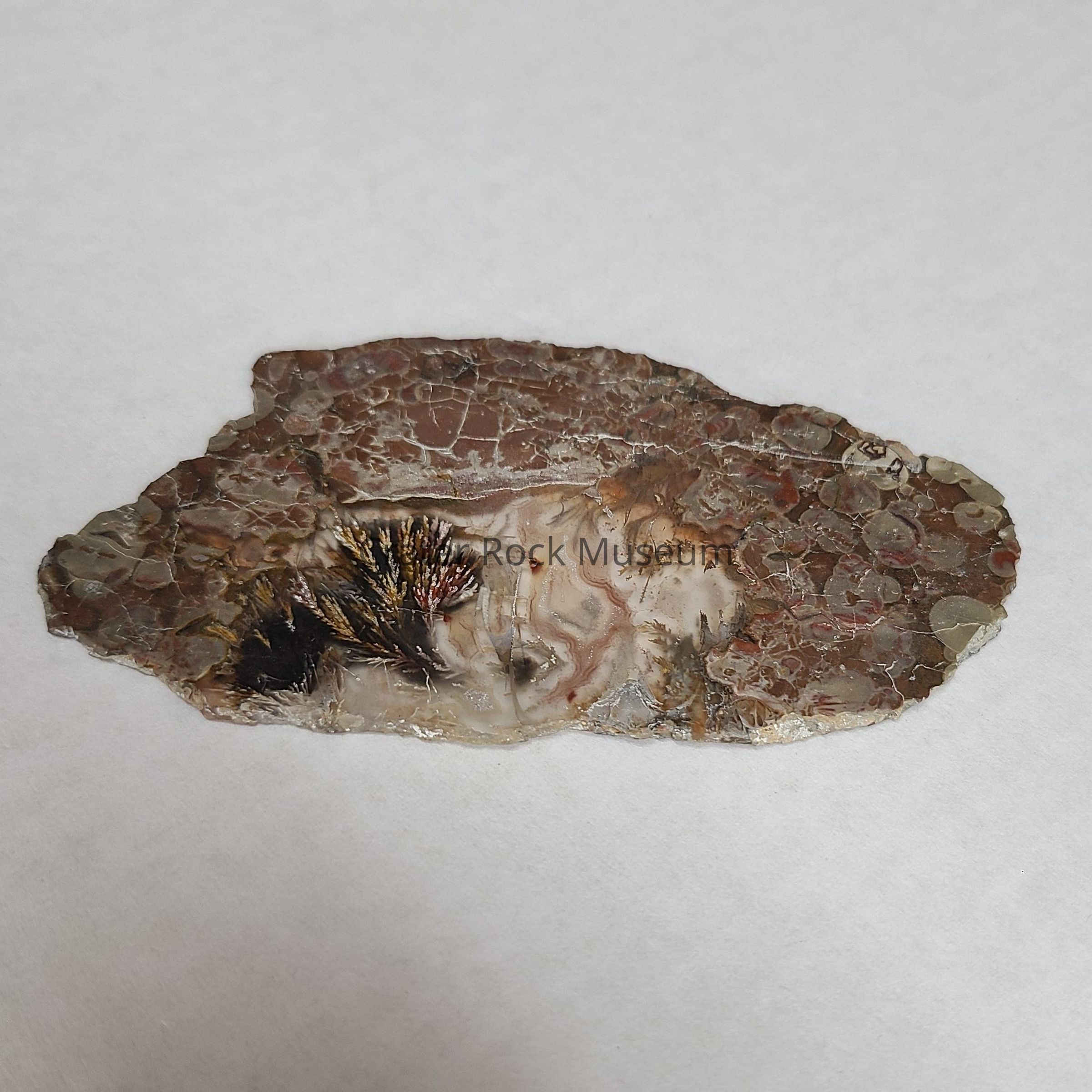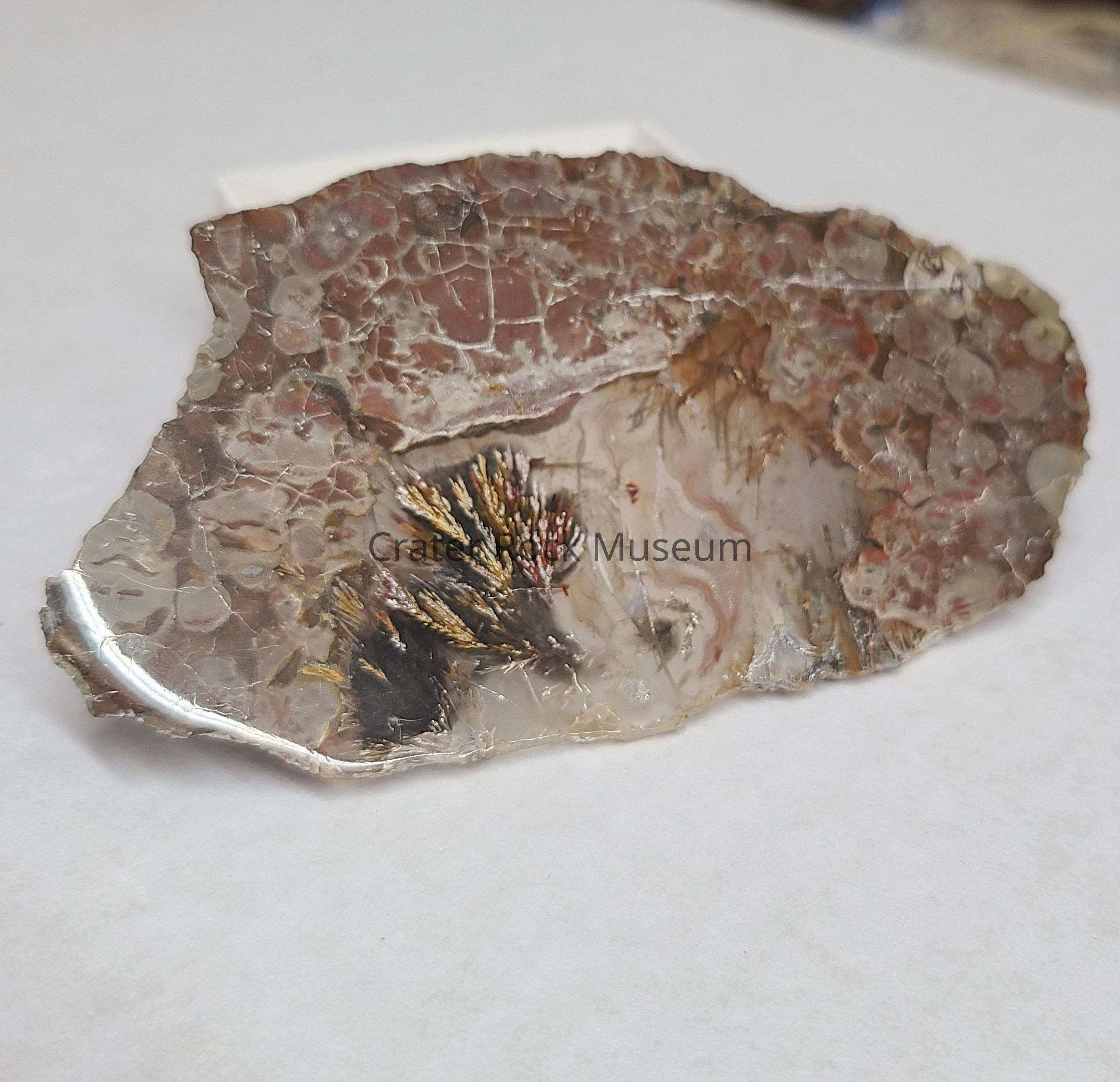Description: Very thin slice with polished face. Conglomerate of reddish-brown and olive green on outer regions with transparent center of creamy white and tan with a small plume of yellow and black.Collection