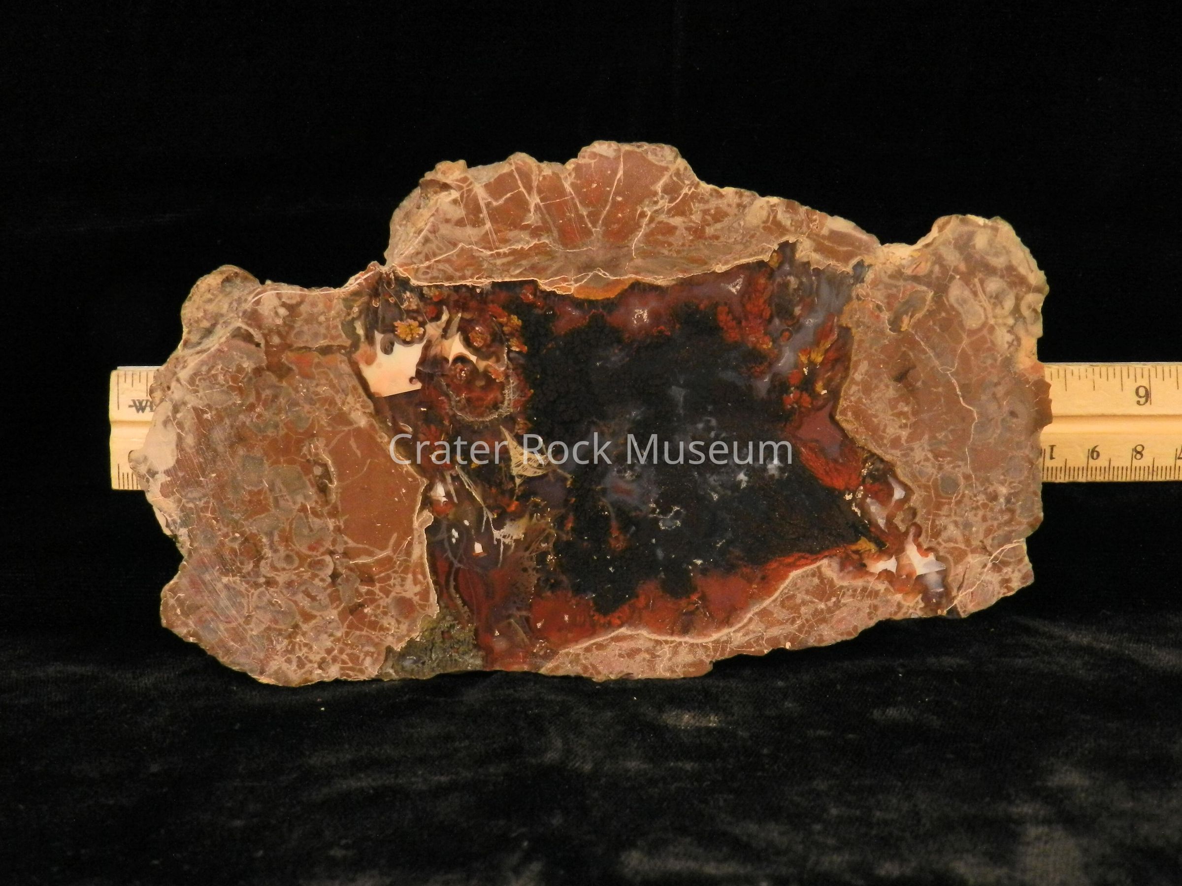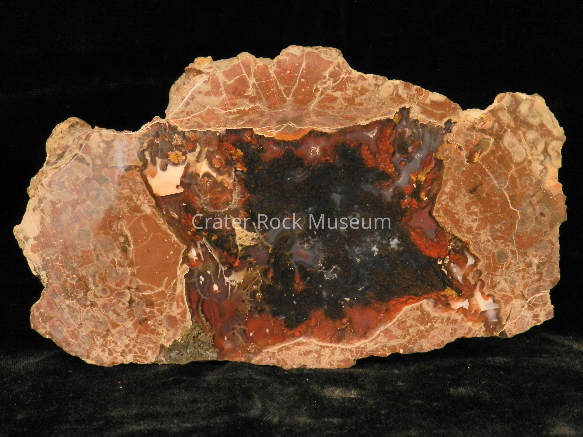 Description: Large, rough, and rounded back with polished face. Conglomerate of reddish-brown and gray on outer regions with translucent dark reds and black with some blue-gray and one small spot of beige. (Plumes are dark red)