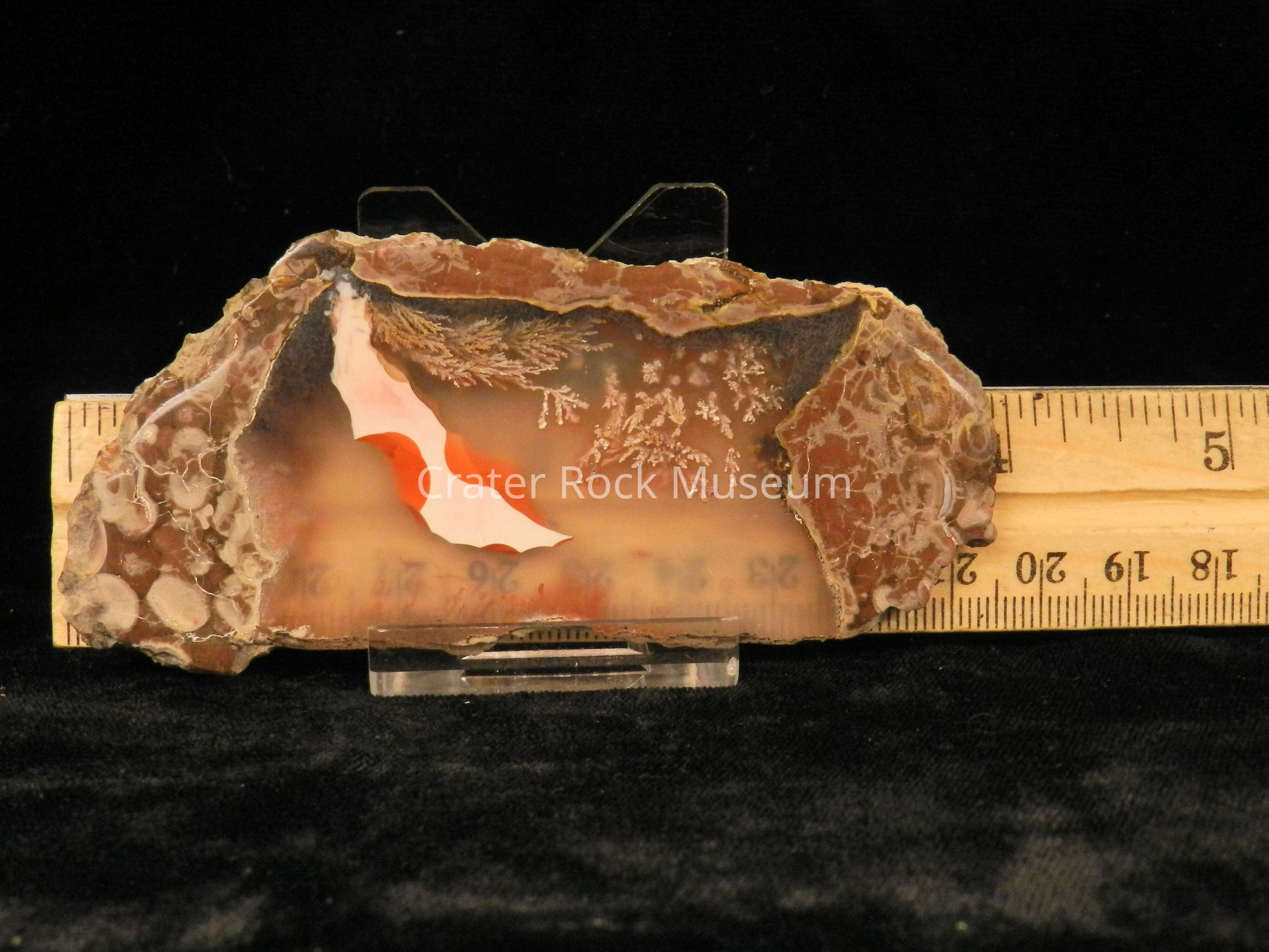 Description: Thin slice with polished face. Outer regions are reddish-brown and gray with some orbicular structures. The inner area is transparent smokey brown and white with a red and white elongated spot. The plumes are small.