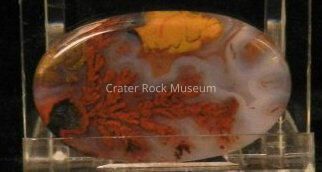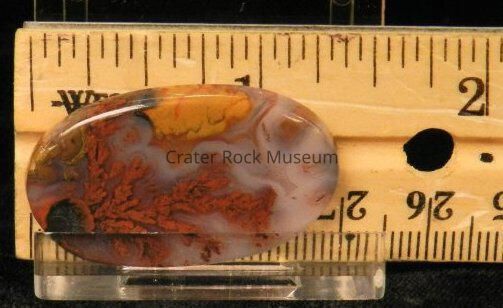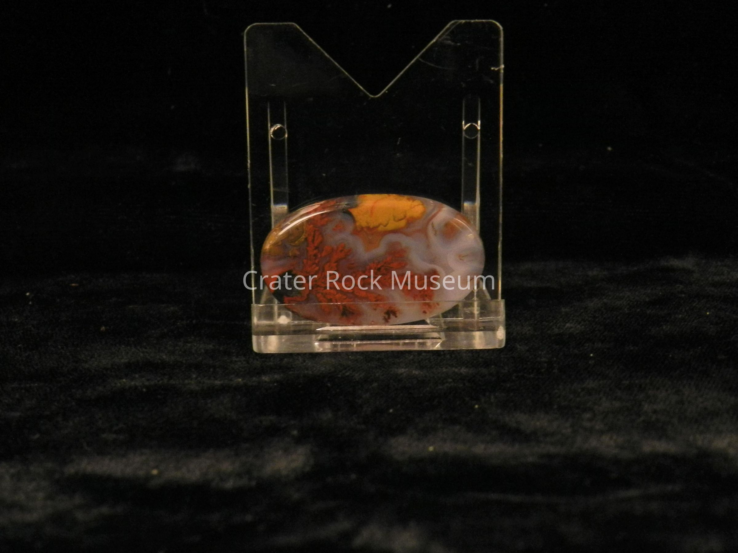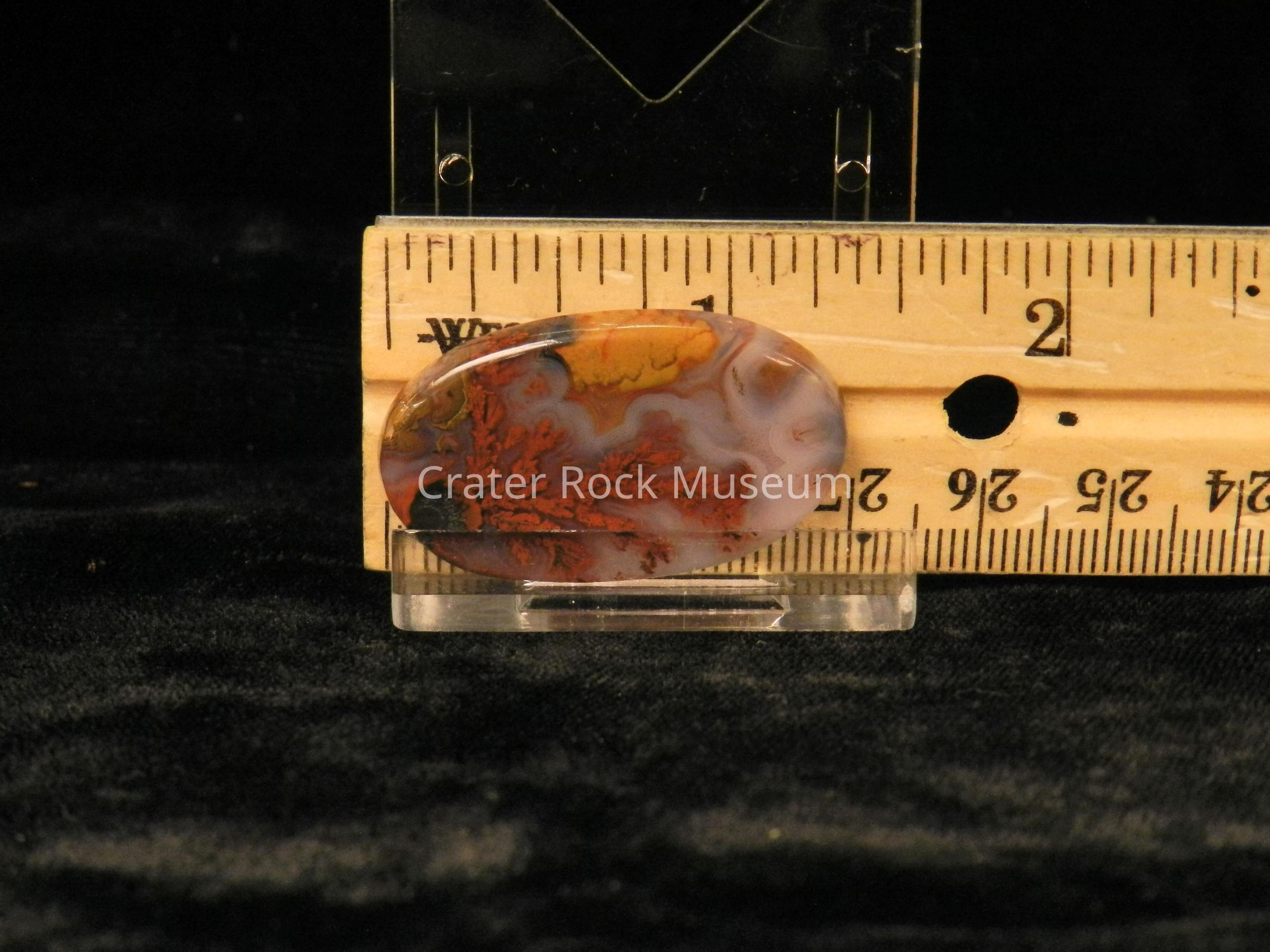 Description: Small oval with polished face. Translucent creamy white with one spot of dull yellow. Plume is dark red.