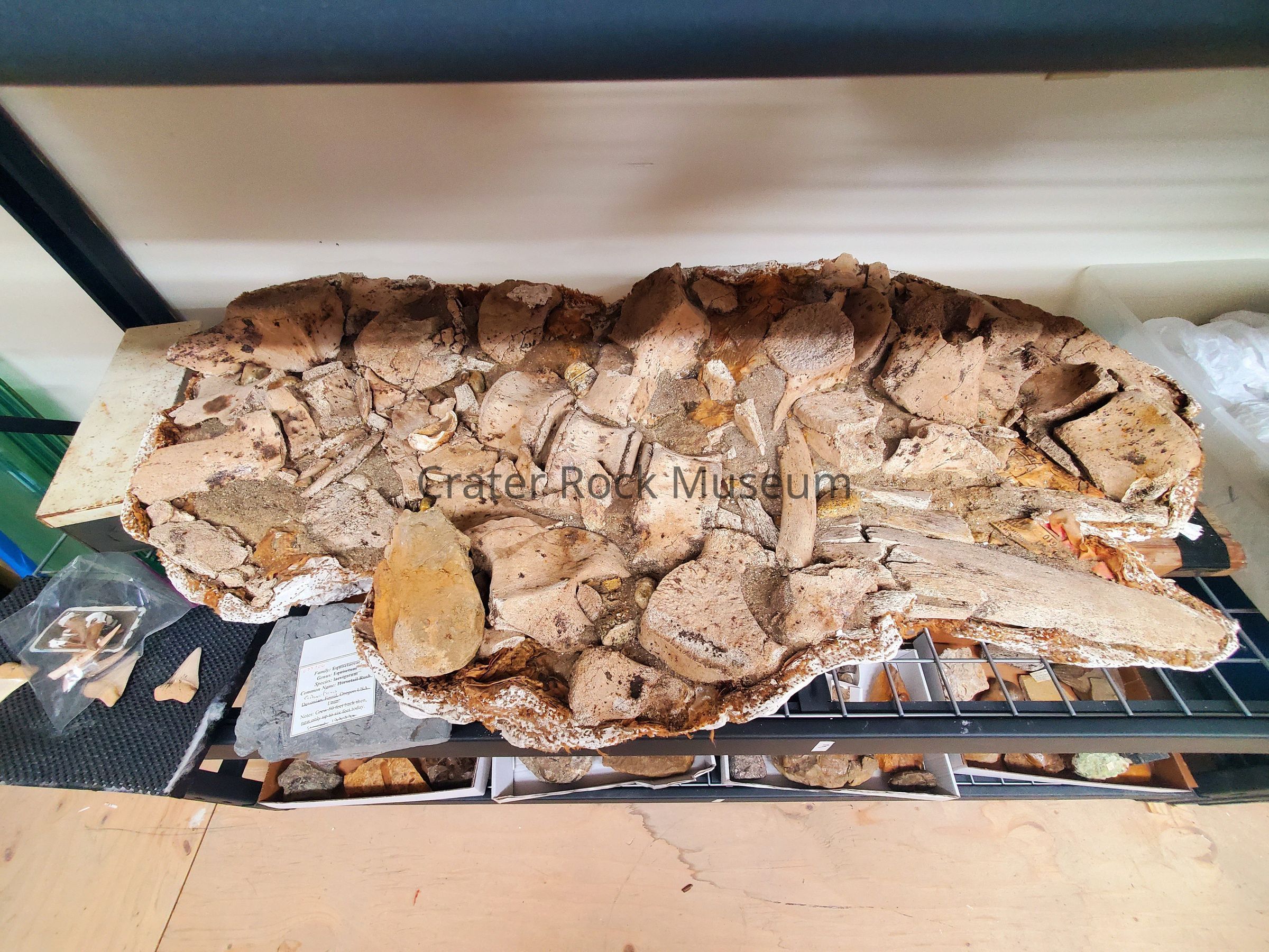 Plaster bonded plate of mineralized whale vertebrae and shark teeth. Possibly from a shark feeding.