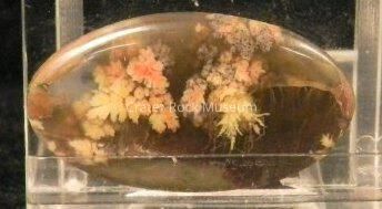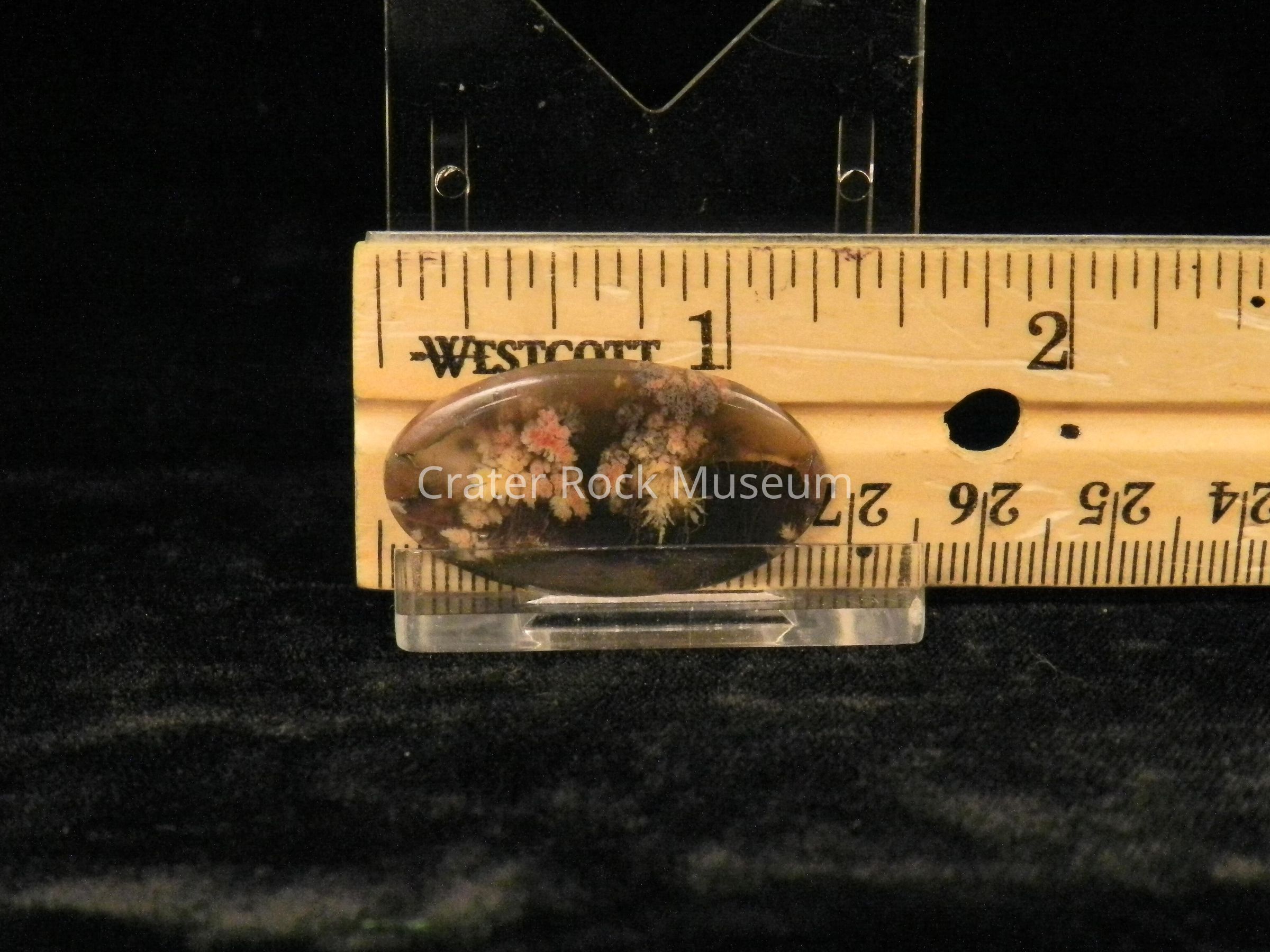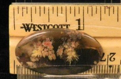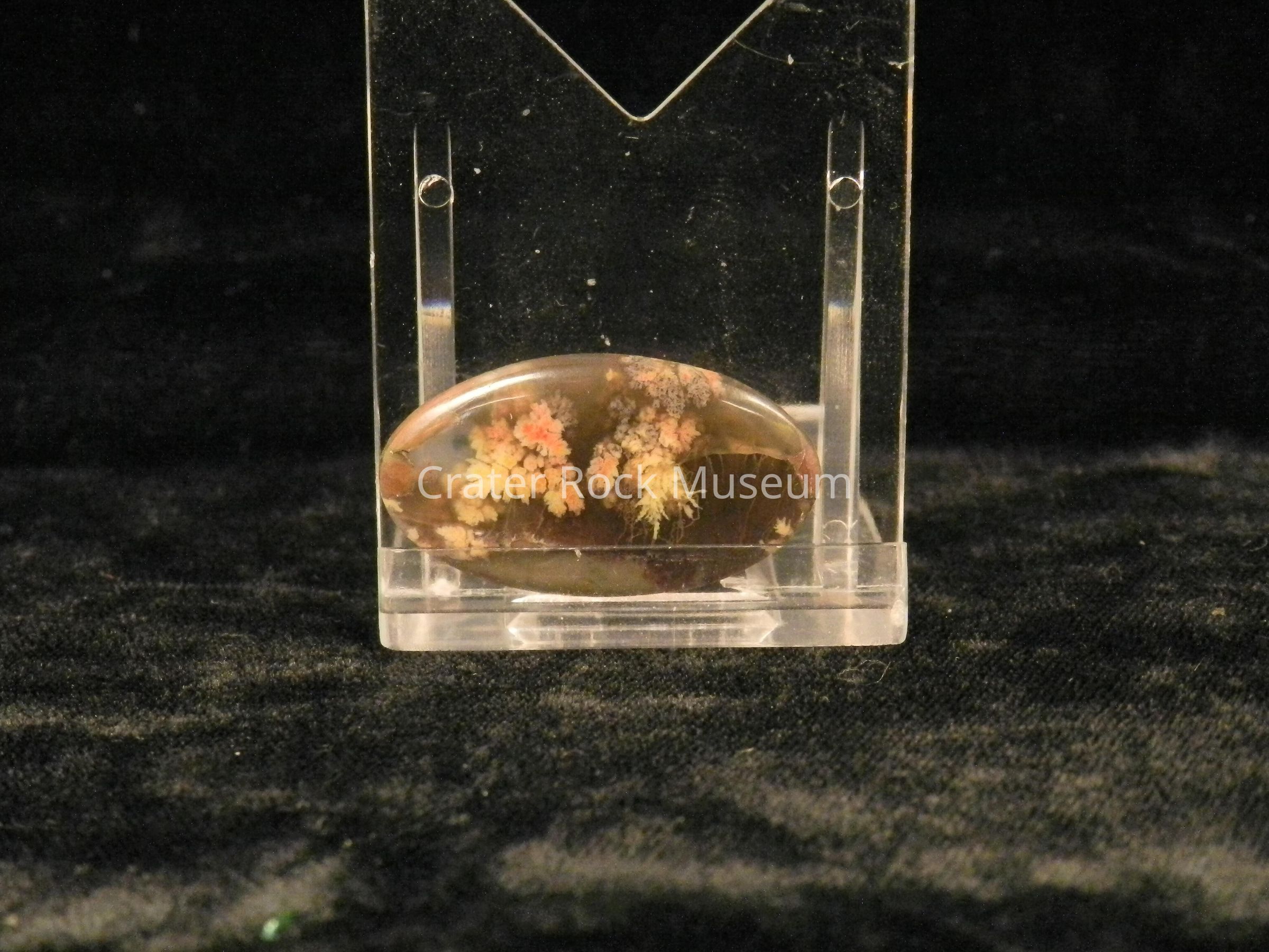 Description: Small elongated oval with convex polished face. Translucent brown with gray and brown semi-opaque areas with tan and pink plume towards center.