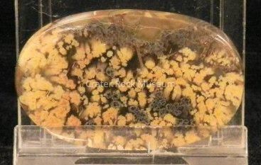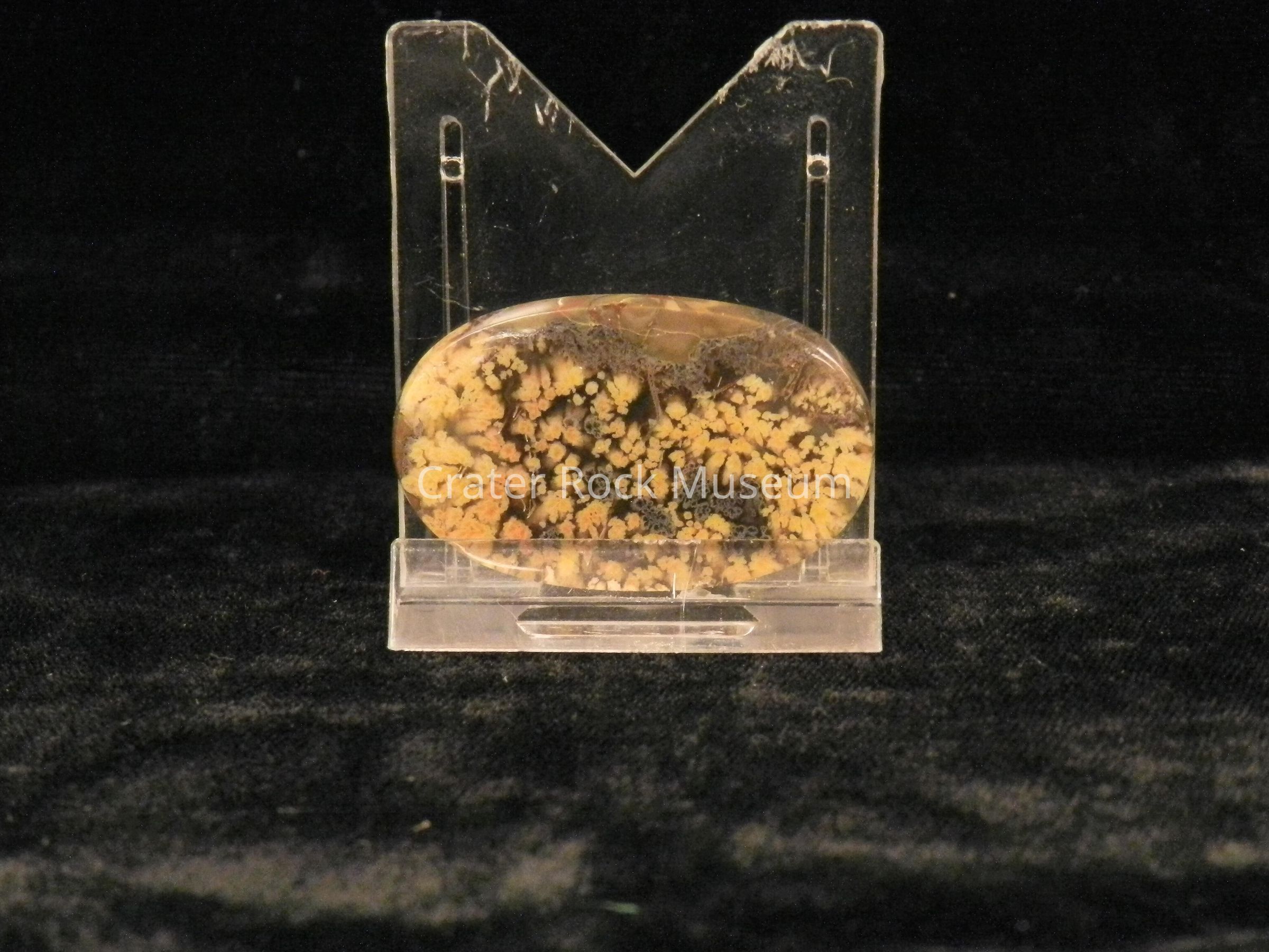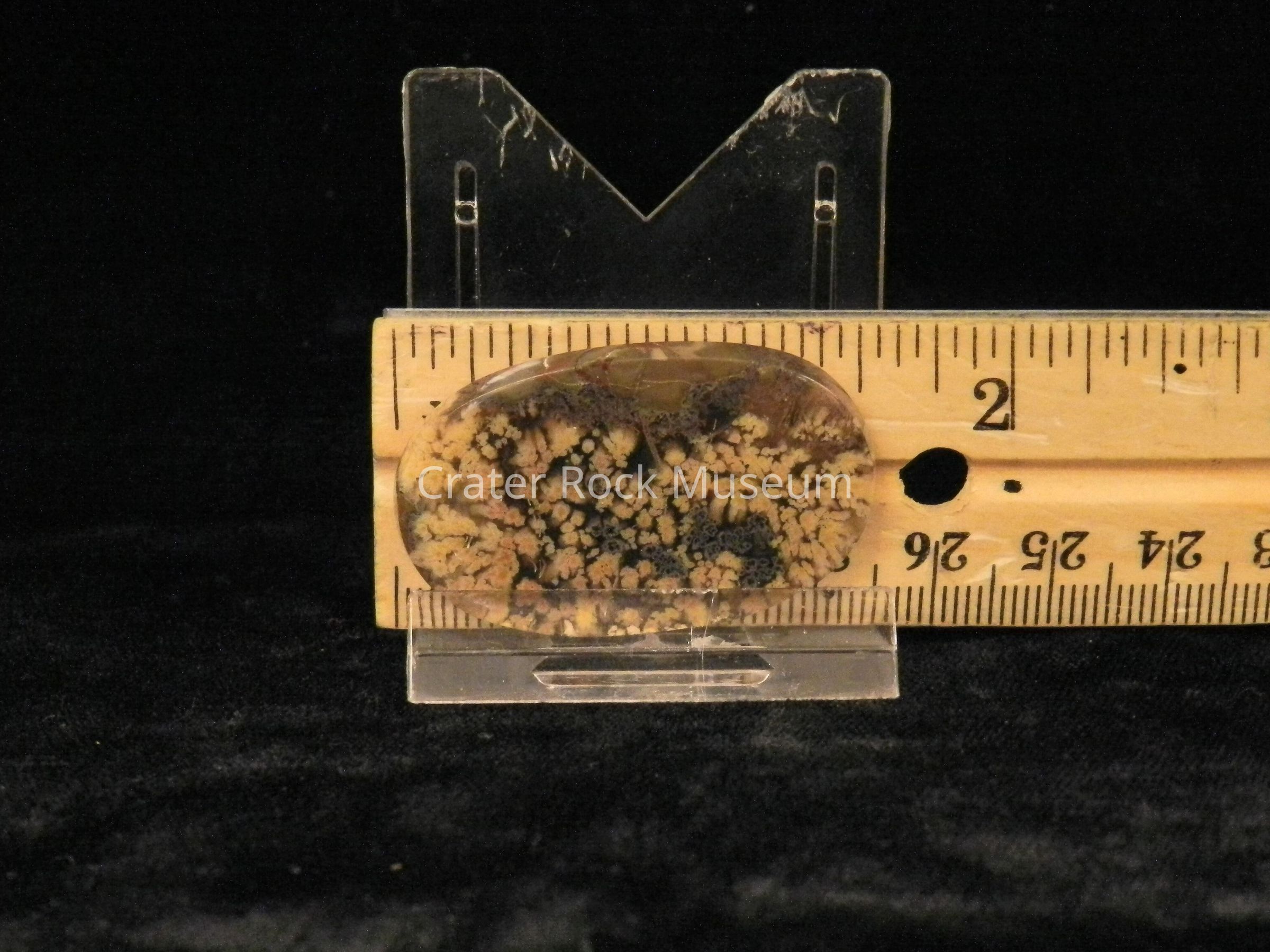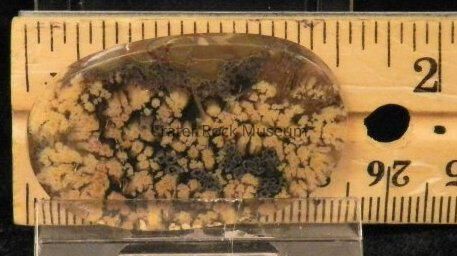 Description: Wide oval with convex polished face. Translucent brown and olive greens with light tan and beige plumes throughout.