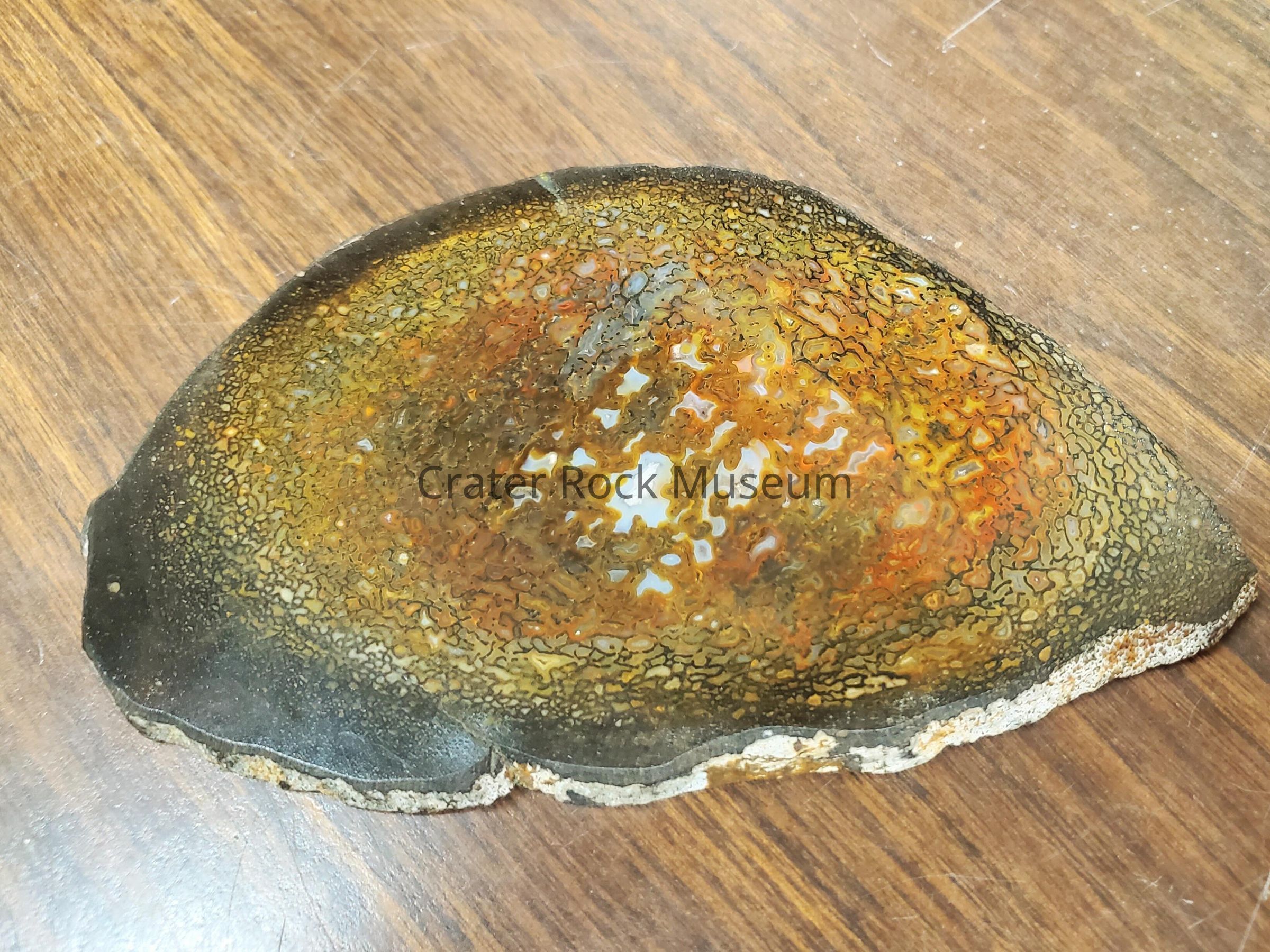 Dinosaur bone slab. Cut and polished. Beautiful colors. Donated by the RAGMS workshop.Location