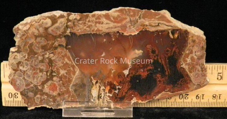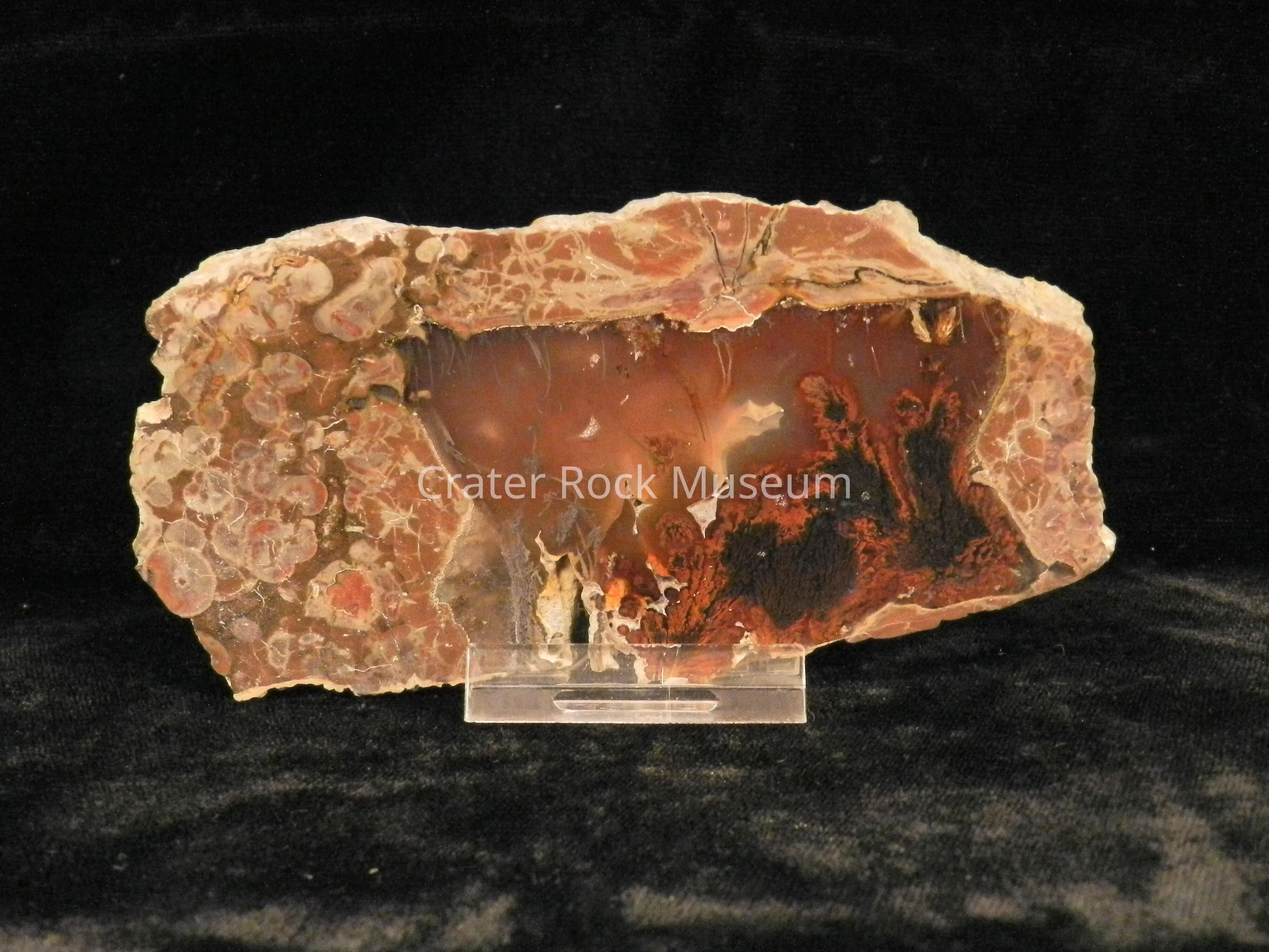 Description: Semi-rectangular thin slab (slightly beveled) with polished face. Outer regions are a conglomerate of reddish-brown, olive green and gray with a transparent orange and dark red center area with black and red plumes.