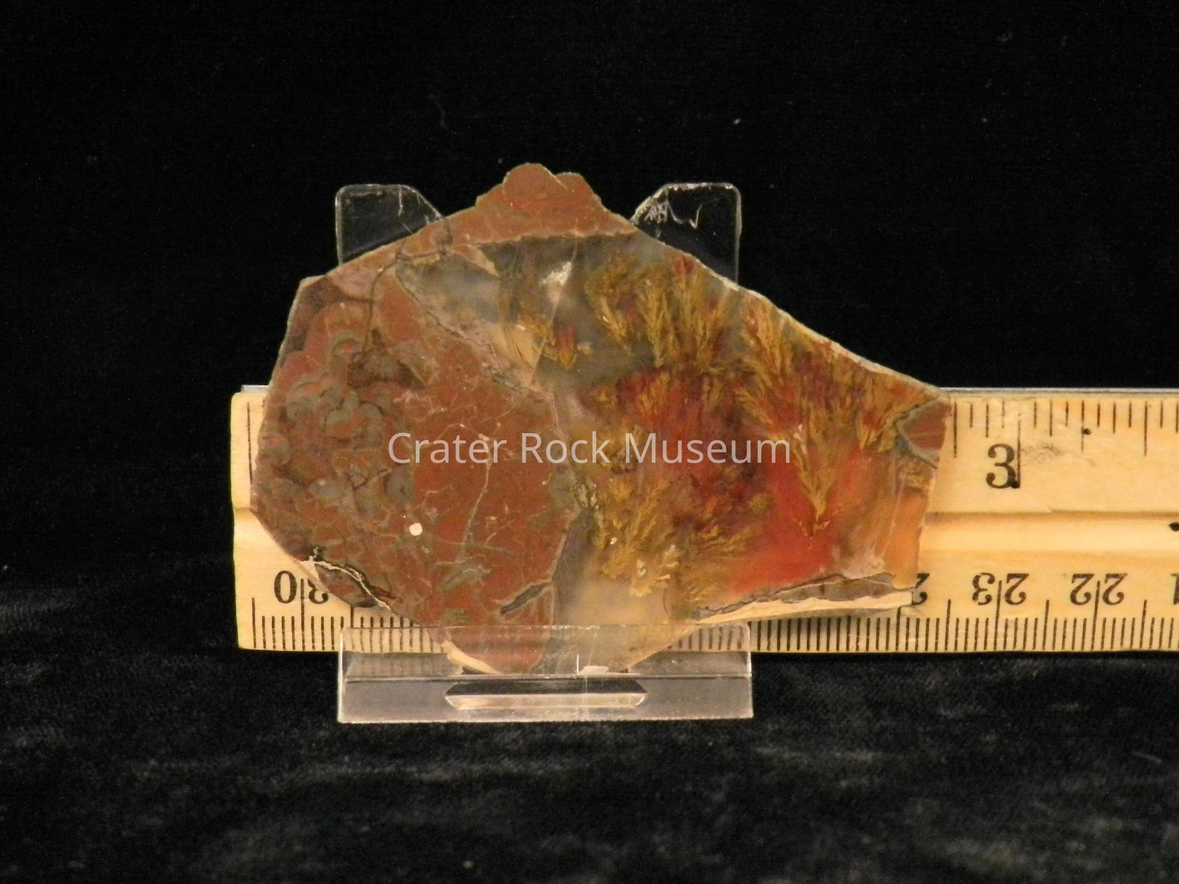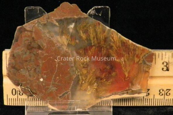 Description: Thin slice with polished face. Transparent creamy white with reddish-brown and dull yellow and orange.