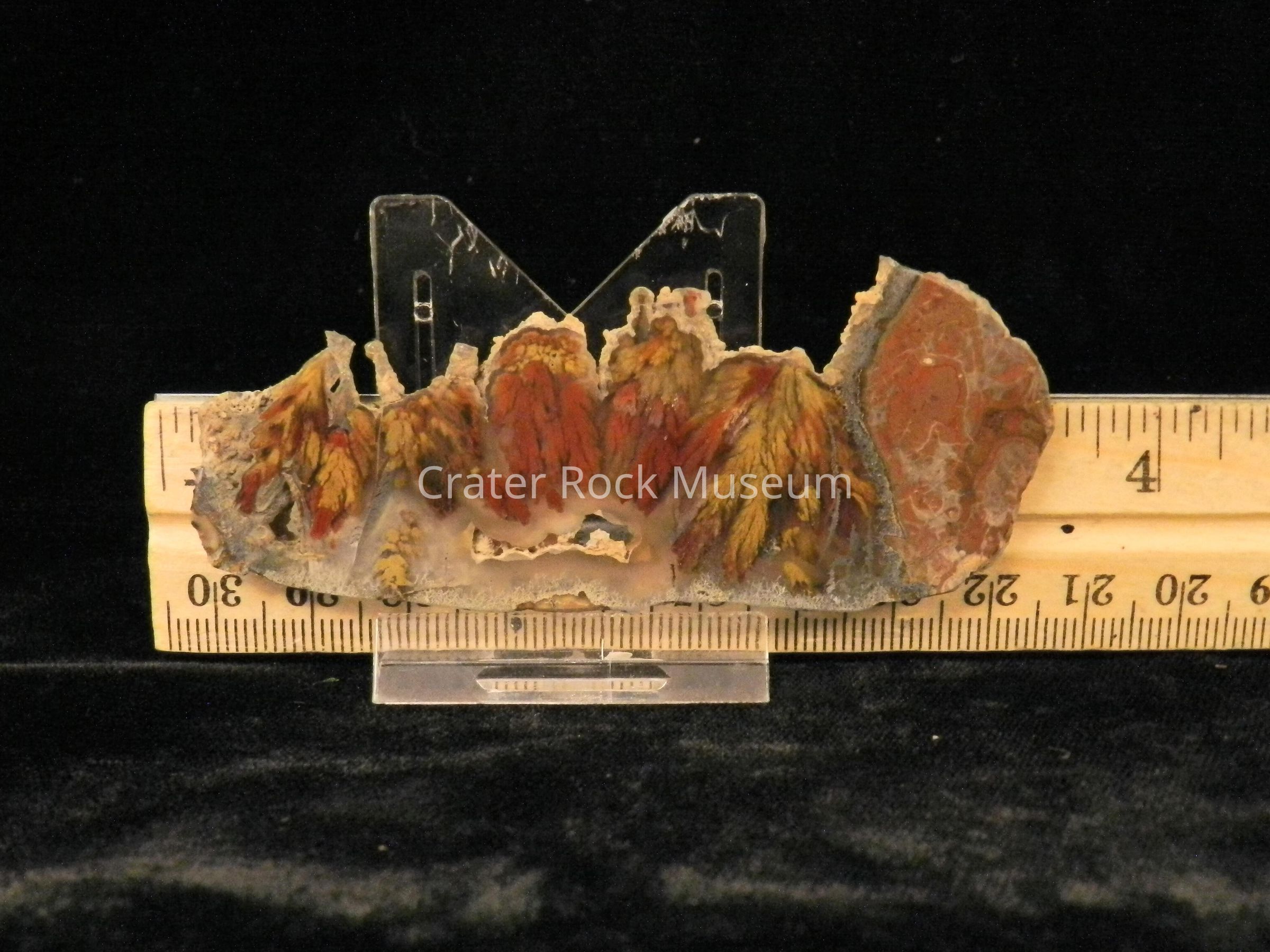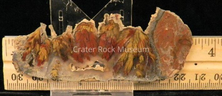 Description: Thin slice with polished face. Transparent smokey gray with some areas of red and plumes of gold.