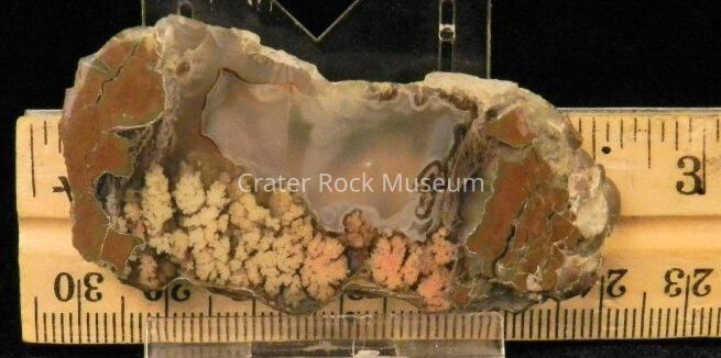 Description: Thin slab with polished face.Transparent area in center with reddish-brown outer areas and dull yellow and pink plumes.