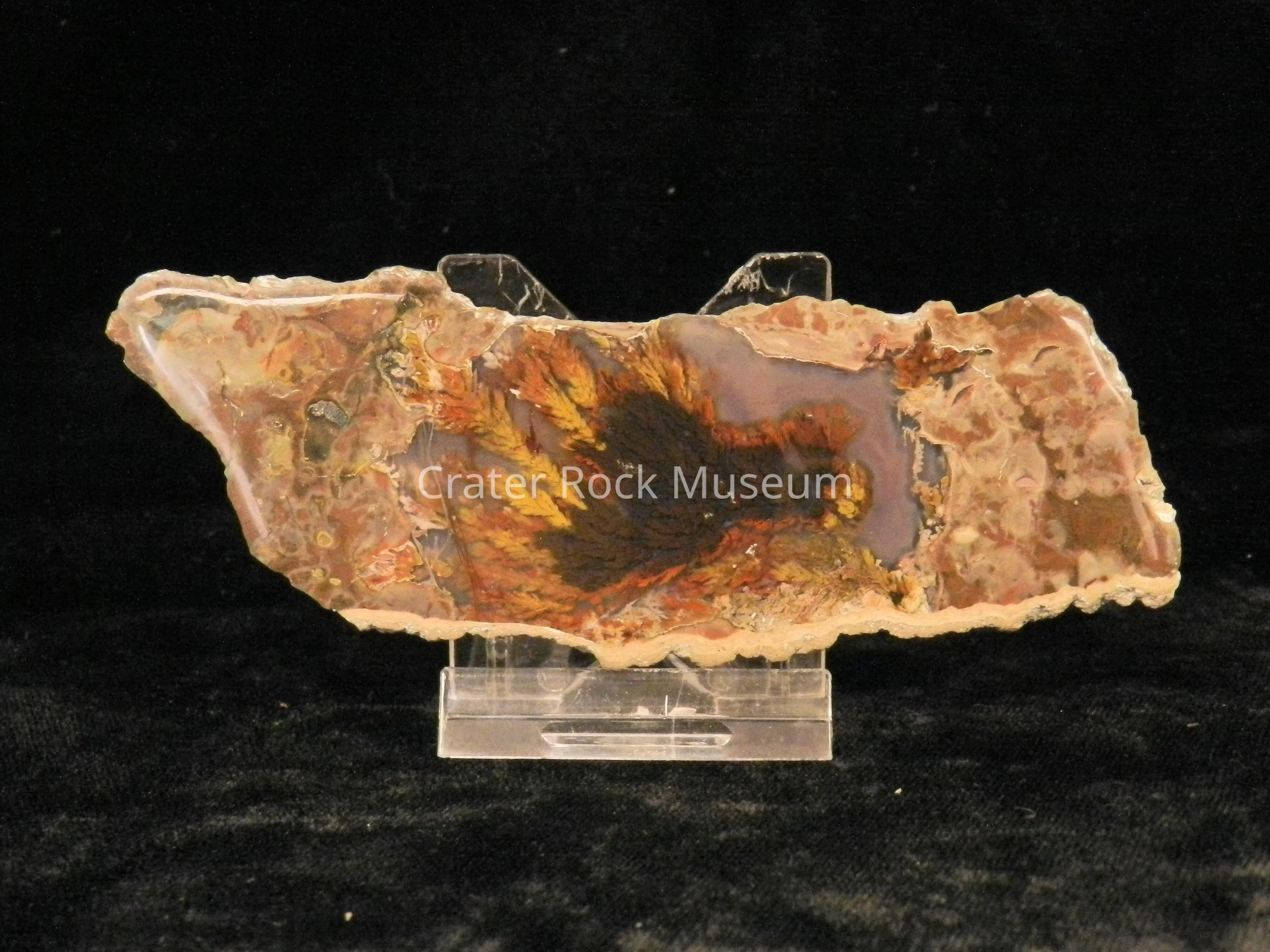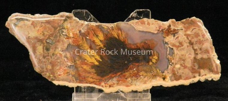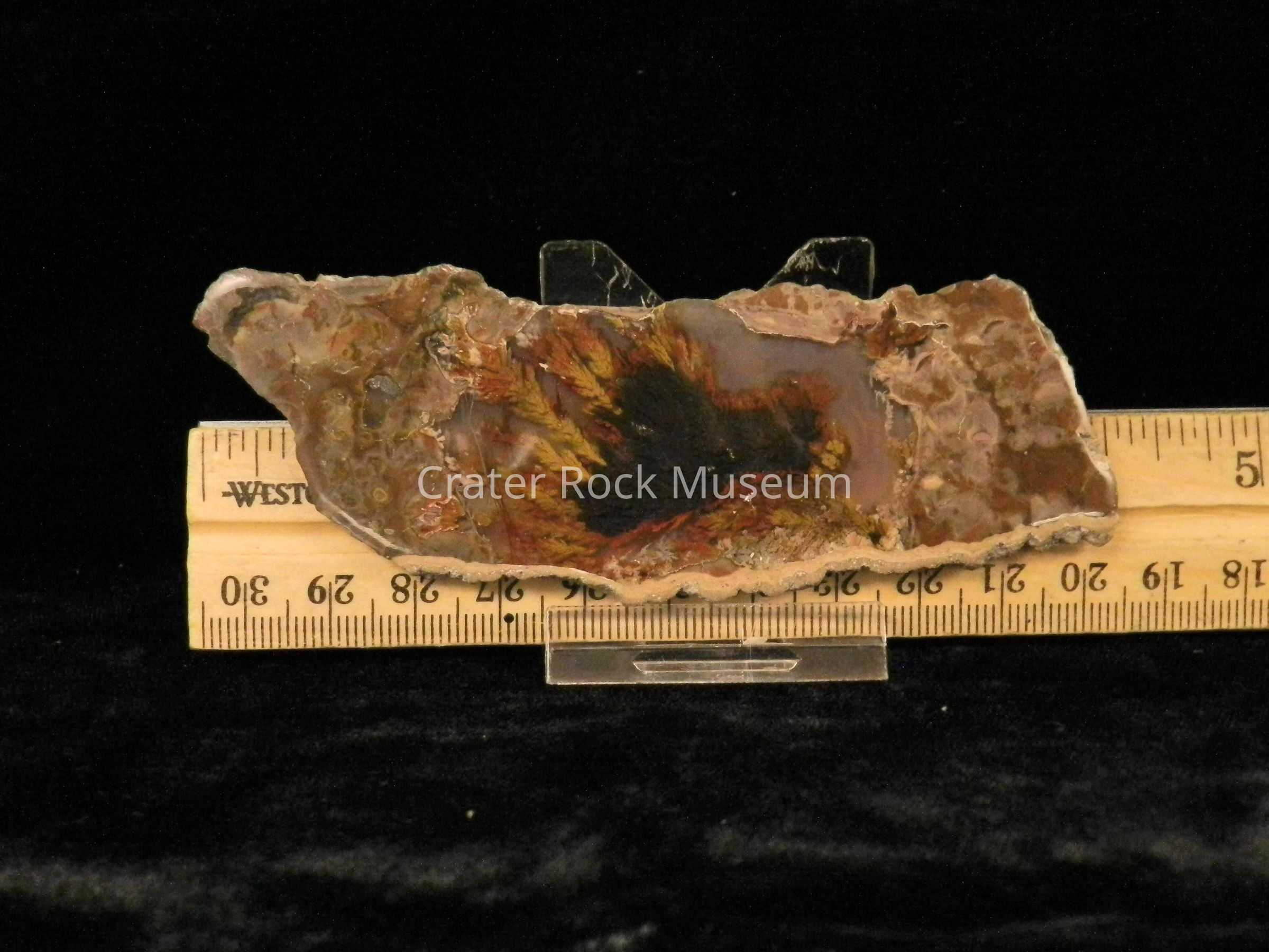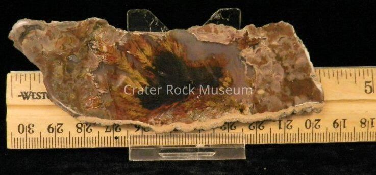 Description: Thin slab with polished face.Transparent pink in center with black spot and gold plumes. Outer regions are a conglomerate of reddish-brown and beiges.