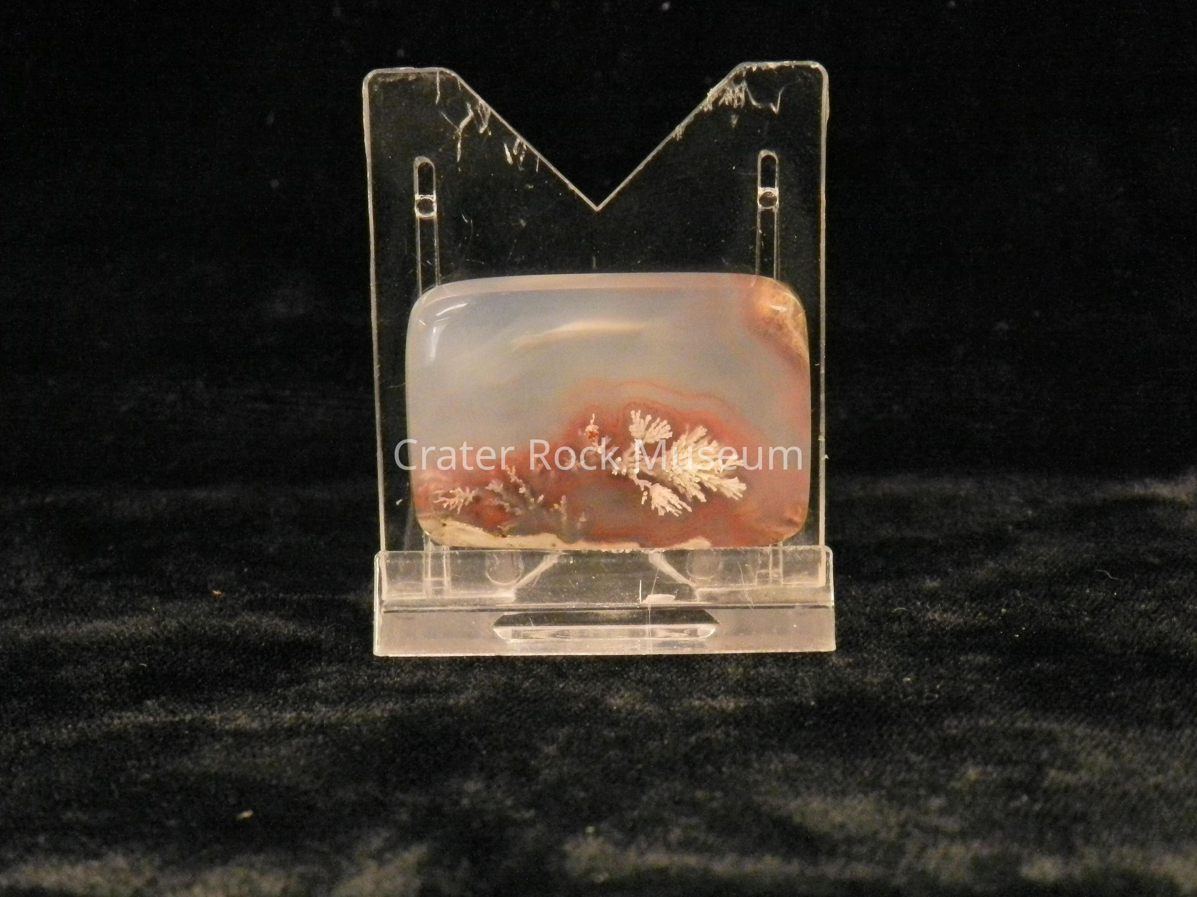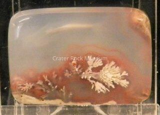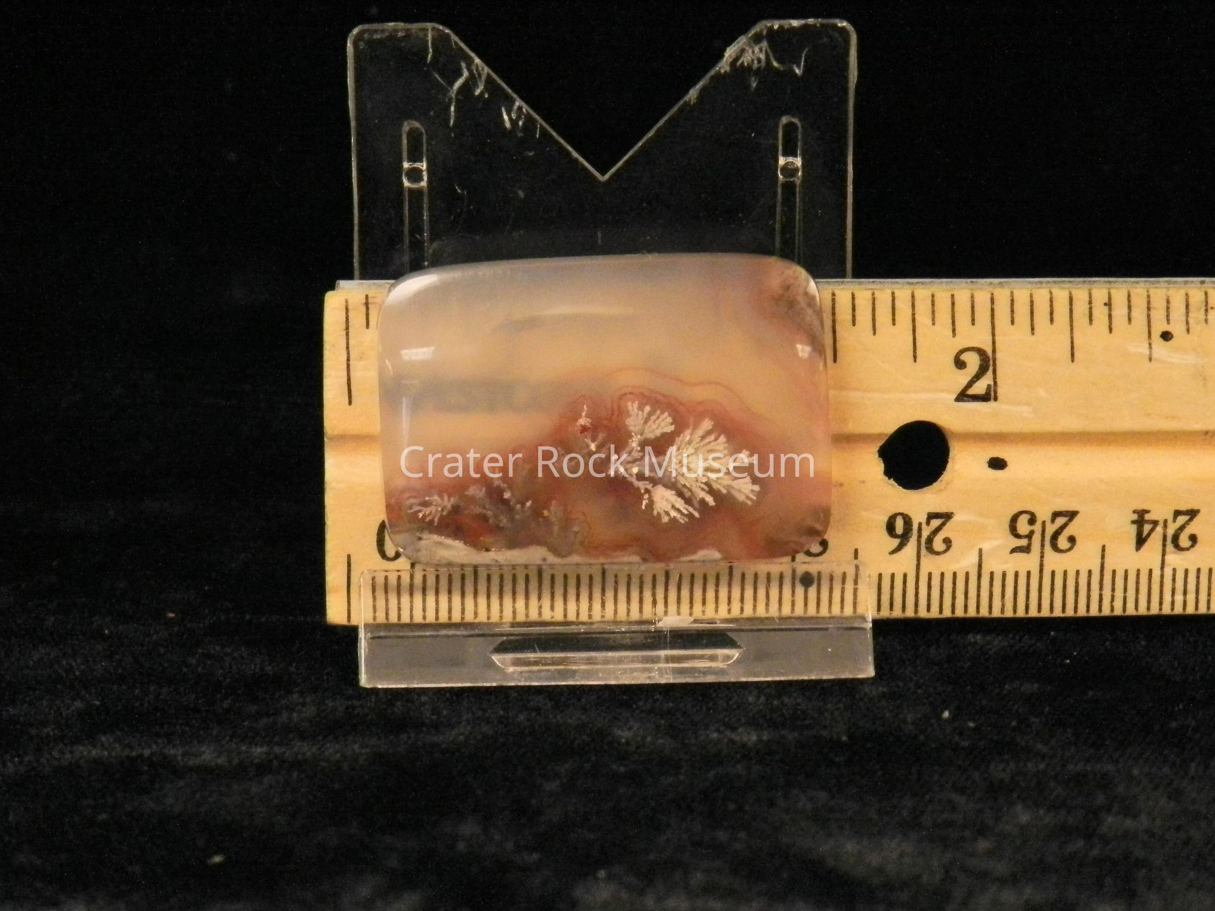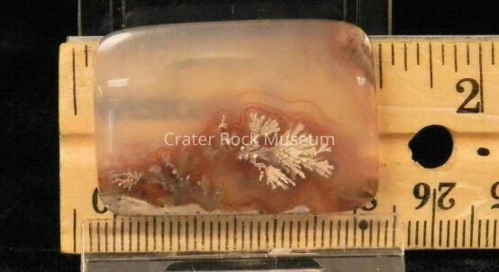 Description: Thin rectangular, with polished convex face. Transparent creamy white with light brown and white plumes in one area.
