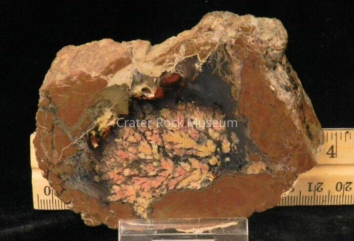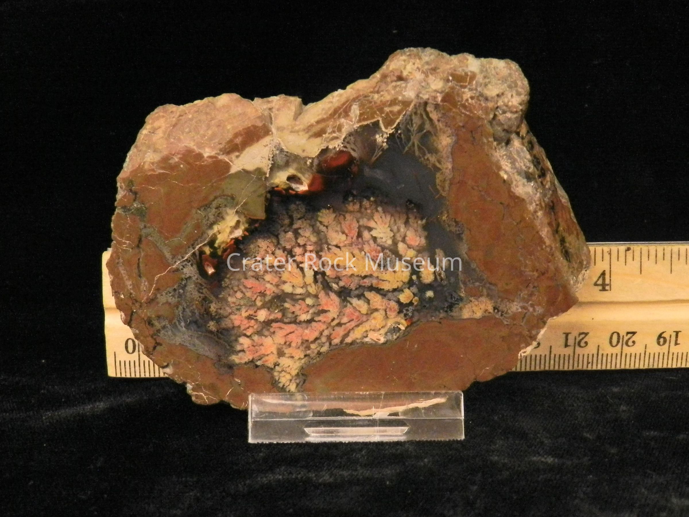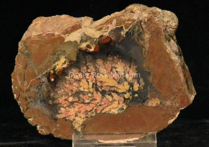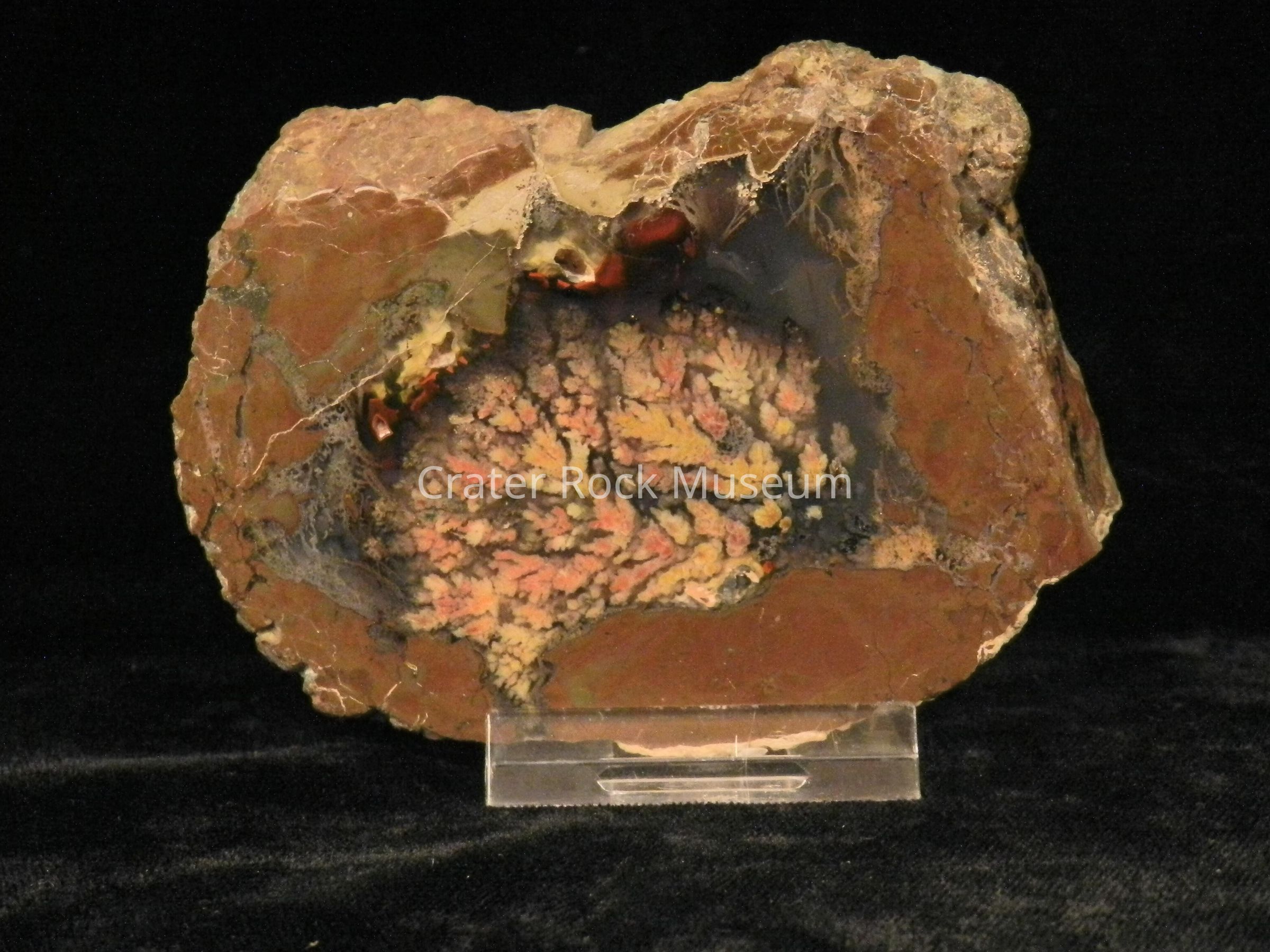 Description: Rough, convex back with polished face. Reddish-brown outer regions with transparent black, dark gray,tan, gold and pink plumes.