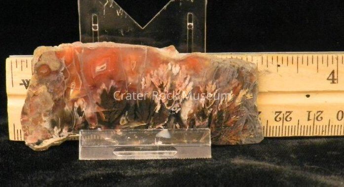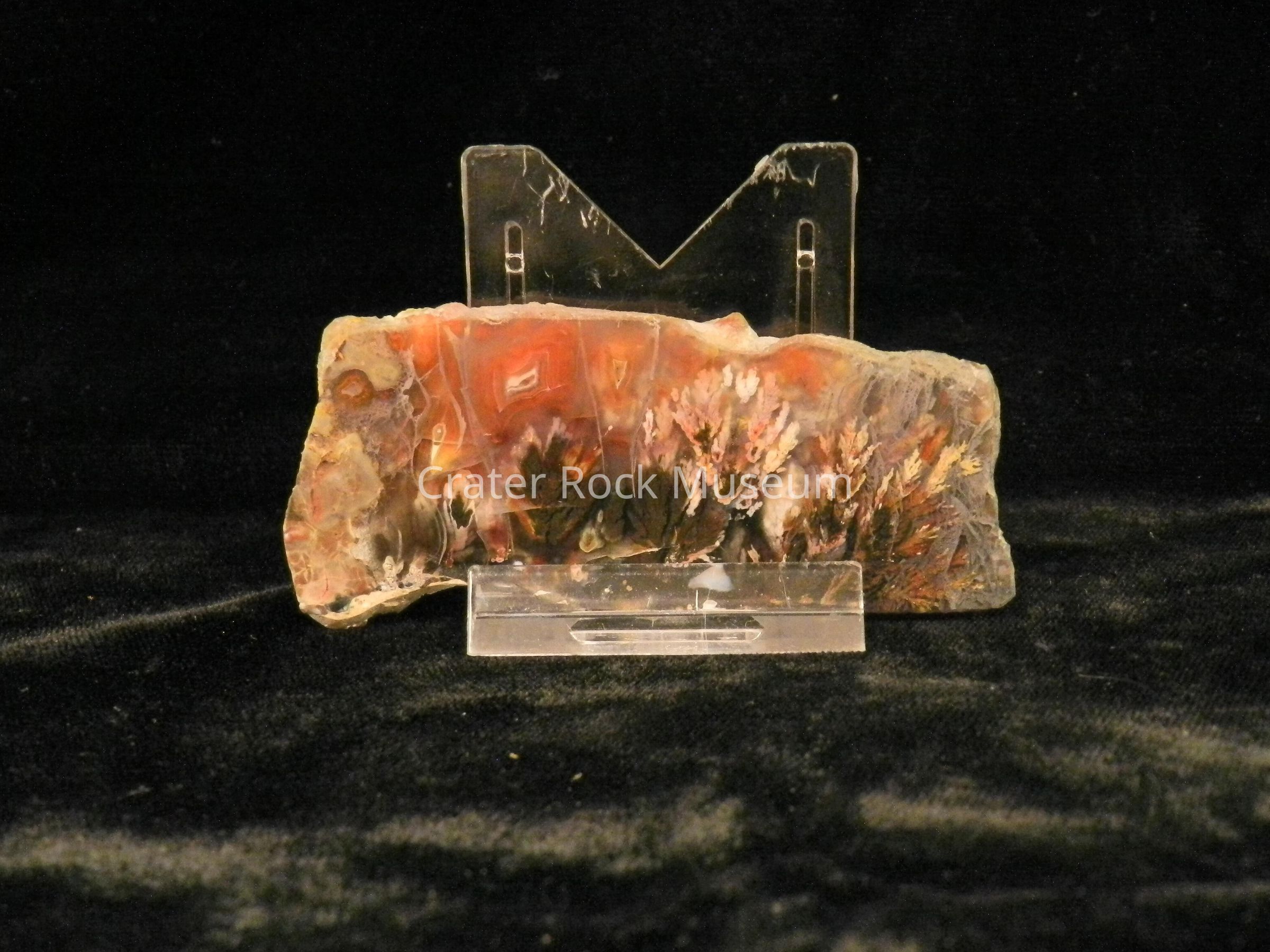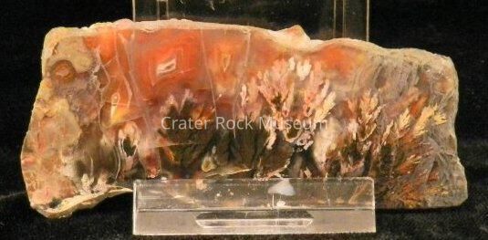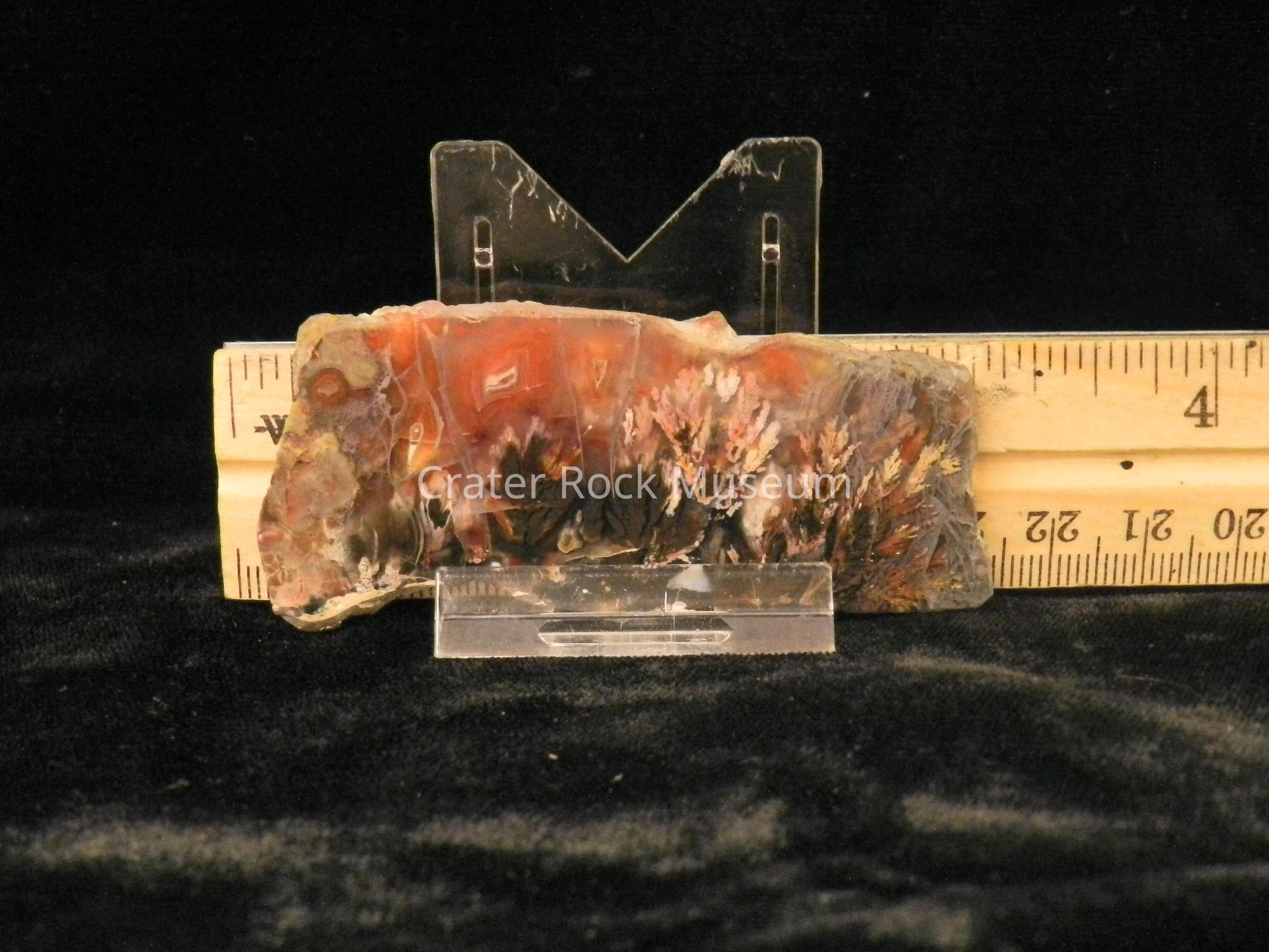 Description: Semi-rectangular thin slice with polished face. Transparent black, red, green, and beige throughout. White to yellow plumes.
