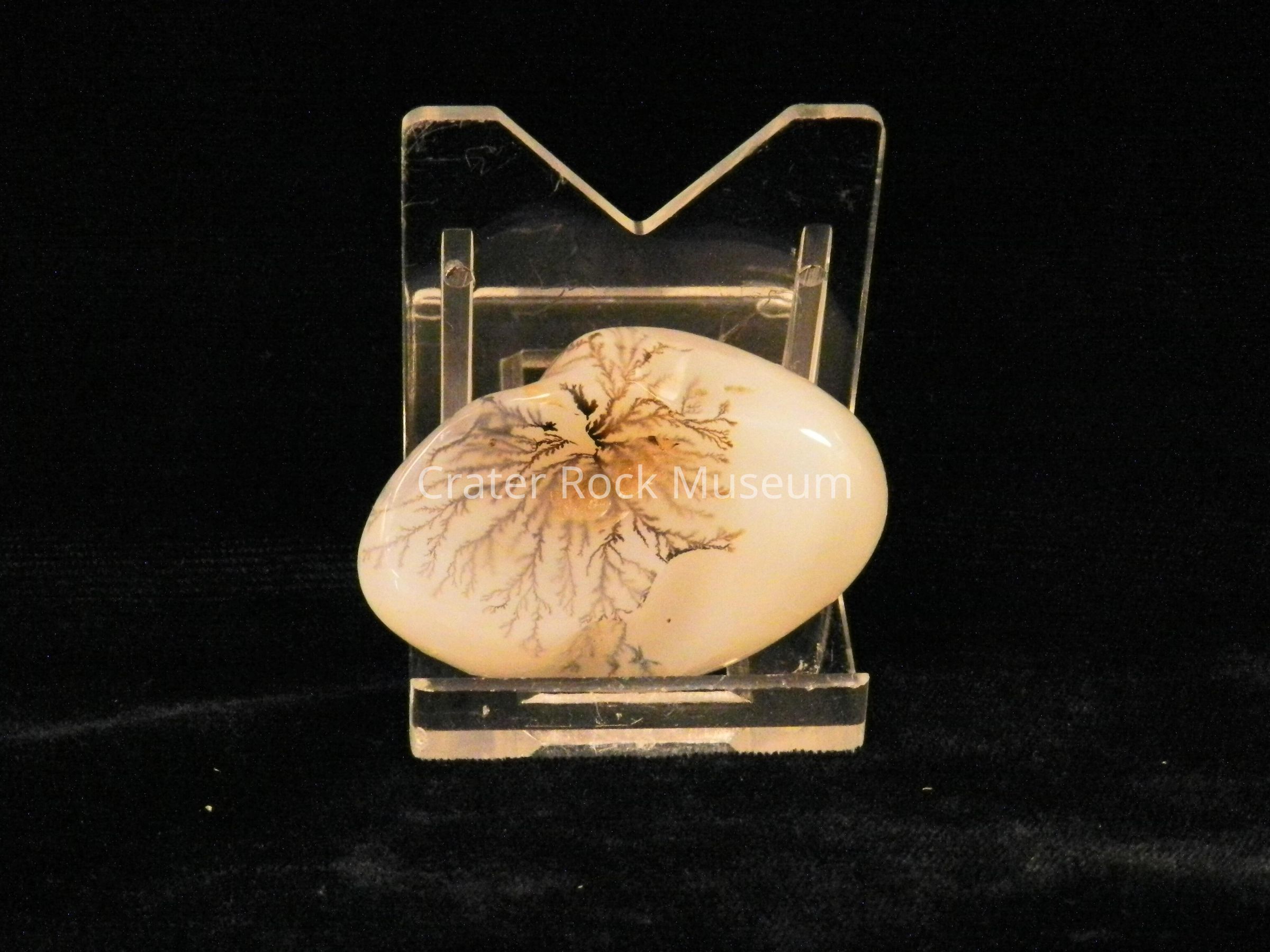 Description: Rounded, with depressions, polished throughout and a translucent creamy white, with a very fine, light brown dendritic structure.
