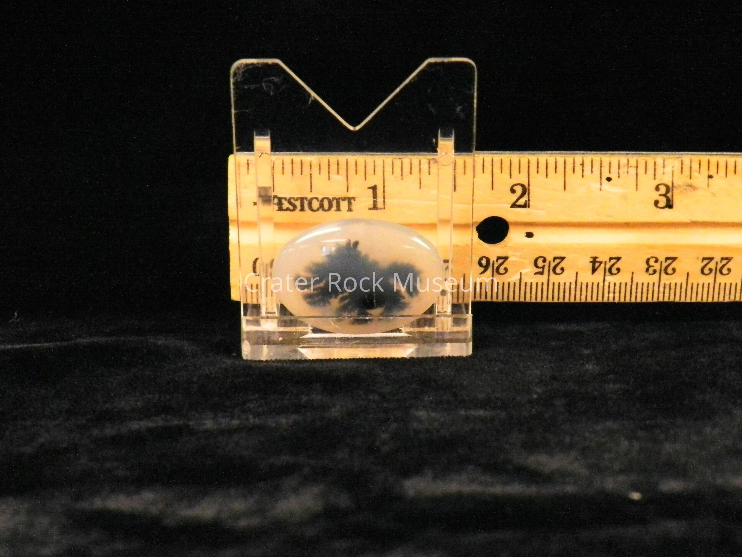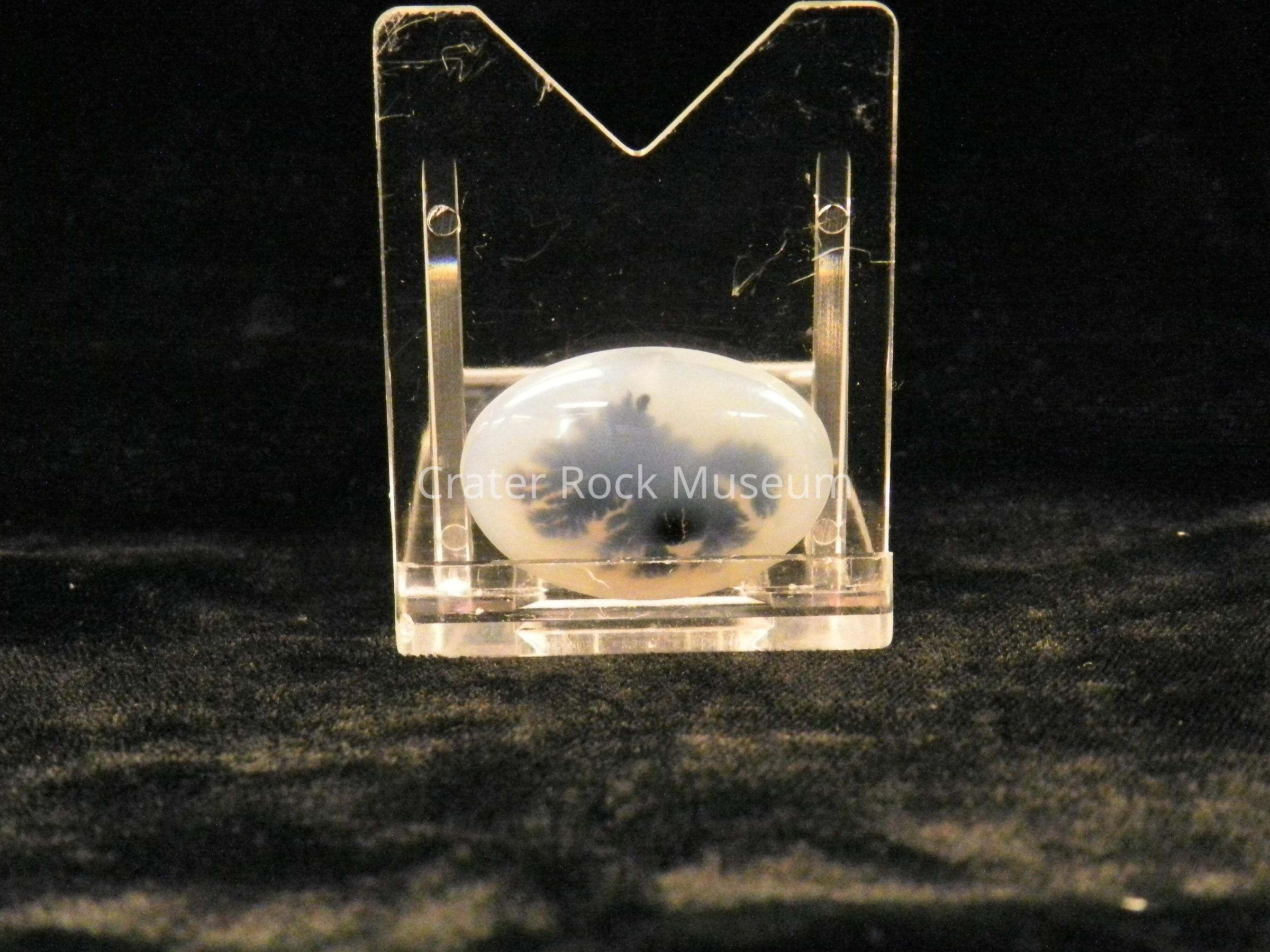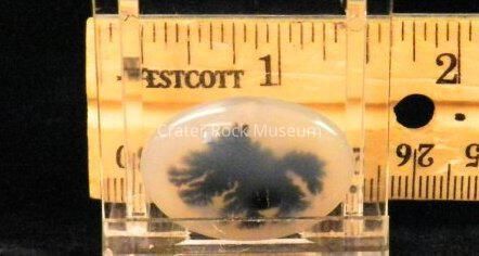 Description: Small oval with convex polished face. Translucent creamy brown and white with one (1) black (hazy) dendritic structure.