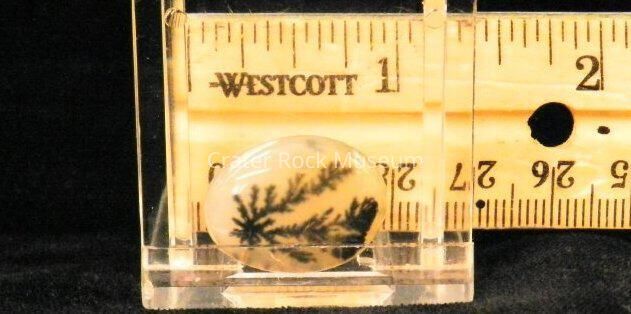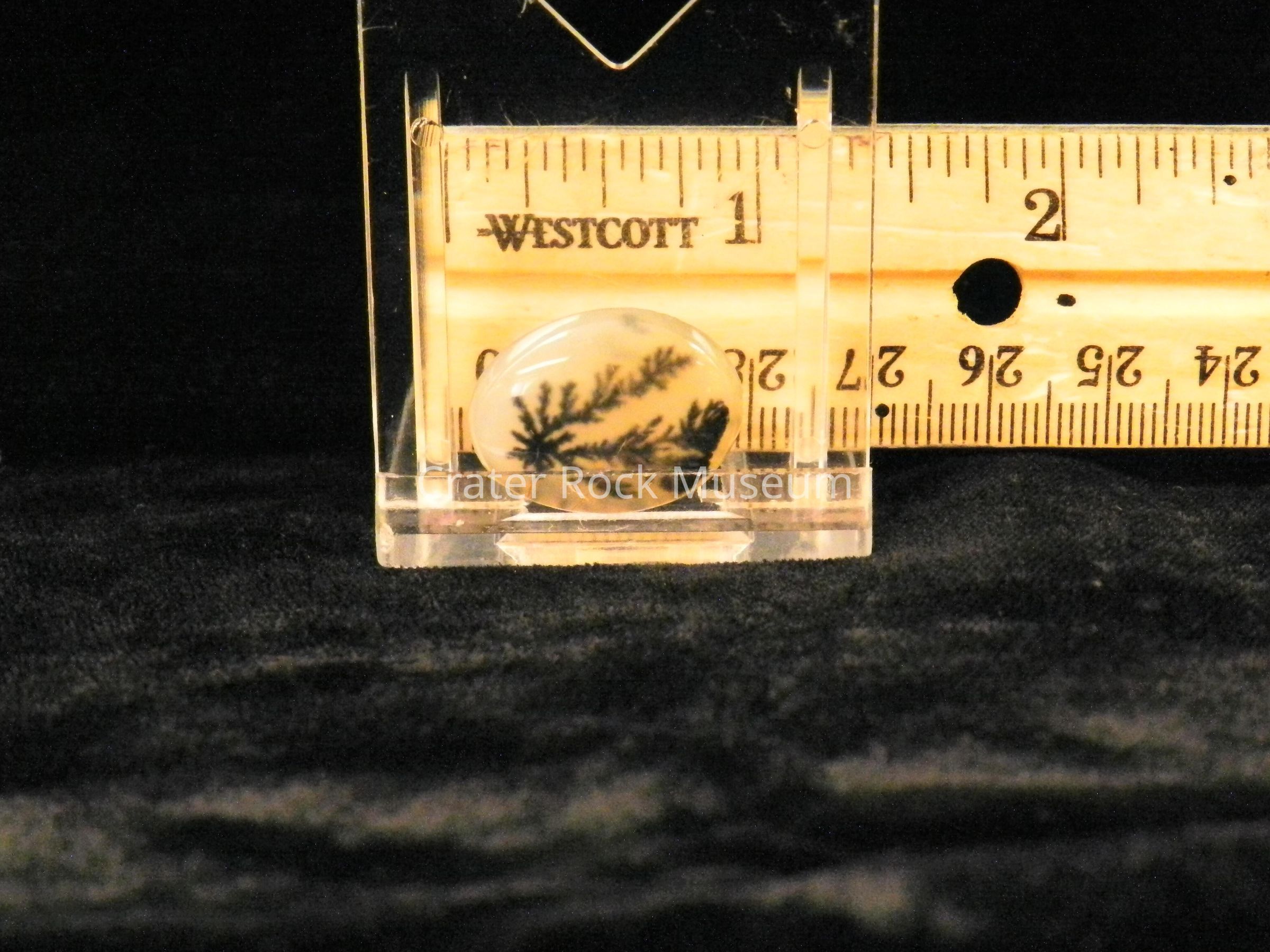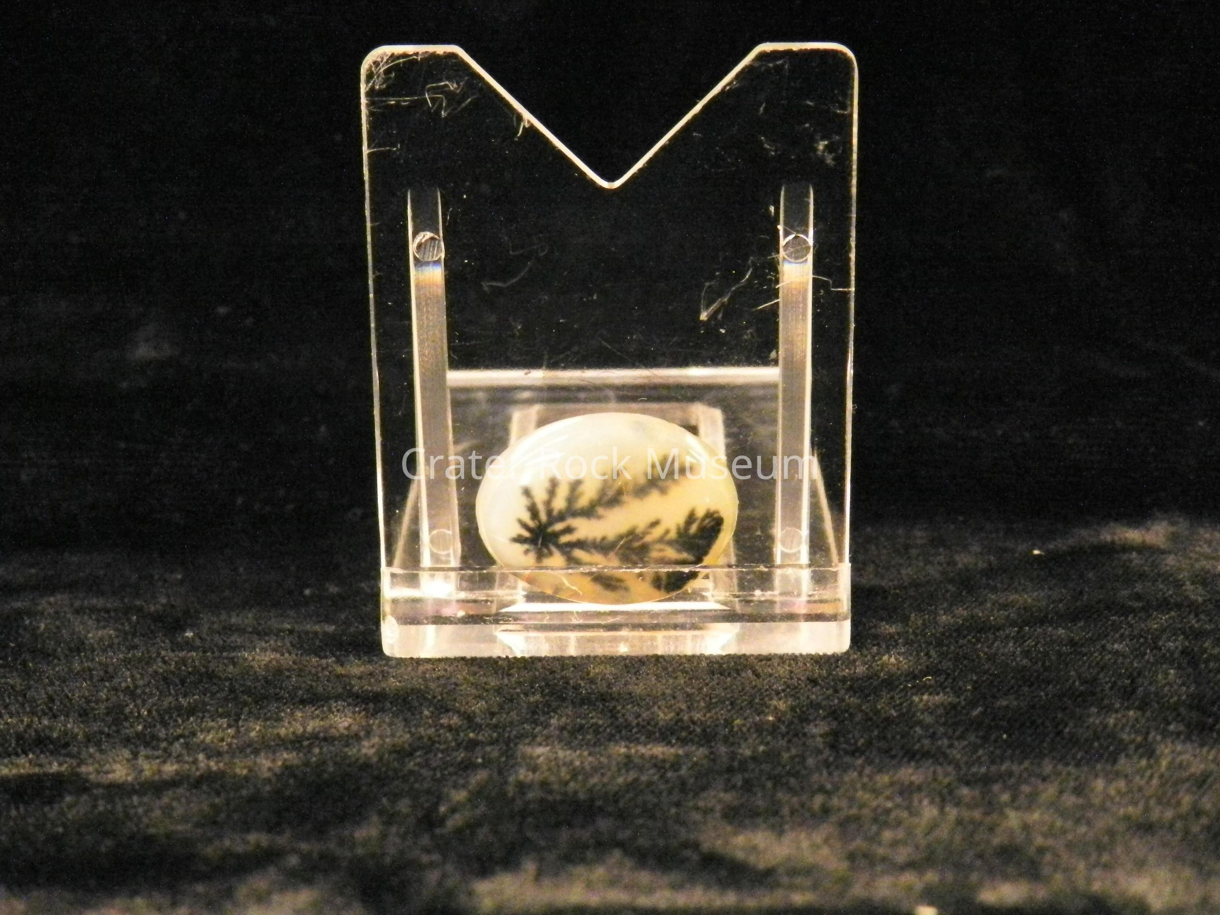 Description: Small oval with convex polished face. Translucent creamy brown with (2) dendritic structures.