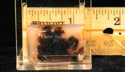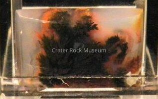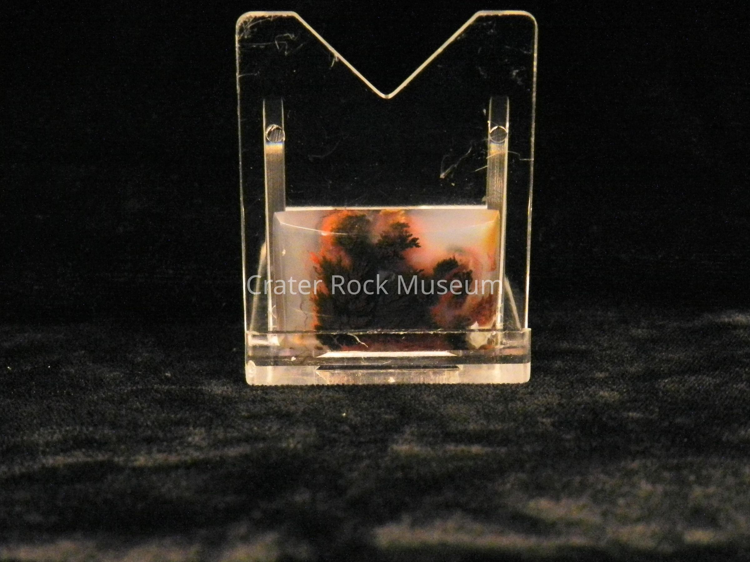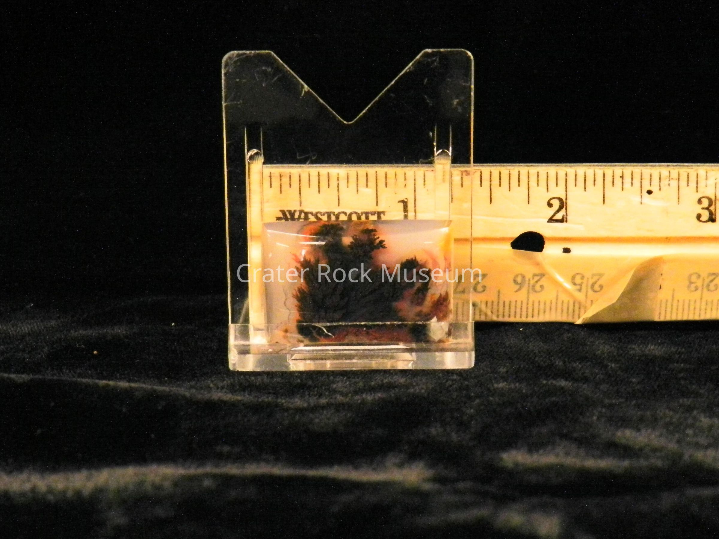 Description: Rectangle with convex polished face. Transparent creamy white with black and reddish-brown dendritic structure.