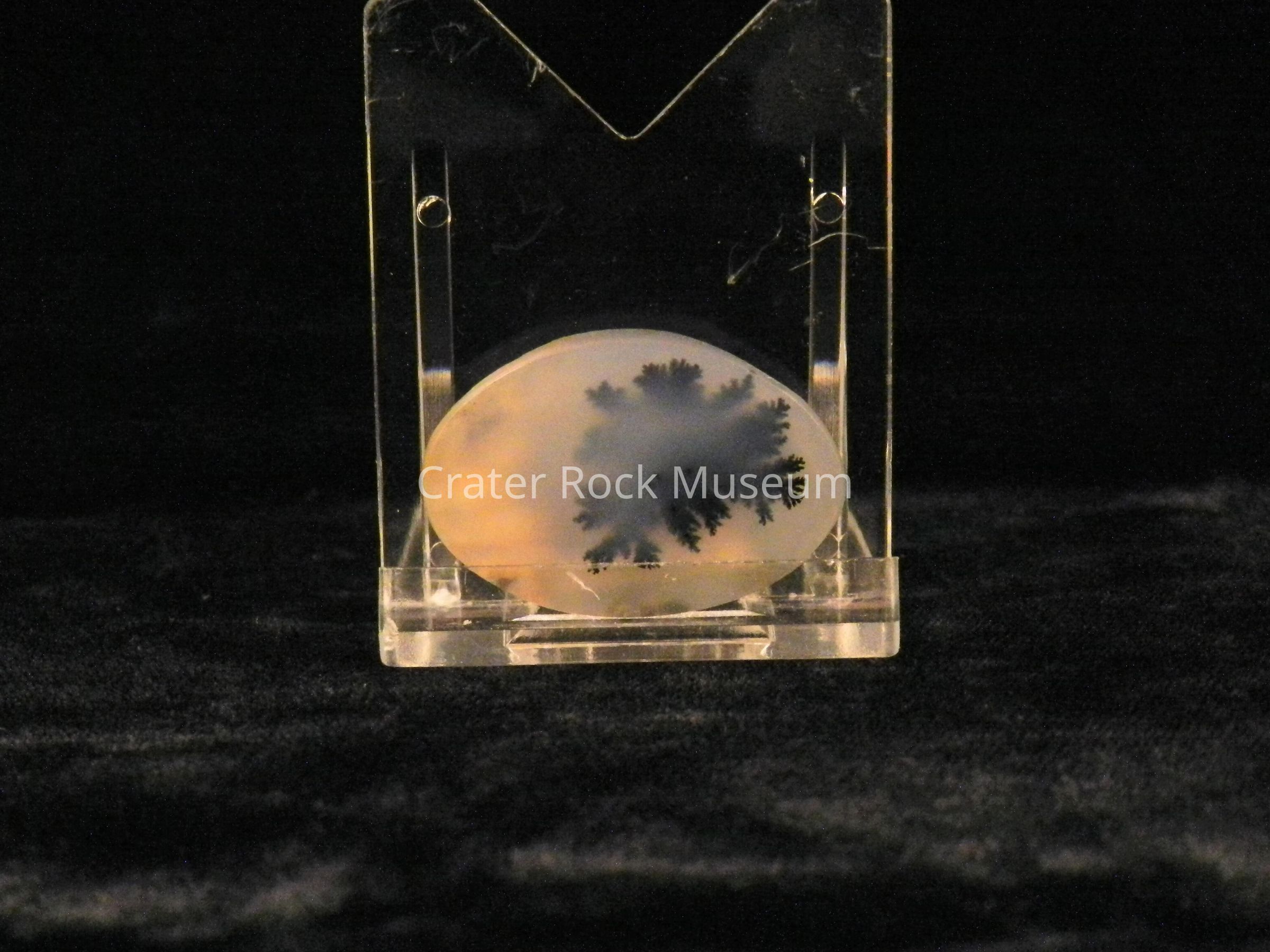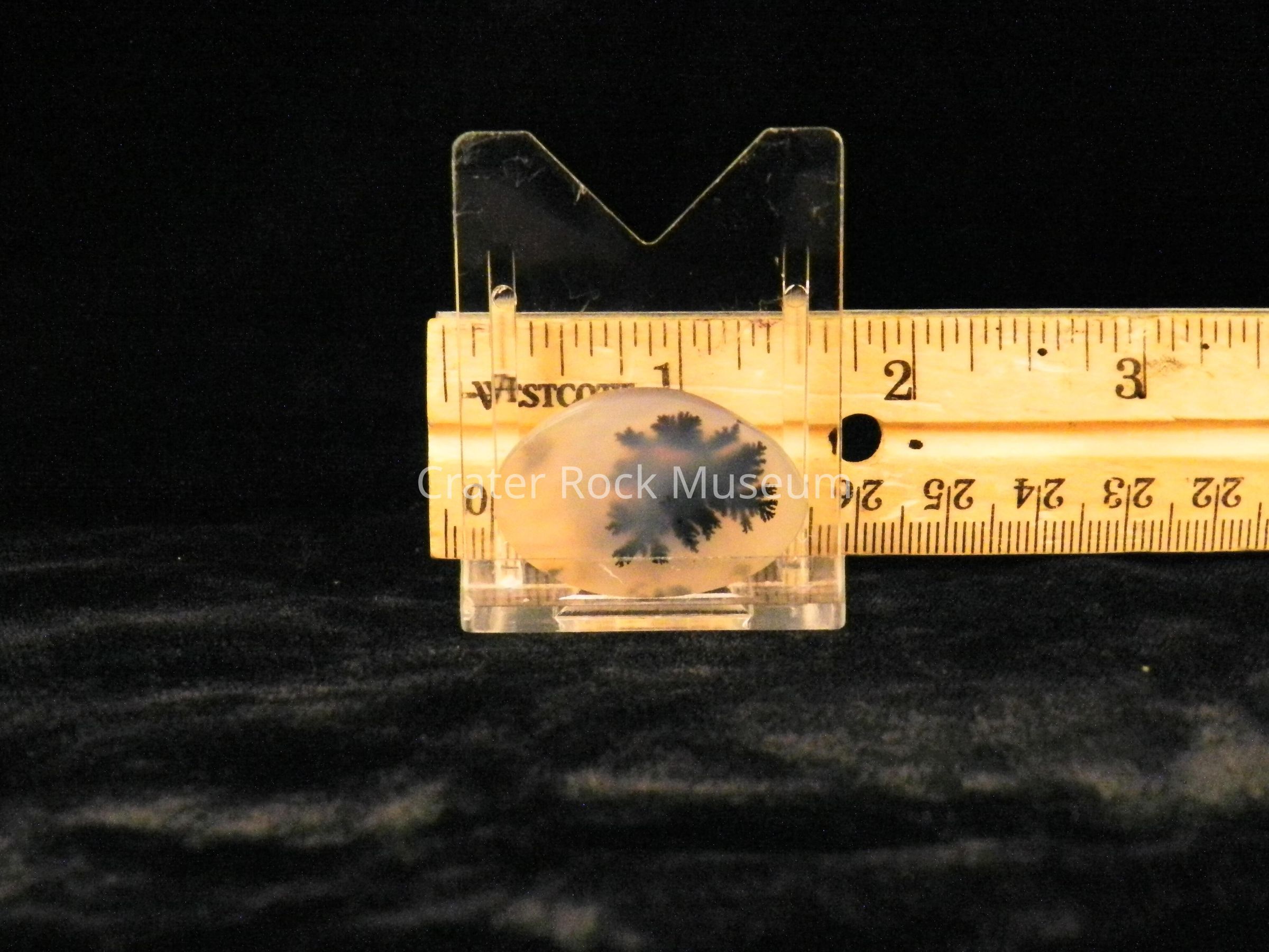 Description: Small oval with concave with polished face. Transparent creamy tan and white with single black dendritic structure.