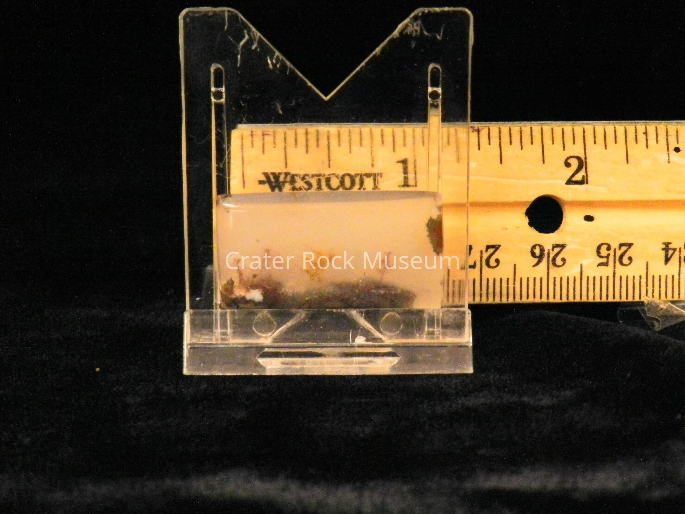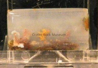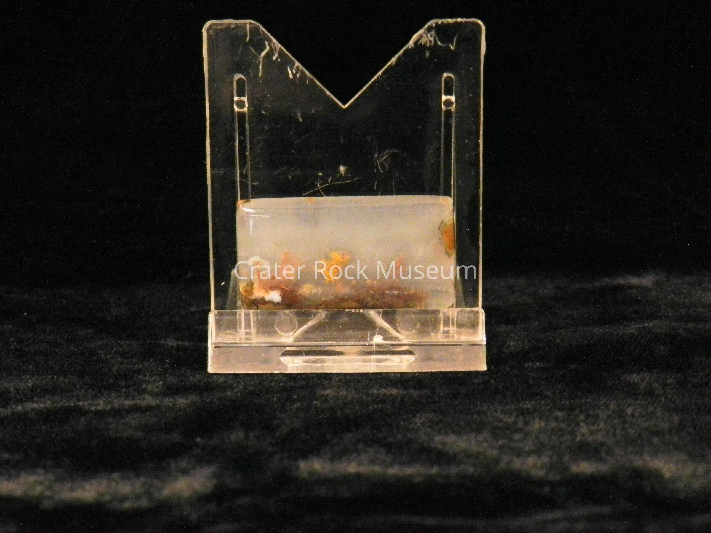 Description: Small rectangle with polished face and sides. Transparent creamy white with very small brown dendritic structures.