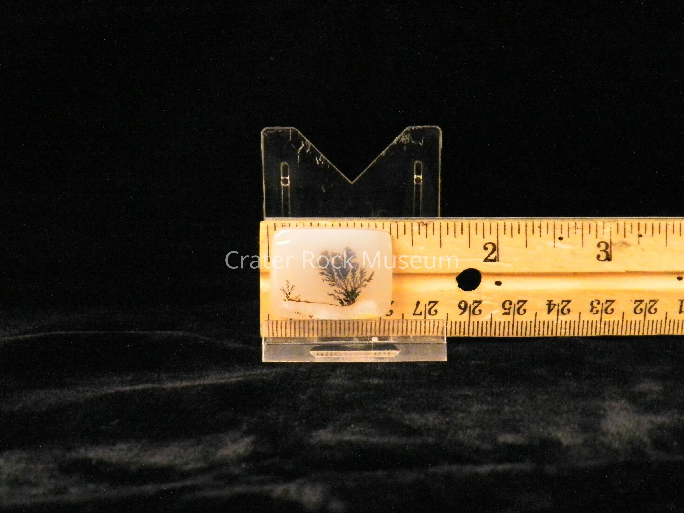 Description: Rectangle with polished face. Creamy translucent white with (1) branched dendritic structure.