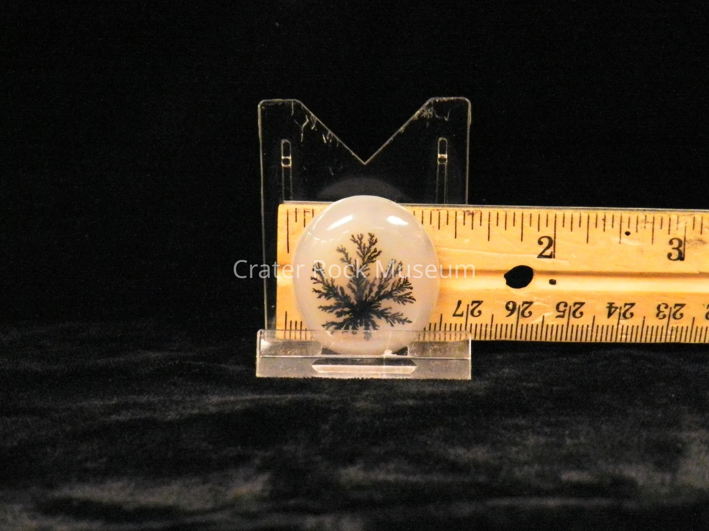 Description: Oval, with concave polished face. Creamy translucent white with (1) branched black dendritic structure