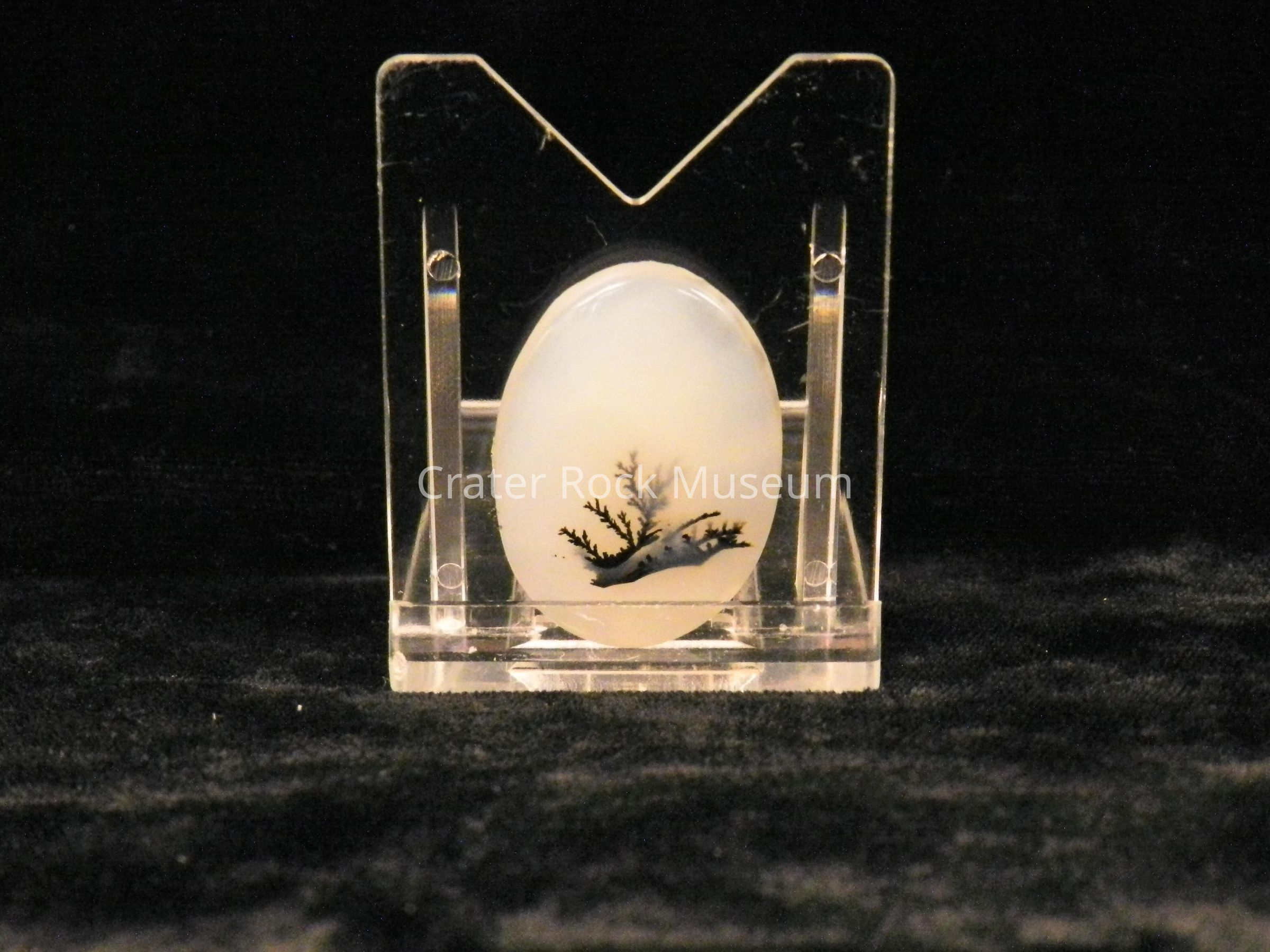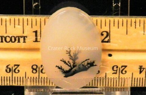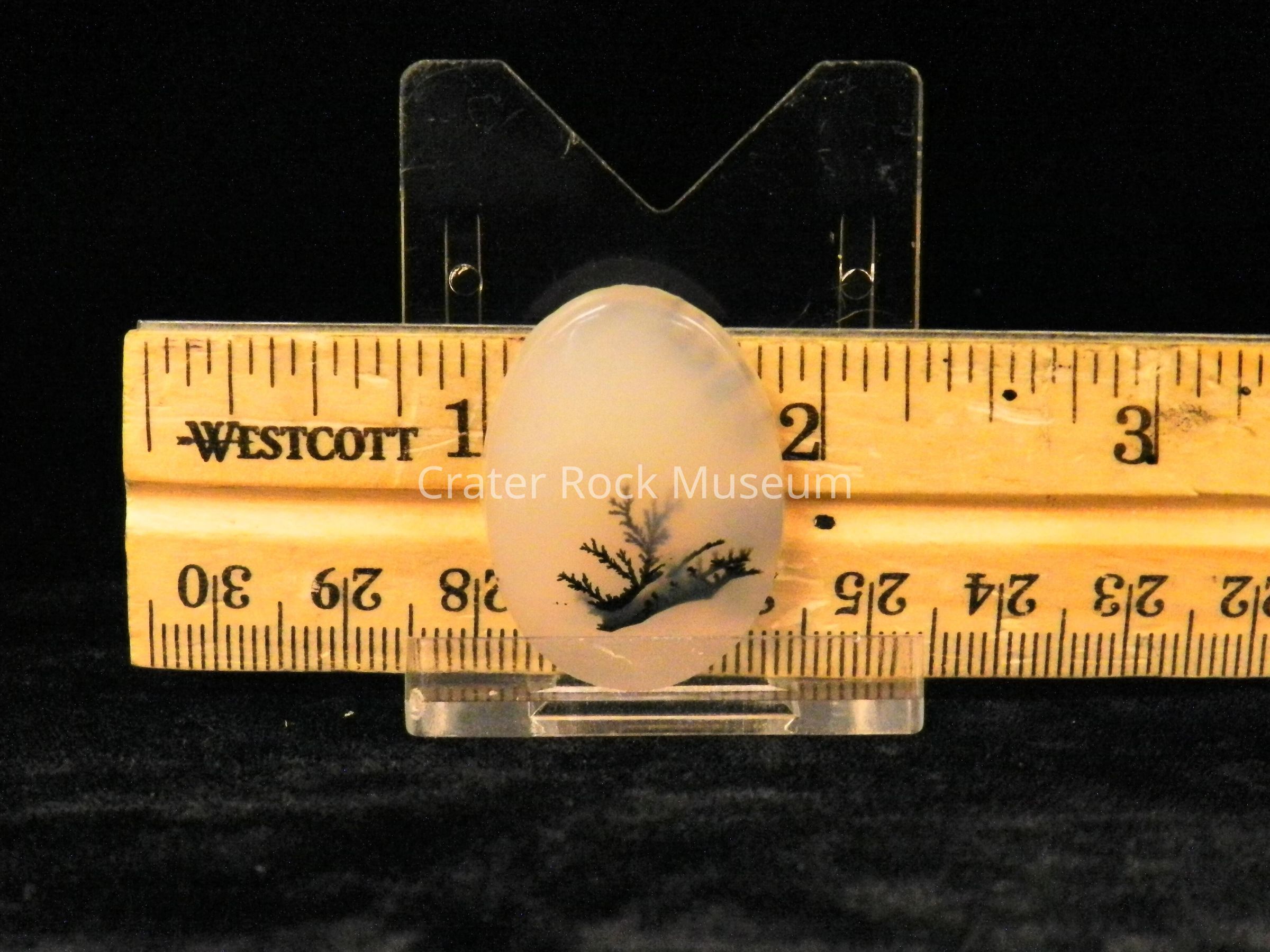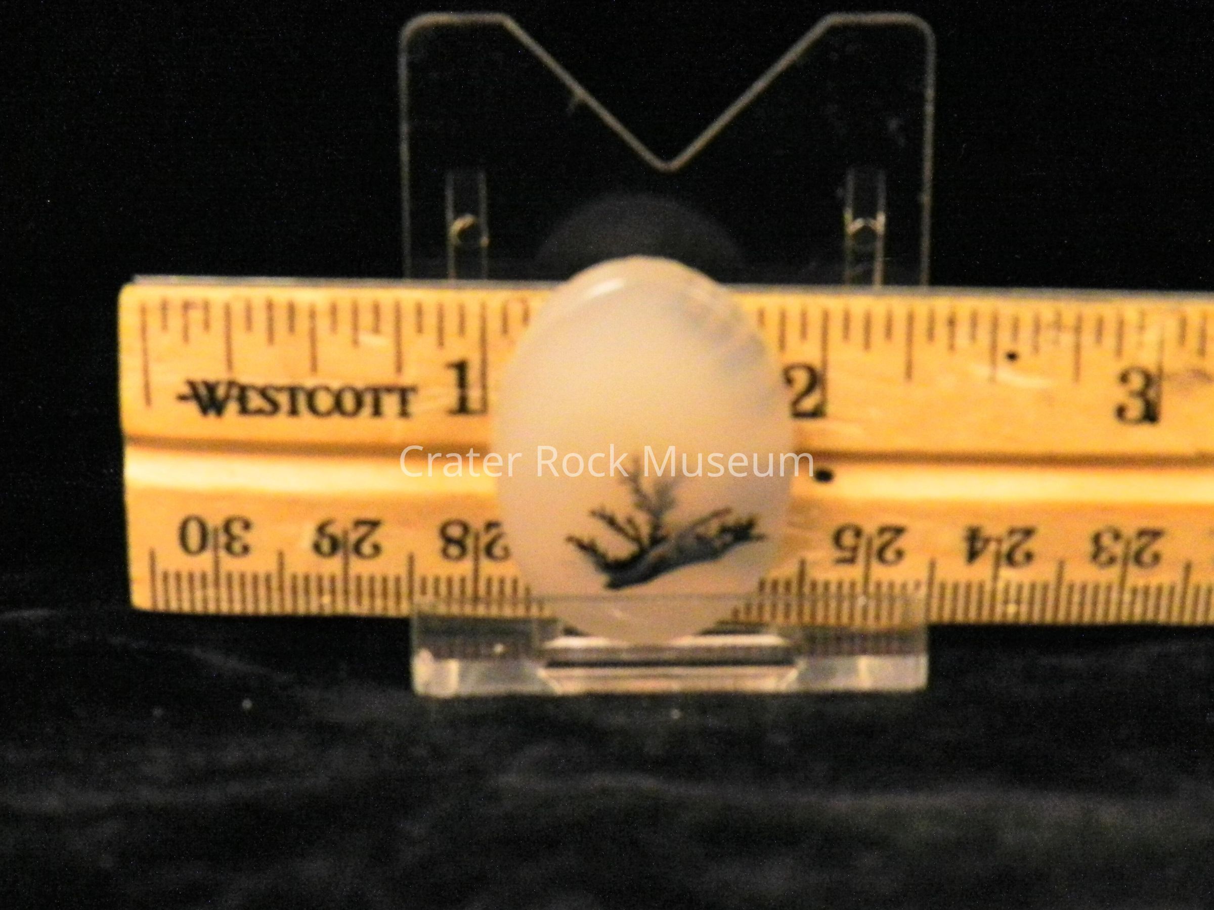 Description: Small oval with convex polished face. Translucent creamy white with (1) small, black dendritic structure.