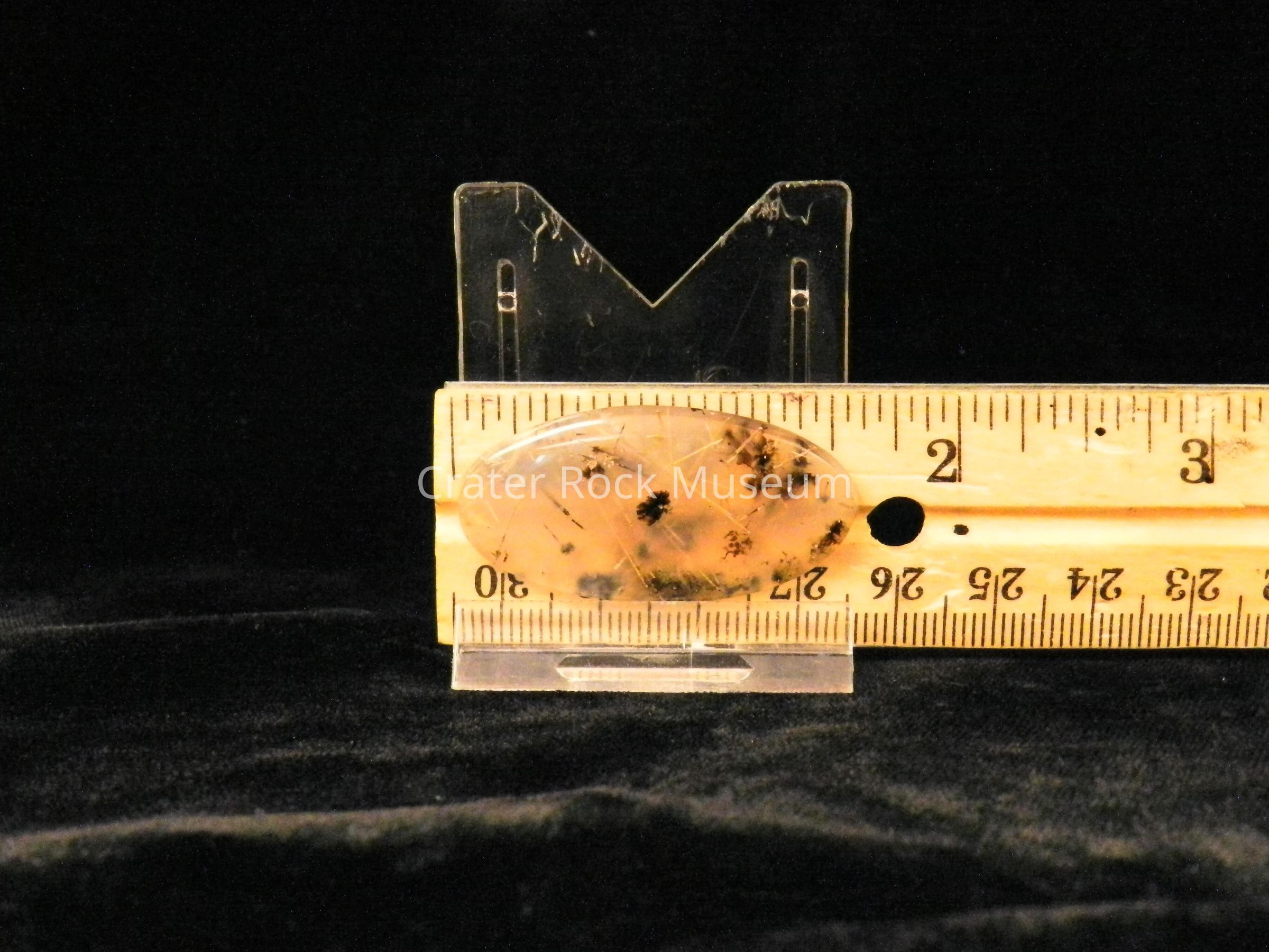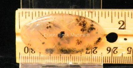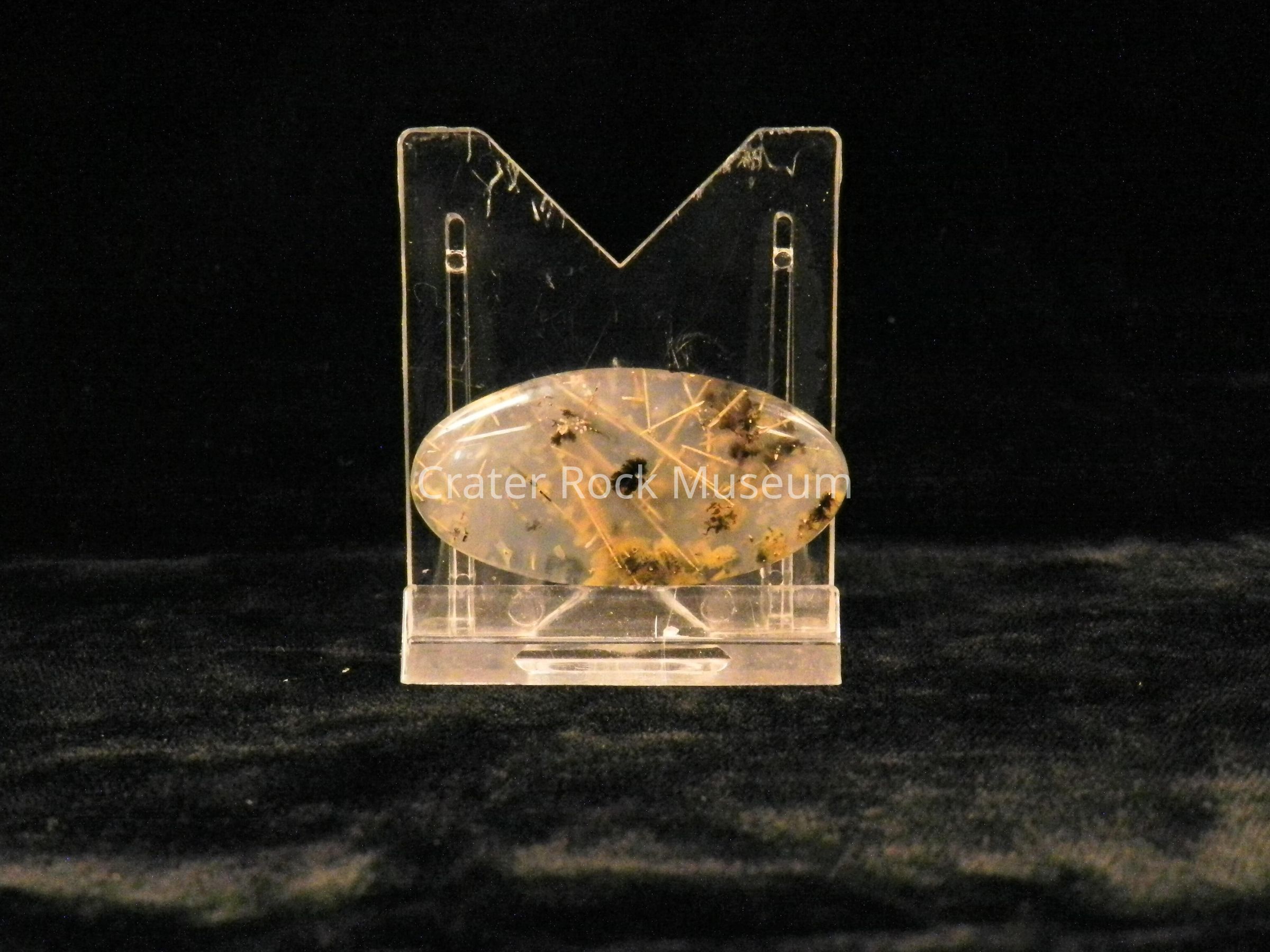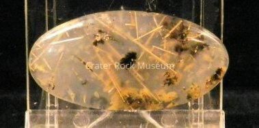 Description: Elongated oval with slightly convex, polished face. Transparent clear (slightly tan) with needle-like crystals and very small dendritic structures.