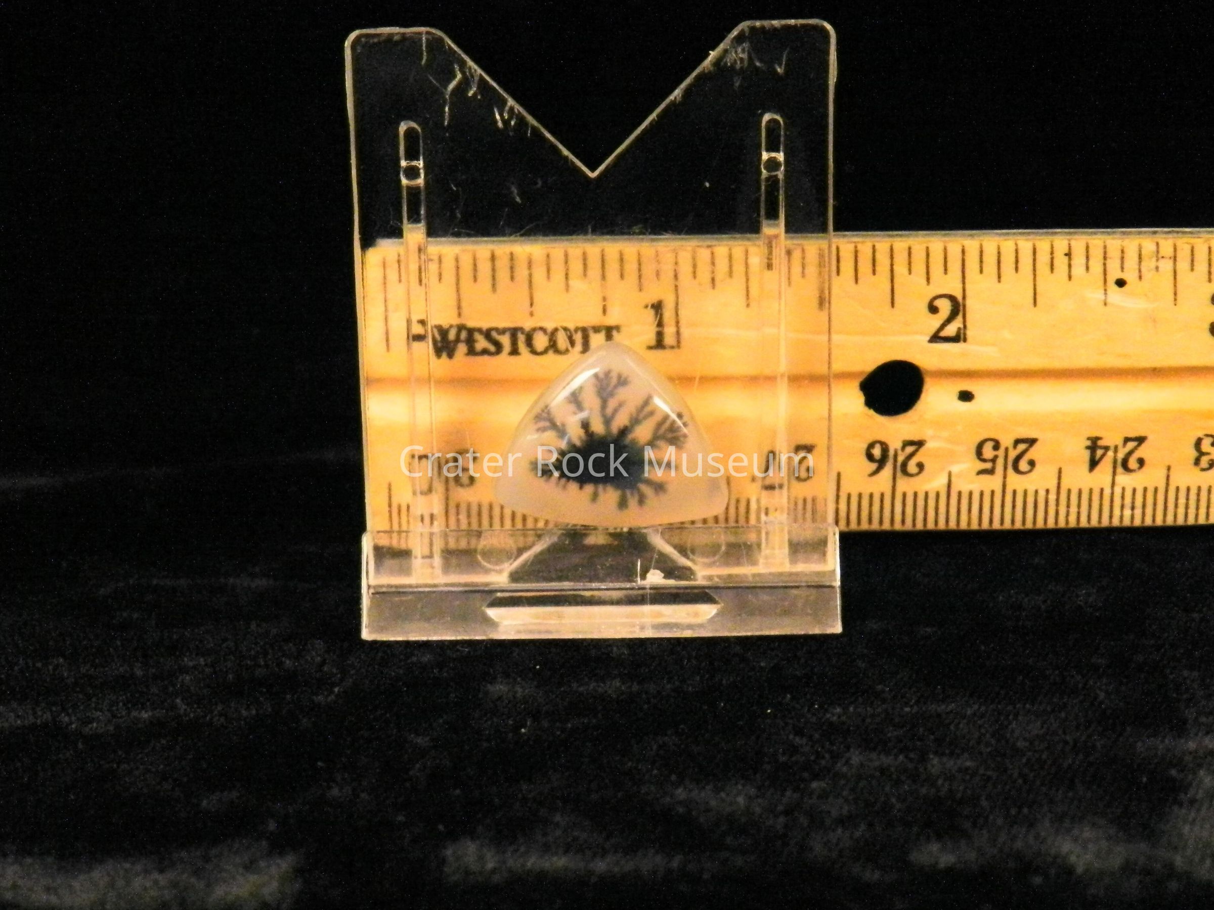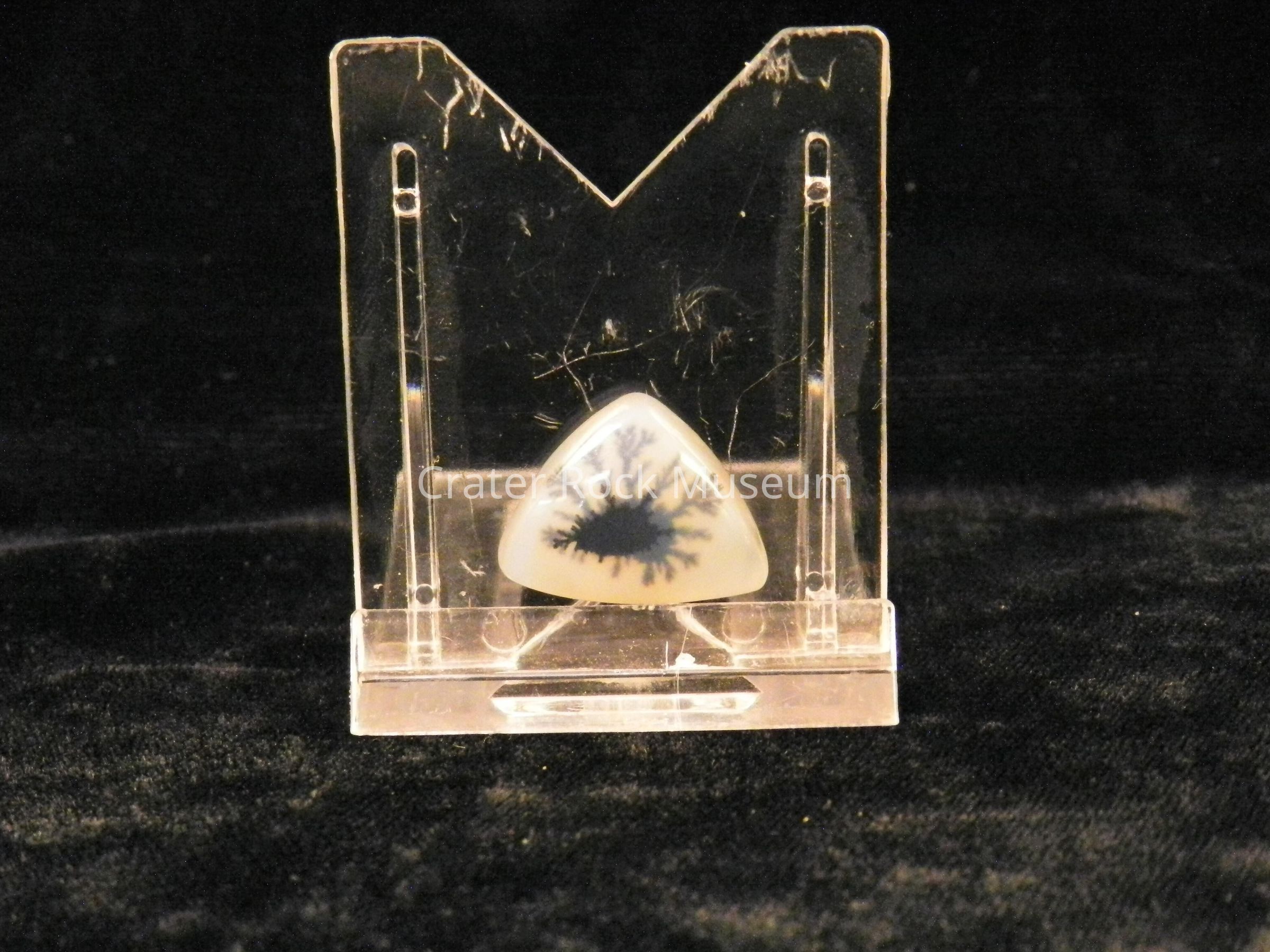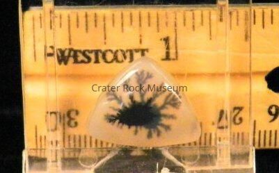 Description: Very small triangular shape with transparent creamy tan and (1) dendritic structure in center.