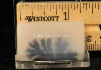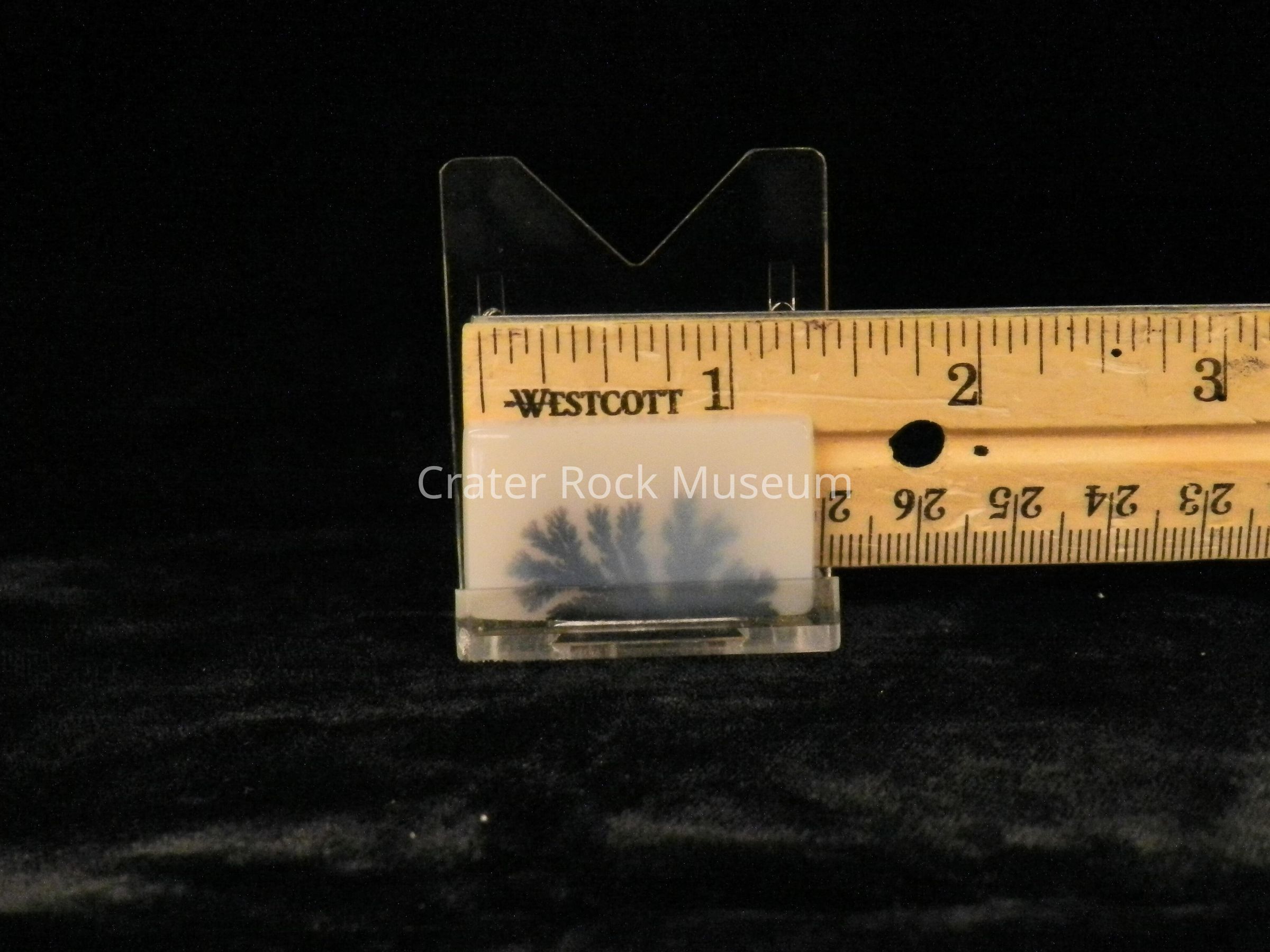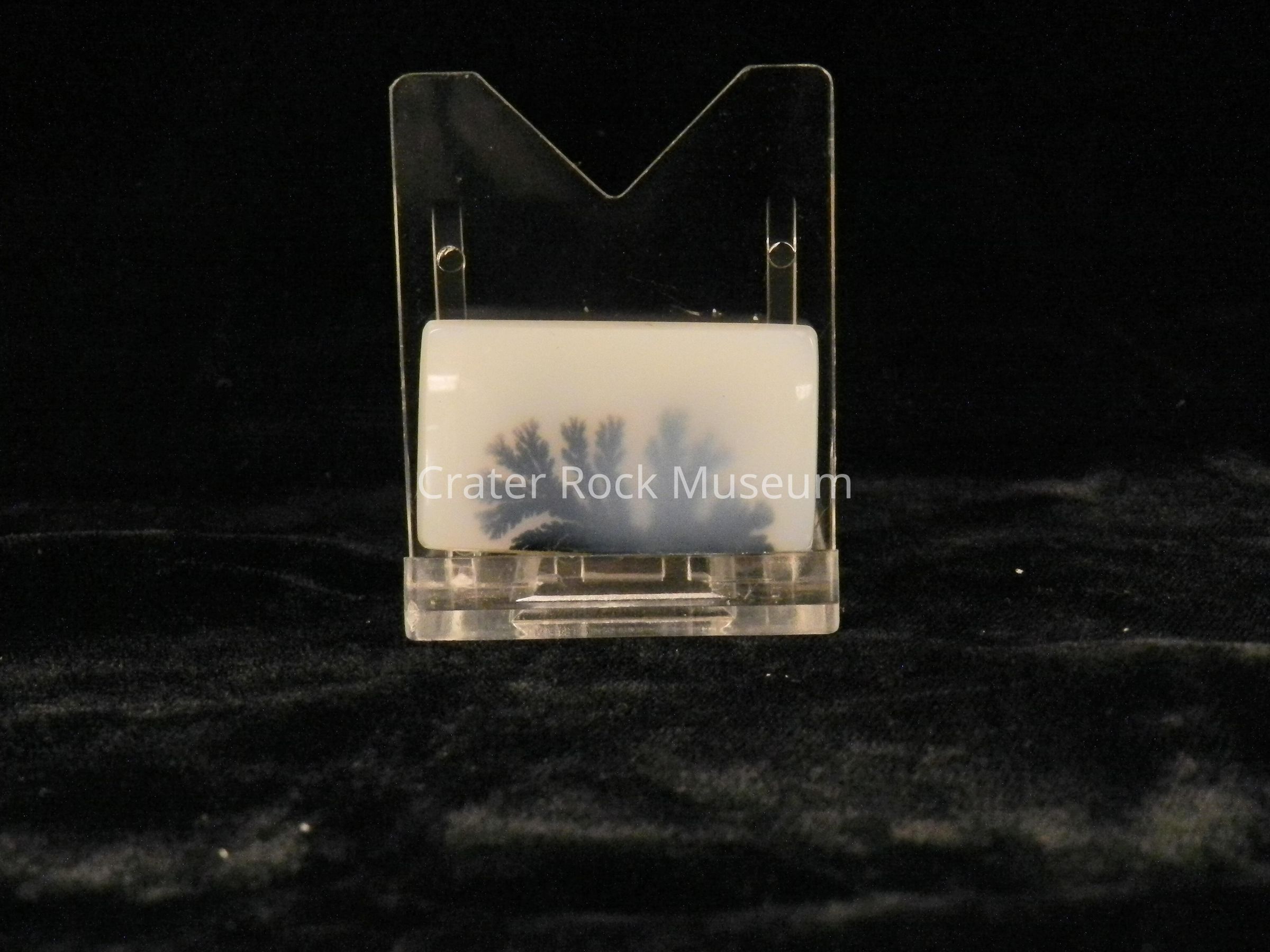 Description: Rectangular, with slightly convex polished face. Translucent creamy white with (1) hazy black dendritic structure with multiple branches.