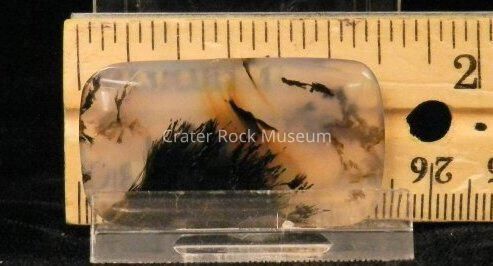 Description: Rectangular with a slightly convex polished face. Transparent clear and smokey gray with some orange streaking. Some small areas of tan. Dendritic structure is black with some small spots.