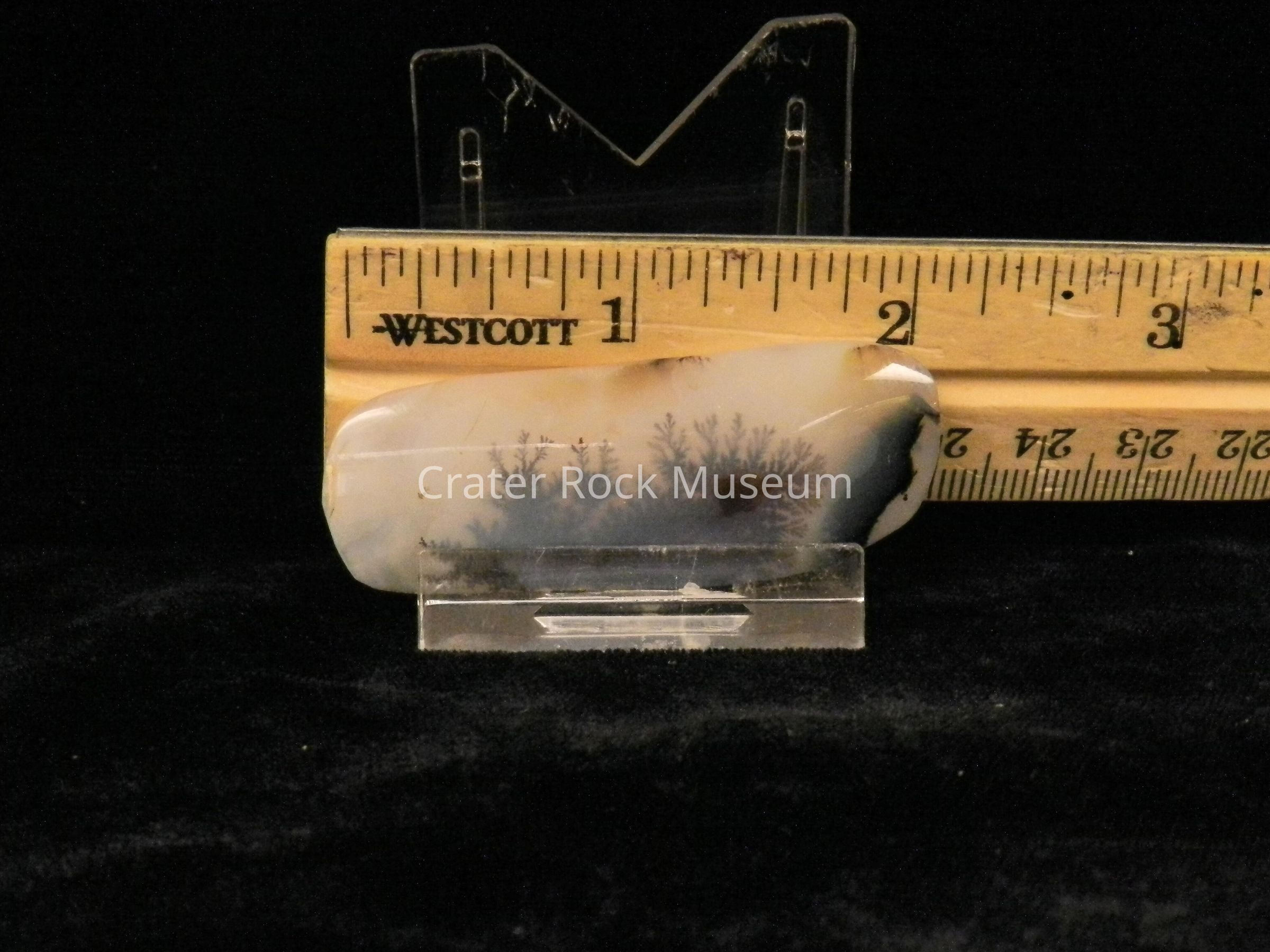 Description: Semi-rectangular, with flat back and polished convex face. Translucent creamy white and tan with large hazy black dendritic structure.