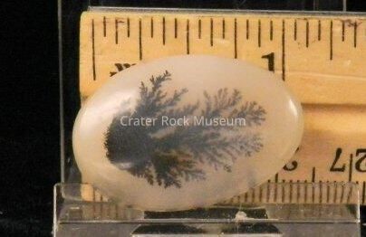 Description: Thin oval with semi-convex polished face. Translucent creamy tan with (1) dark brown dendritic structure.