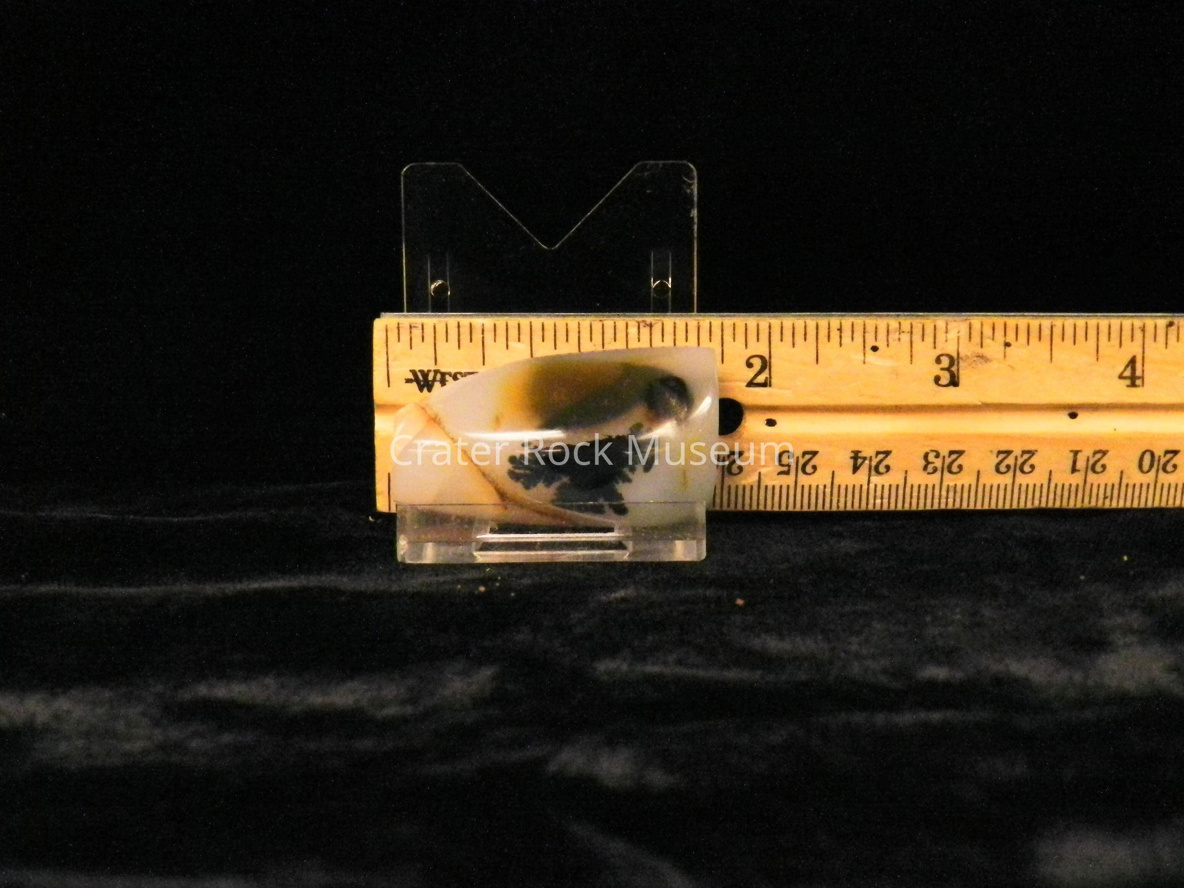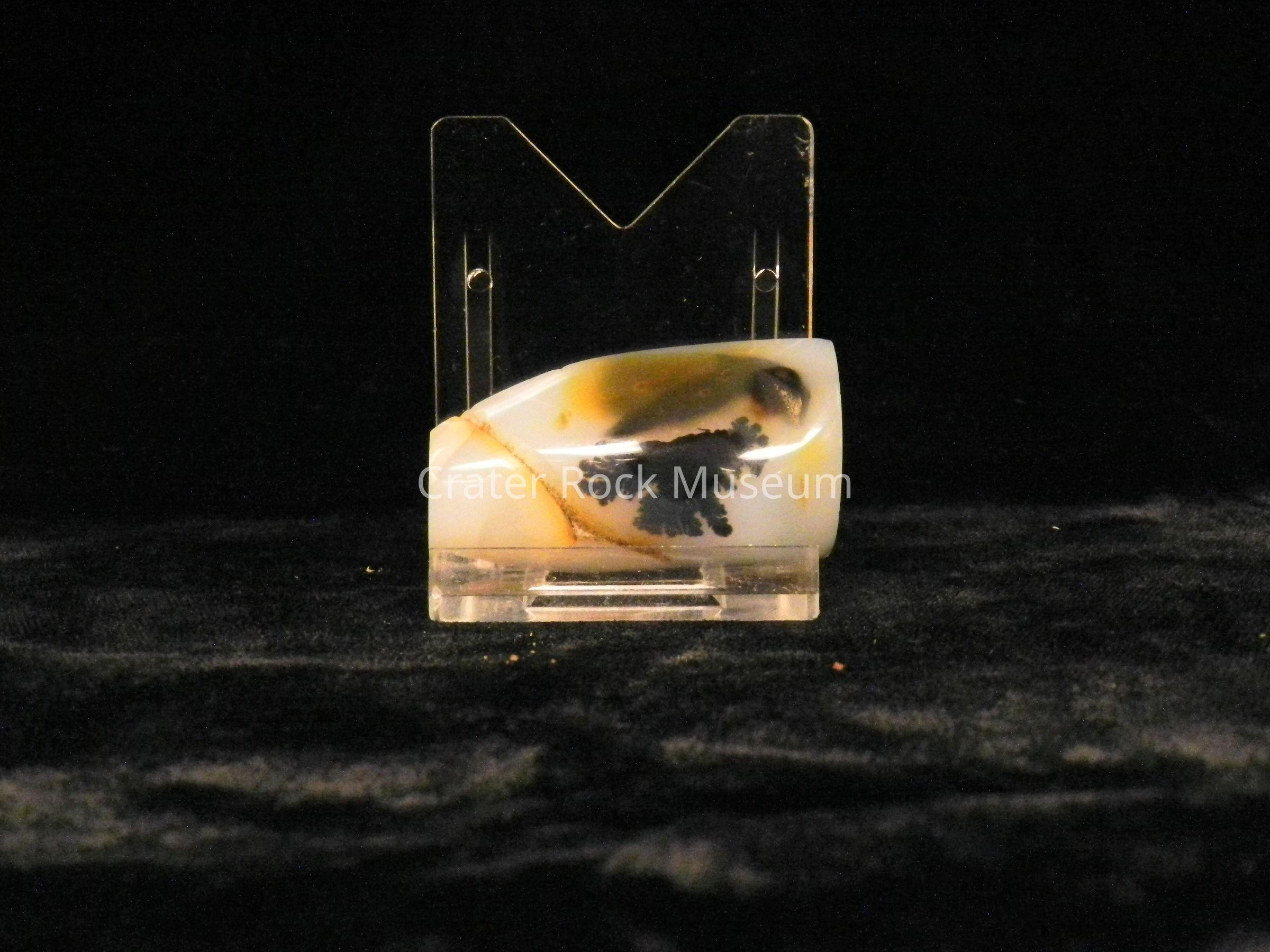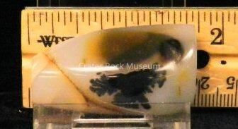 Description: Flat back with convex polished face. Translucent creamy white with a fracture seperating a blue-gray side. (1) black dendritic structure.