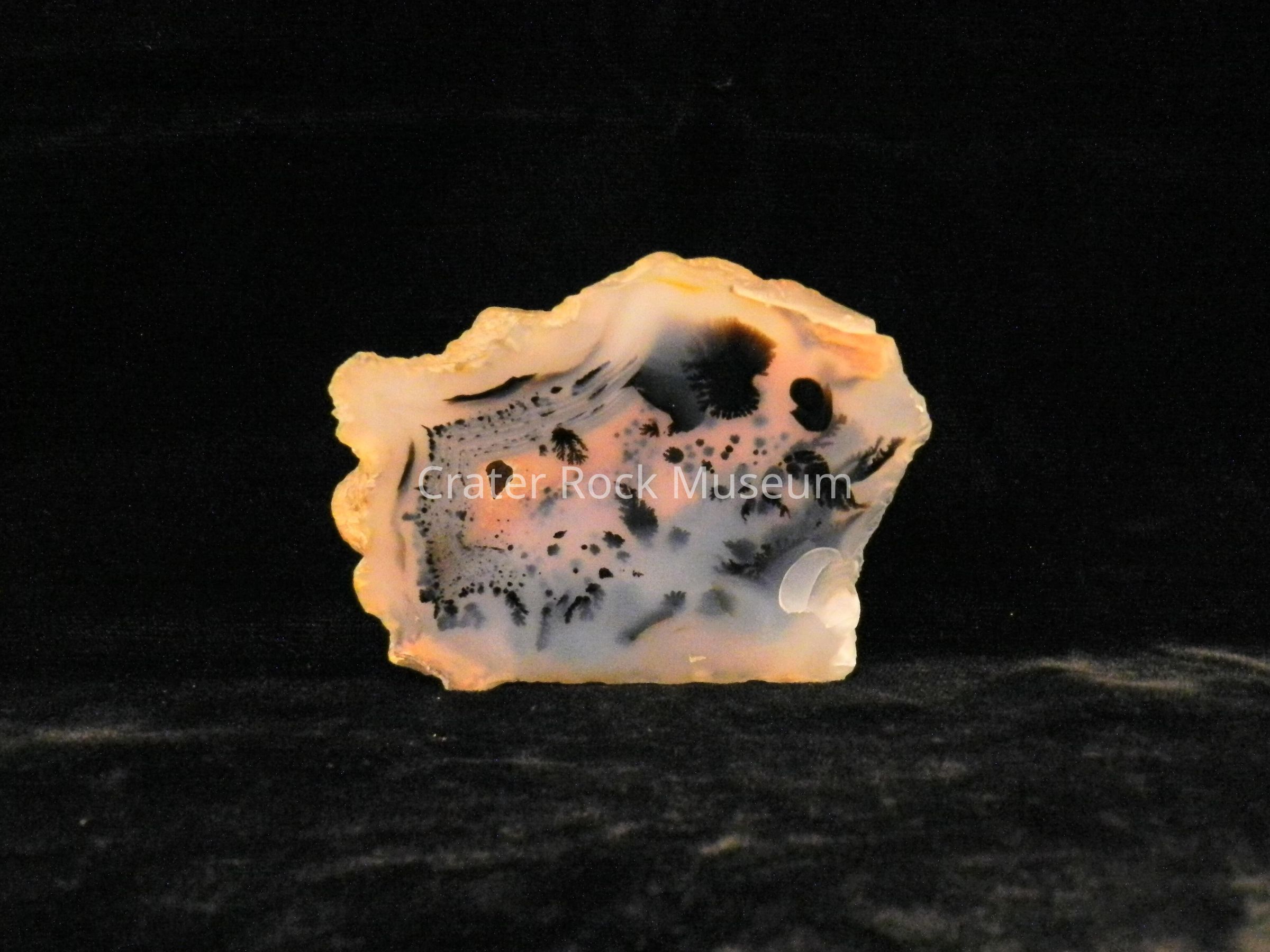 Description: Rough, irregular back with polished face. Transparent creamy white and blue-gray. Some dull pink in center. Dendritic structures are spotted throughout inner areas.