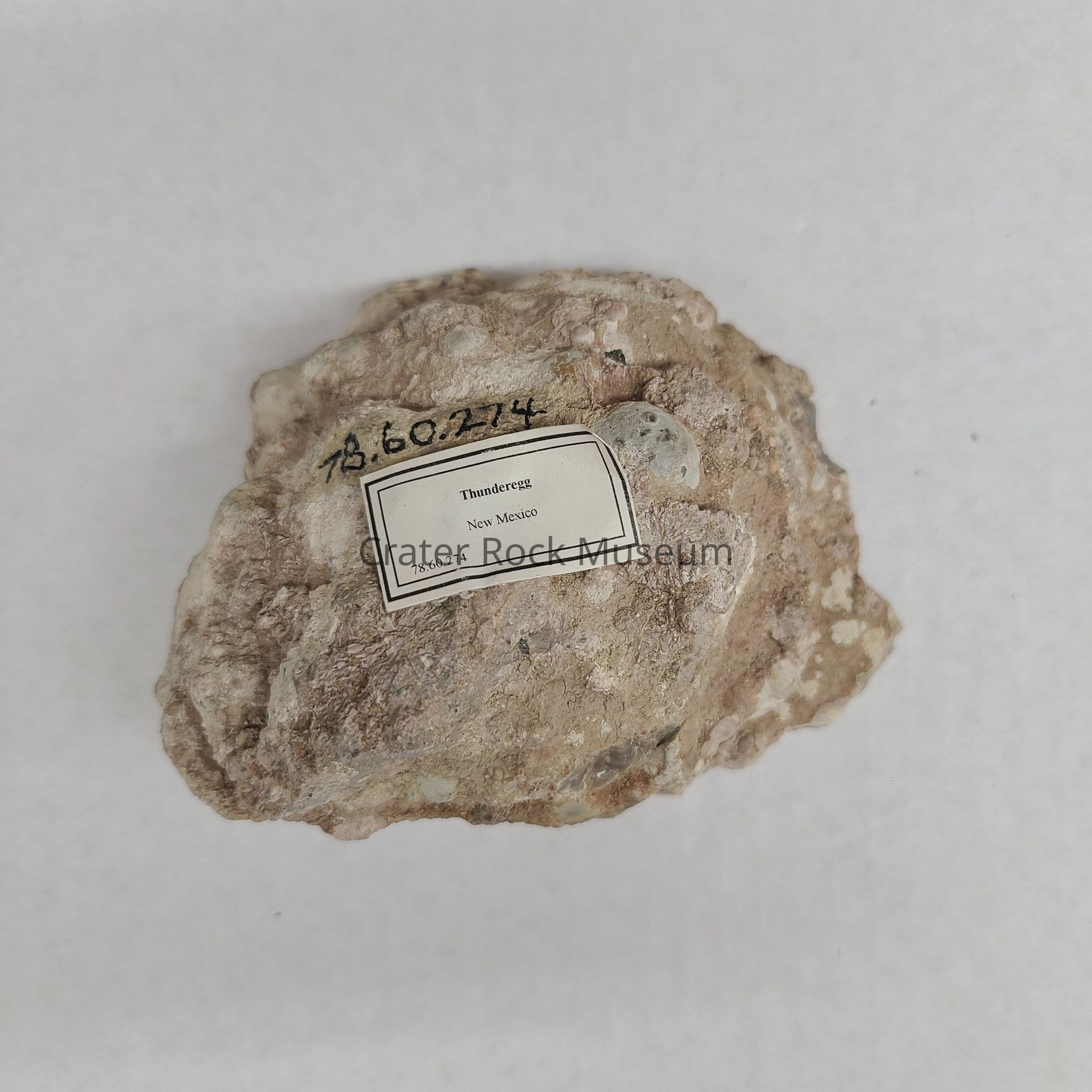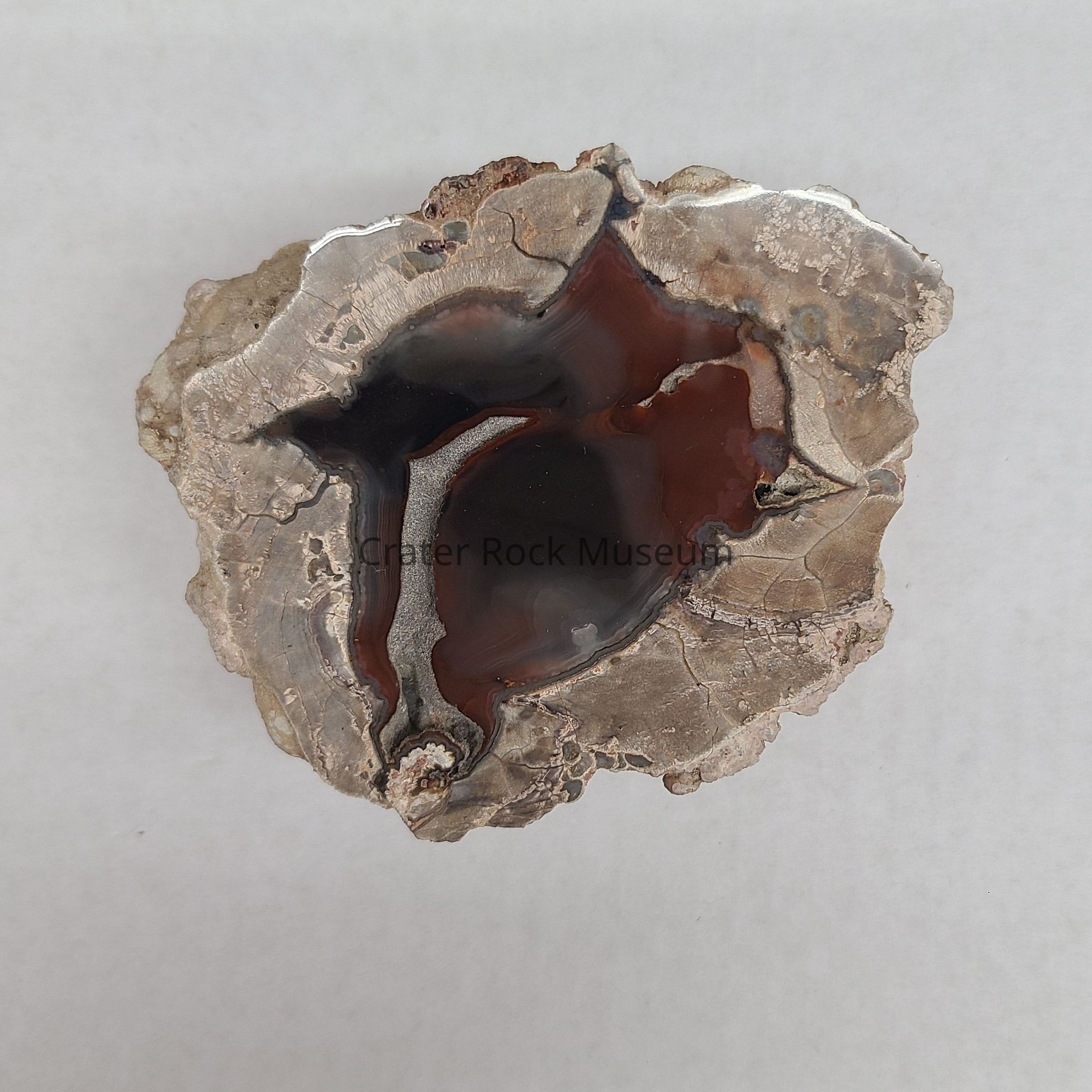 A Thunderegg from the Baker Ranch, Deming, NM. Cut side shows Agate center in Red, Grey and Black, some Greyish Rose color. Elongated open hole seen and two smaller holes and is Sand lined. Surrounding rock is in Pink, Greys and Tan.Dimensions