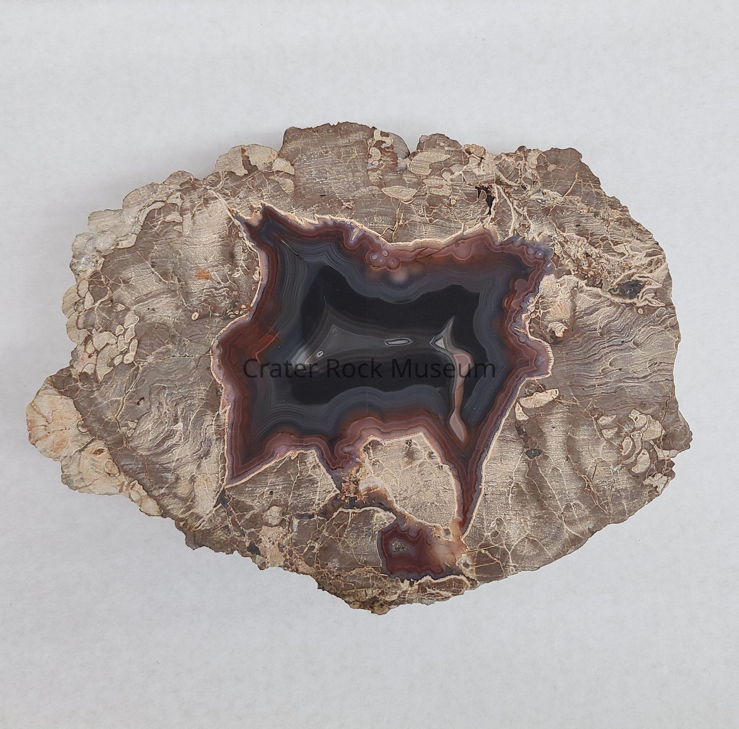 A Thunderegg from Deming, NM. Cut side shows Dark Center in fortified Agate in Black, Greys, Reds and Pinks. Surrounded by Light colored matrix rock in Beige, Grey, Tan with Red and Grey and Crystalline spot. It is very unusual for the center to be dark and surrounding rock light. It is usually the opposite.Dimensions