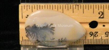 Description: Thin, teardrop shape with flat back and slightly convex polished face. Creamy yellow with some creamy white. Very fine dark brown branching dendritic structure.Collection