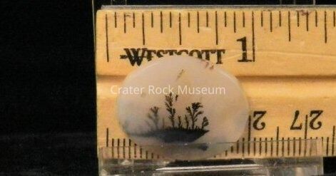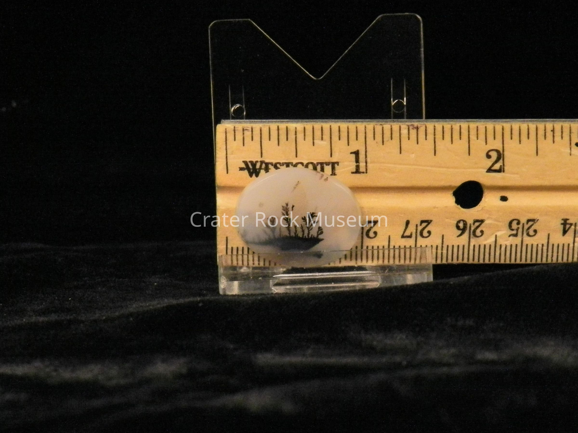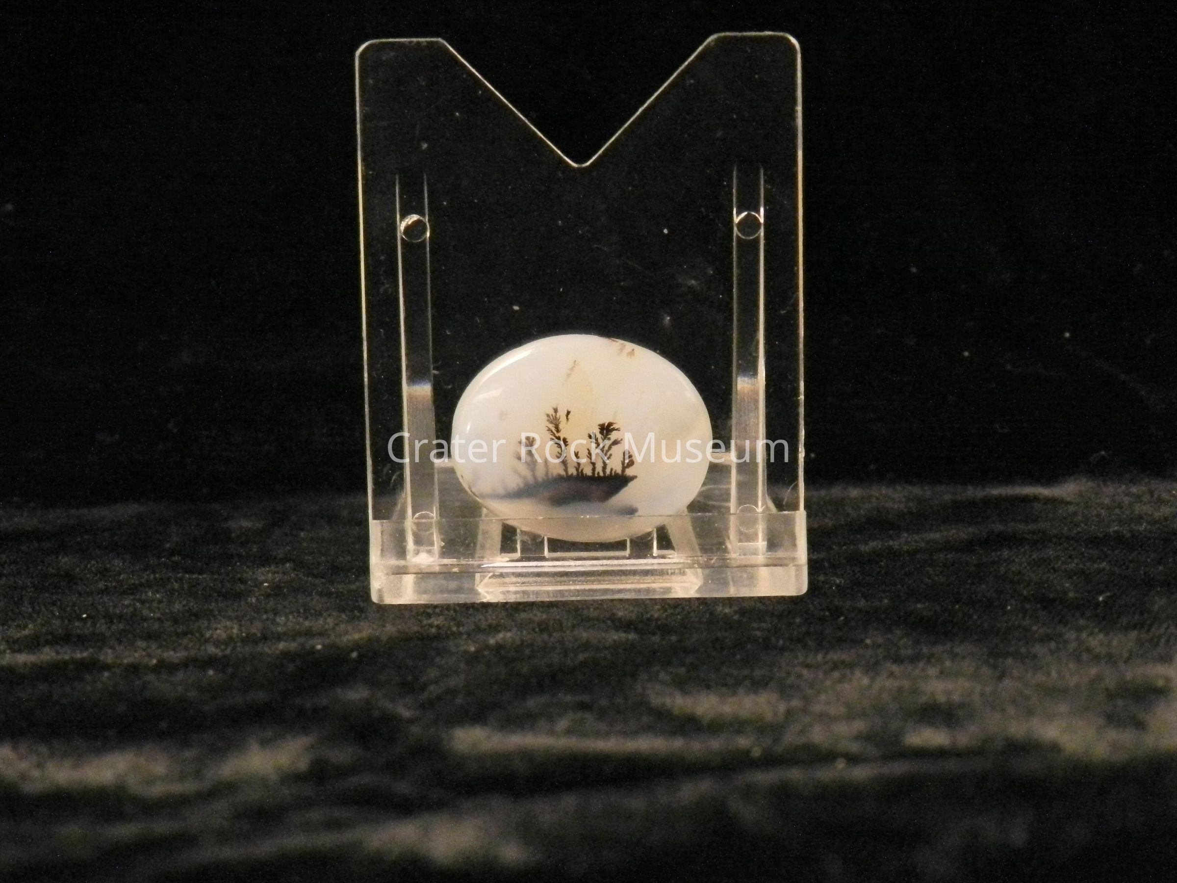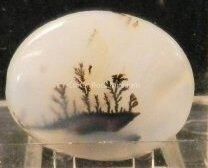 Description: Thin, small oval with convex polished face. Creamy white and some blue-gray and a single black dendritic structure with multiple branches coming from a solid black spot.Collection