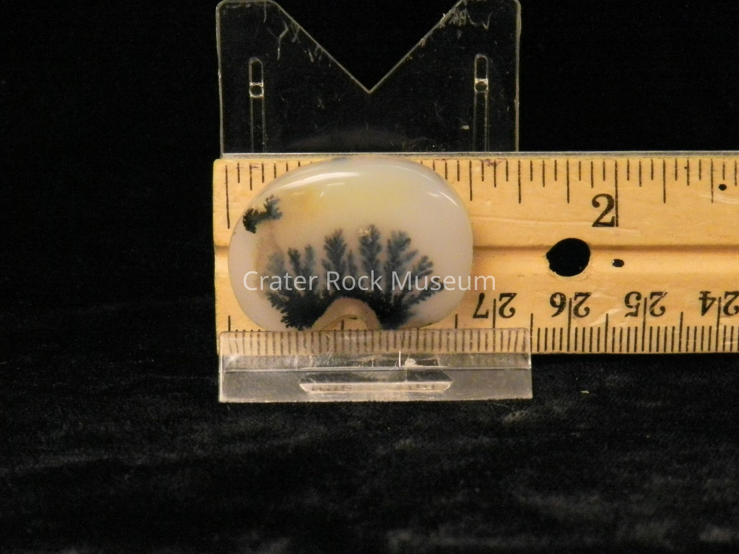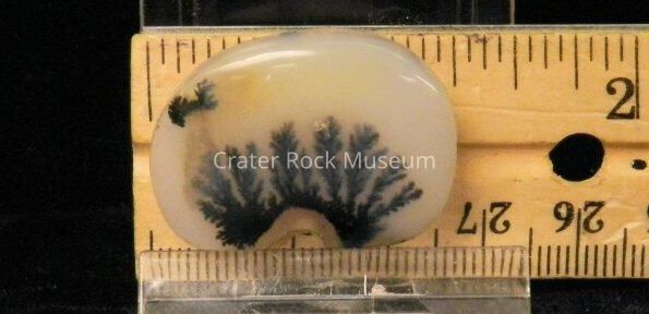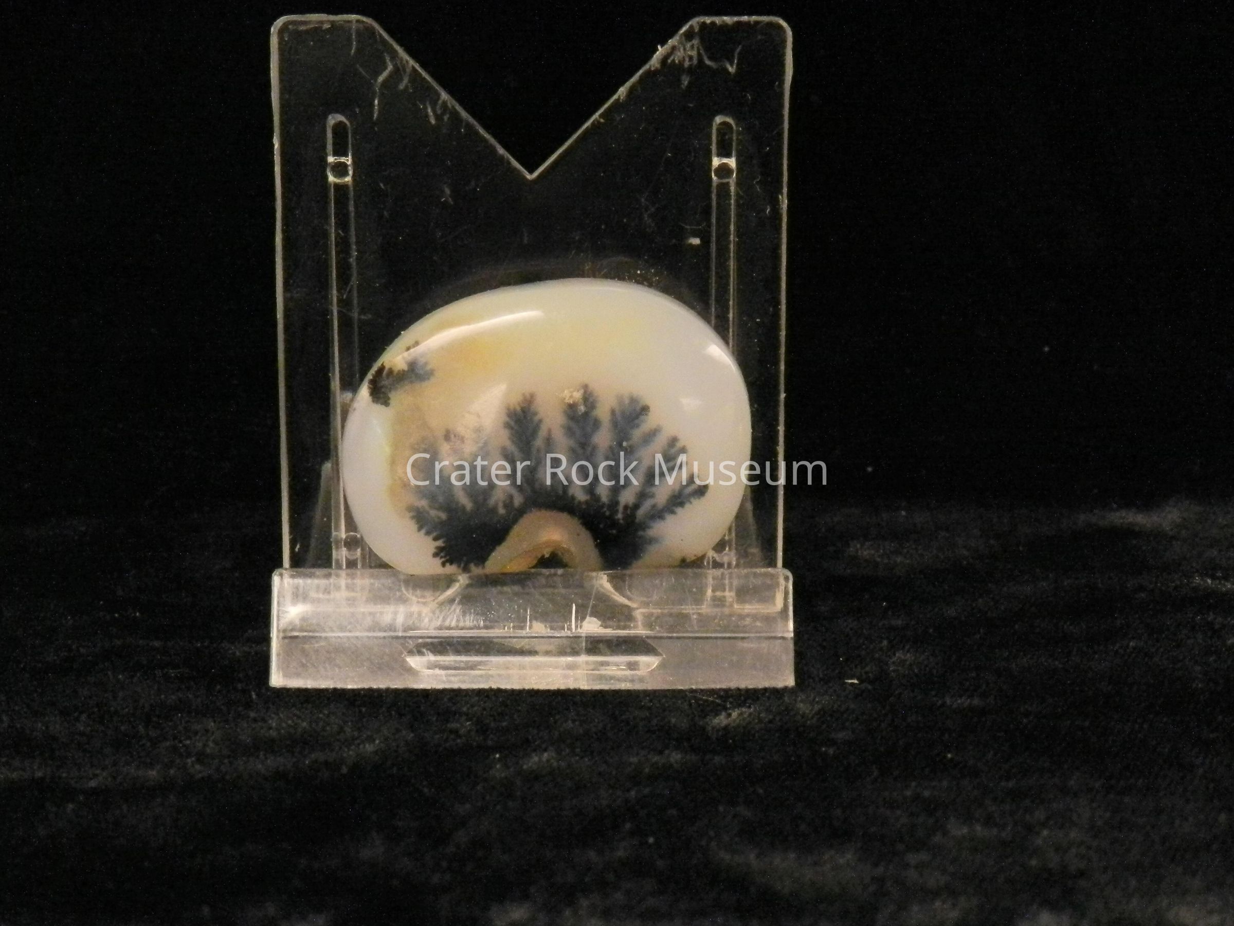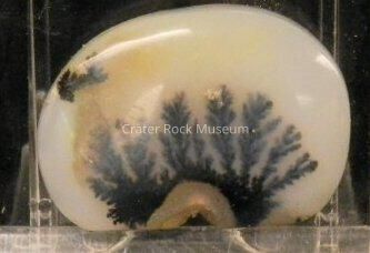 Description: Thin slice with flat back and polished, slightlty convex face. Translucent creamy white with some tan in one region. Multi-branching dendritic strucutre emitting from an arch strucutre.Collection