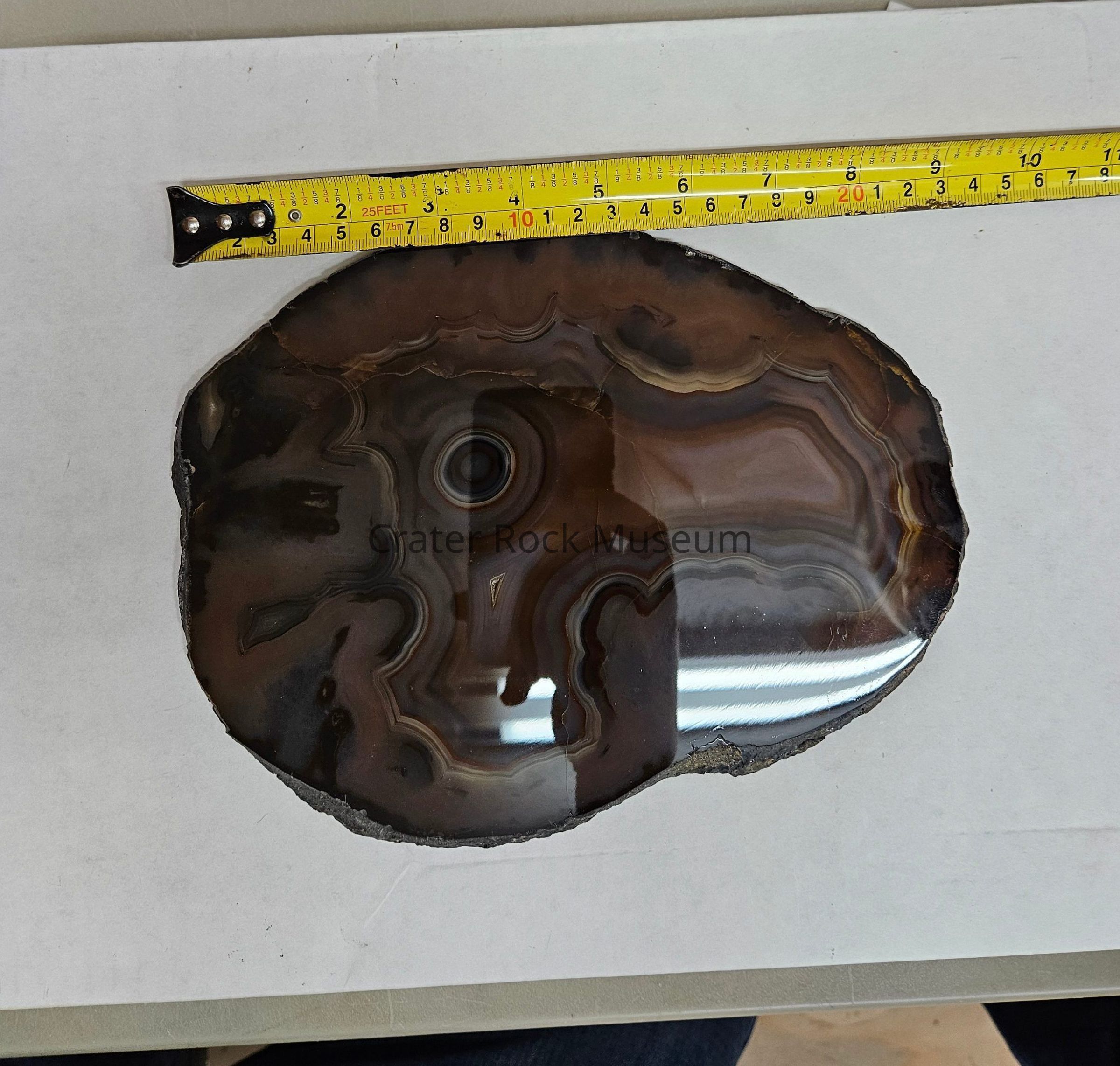 A 3/8" (.9 cm) thick slice of an Agate from Brazil. Polished side shows fortified Central Zone resembling a Horse's Head with large Eye. Colors: Greys, Reds, Blues, Browns, Lavenders and Black. Surrounding Agate is in Greys, Blues, Browns, Yellows with Black Dendrite (mostly along edge). One Crystalline hole is seen.Dimensions
