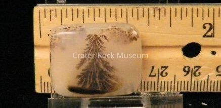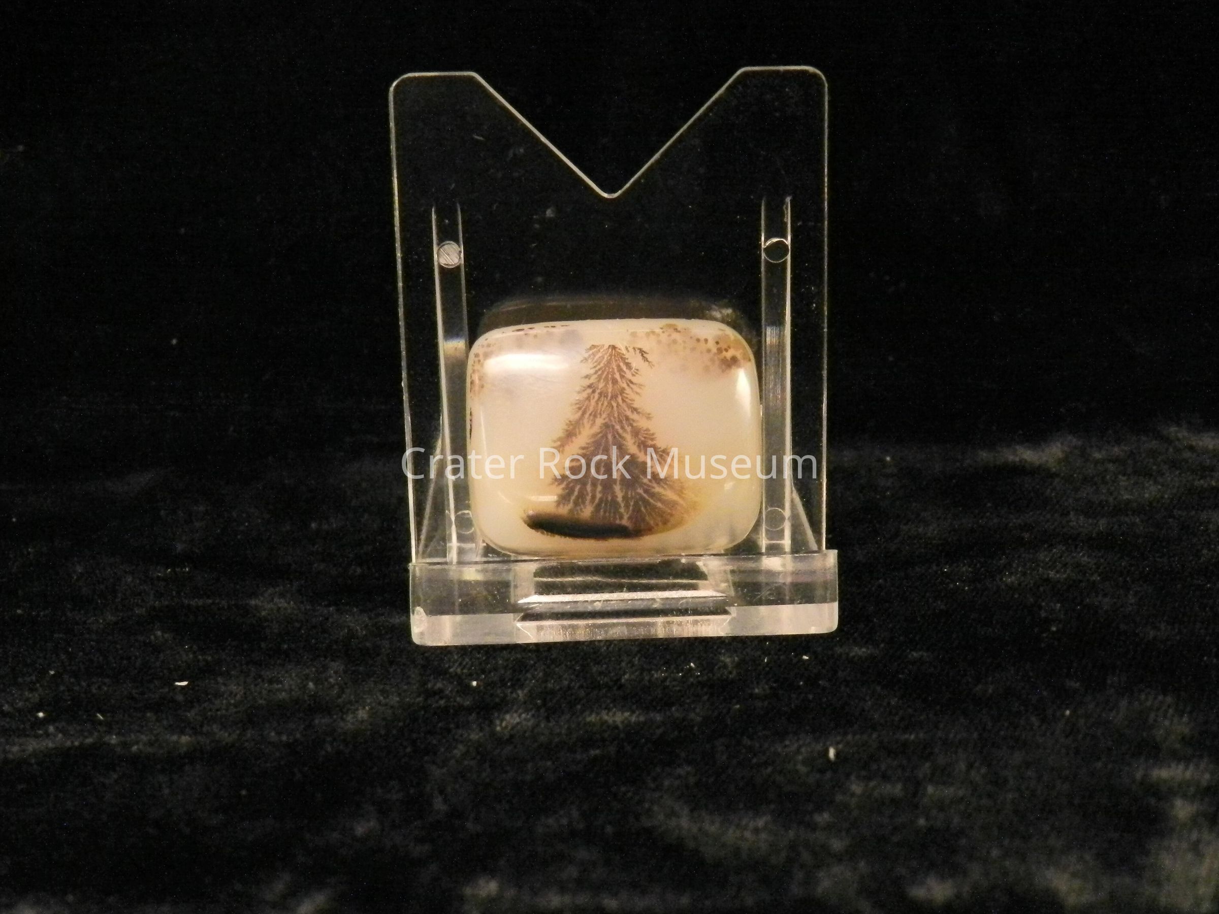 Description: Nearly square thin slice with slightly convex polished face. Translucent creamy tan to light brown. Light brown area has a "Christmas tree" dendritic structure with (2) small areas in corner.Collection