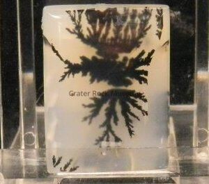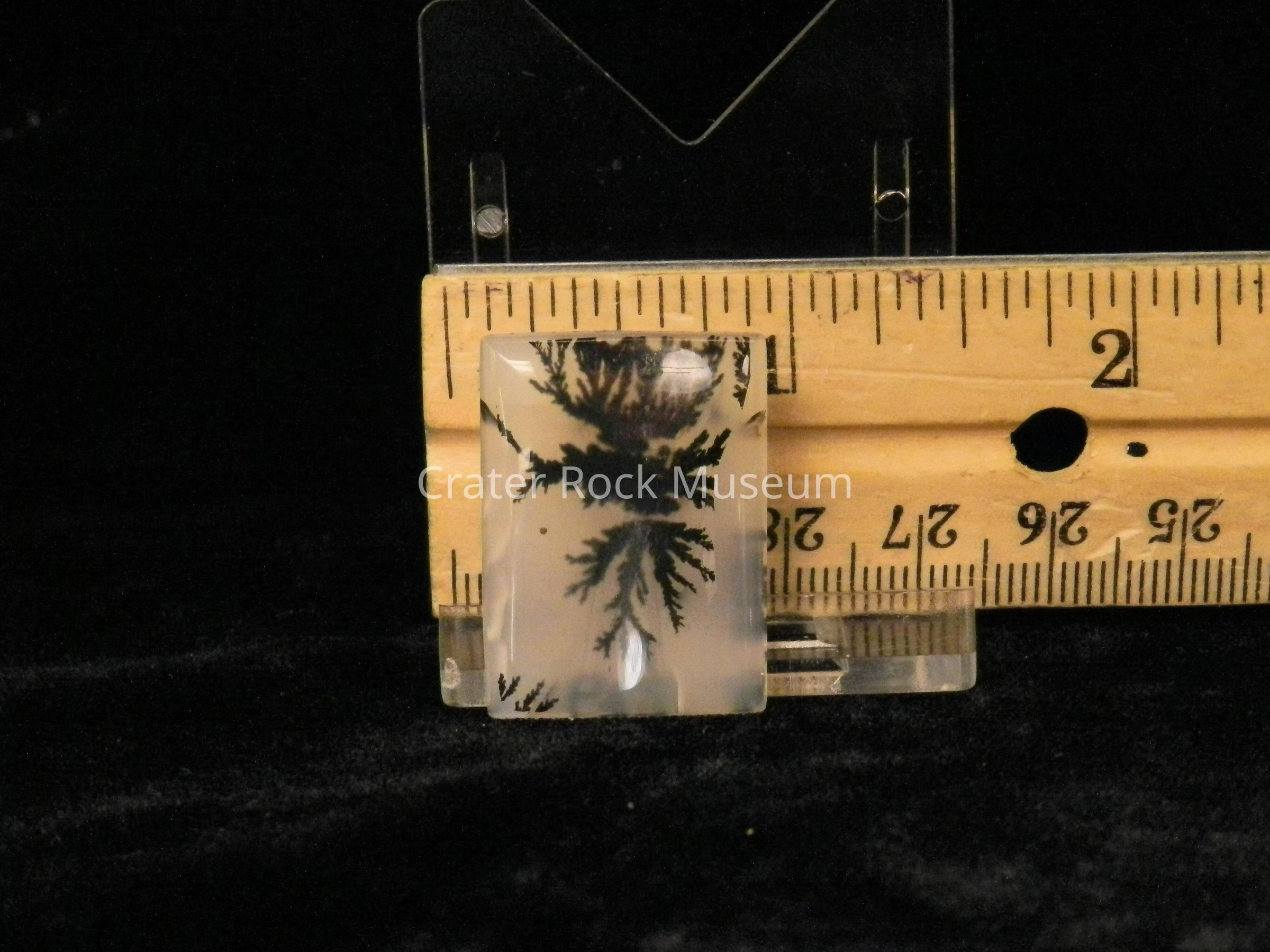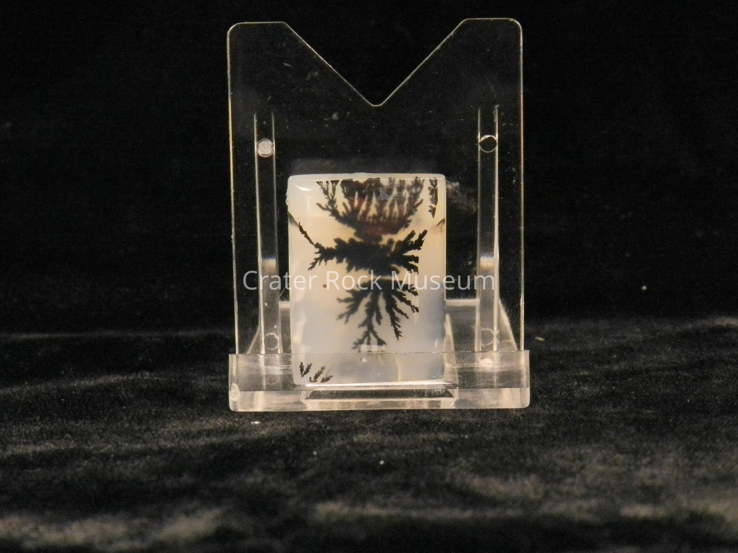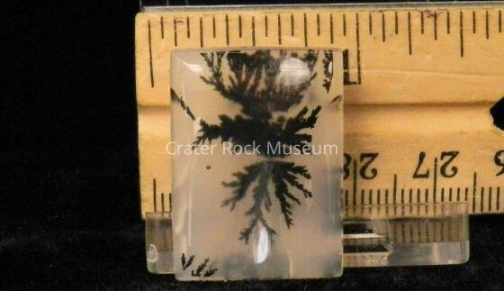 Description: Rectangular, with polished, slightly concave face. Translucent creamy white with black, semi-symmetrical dendritic structure.Collection