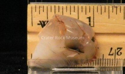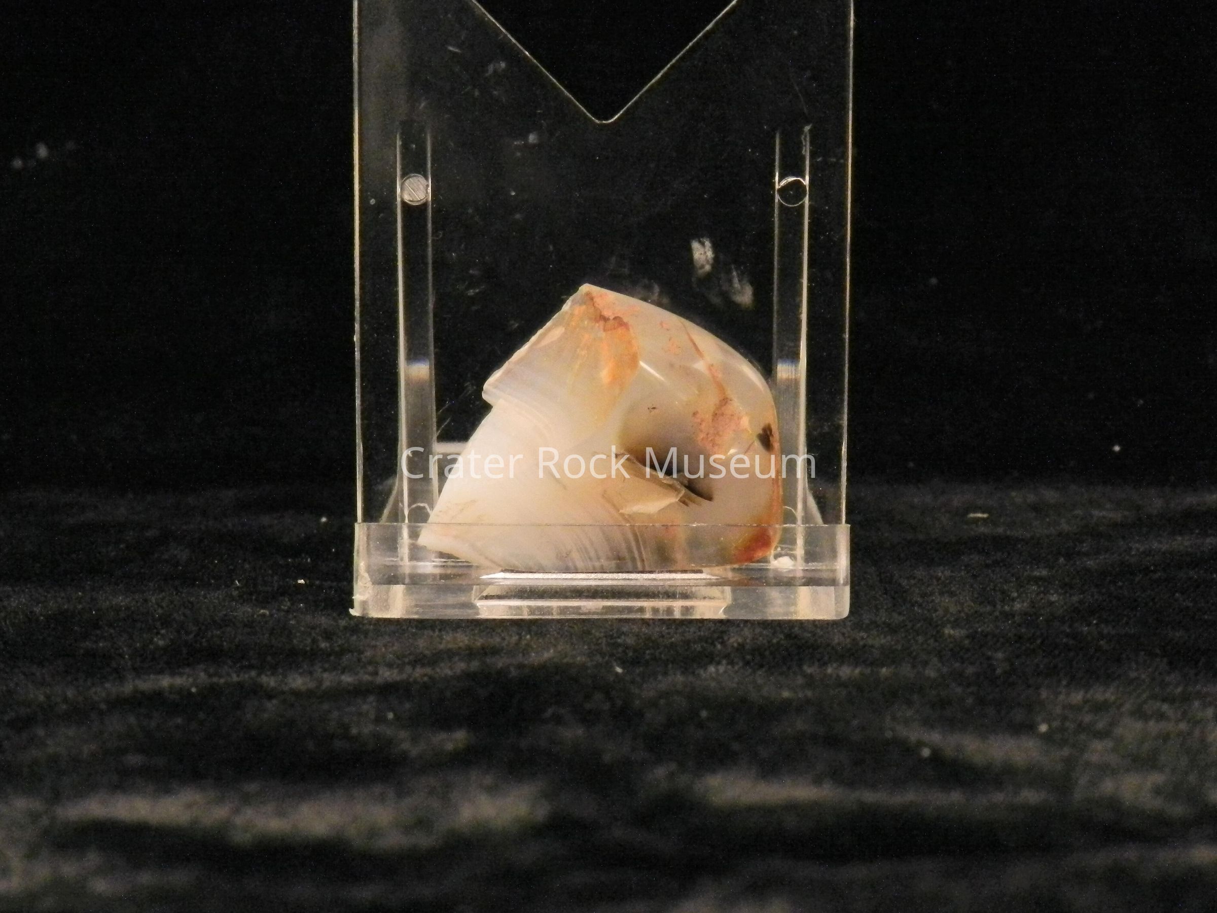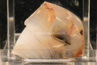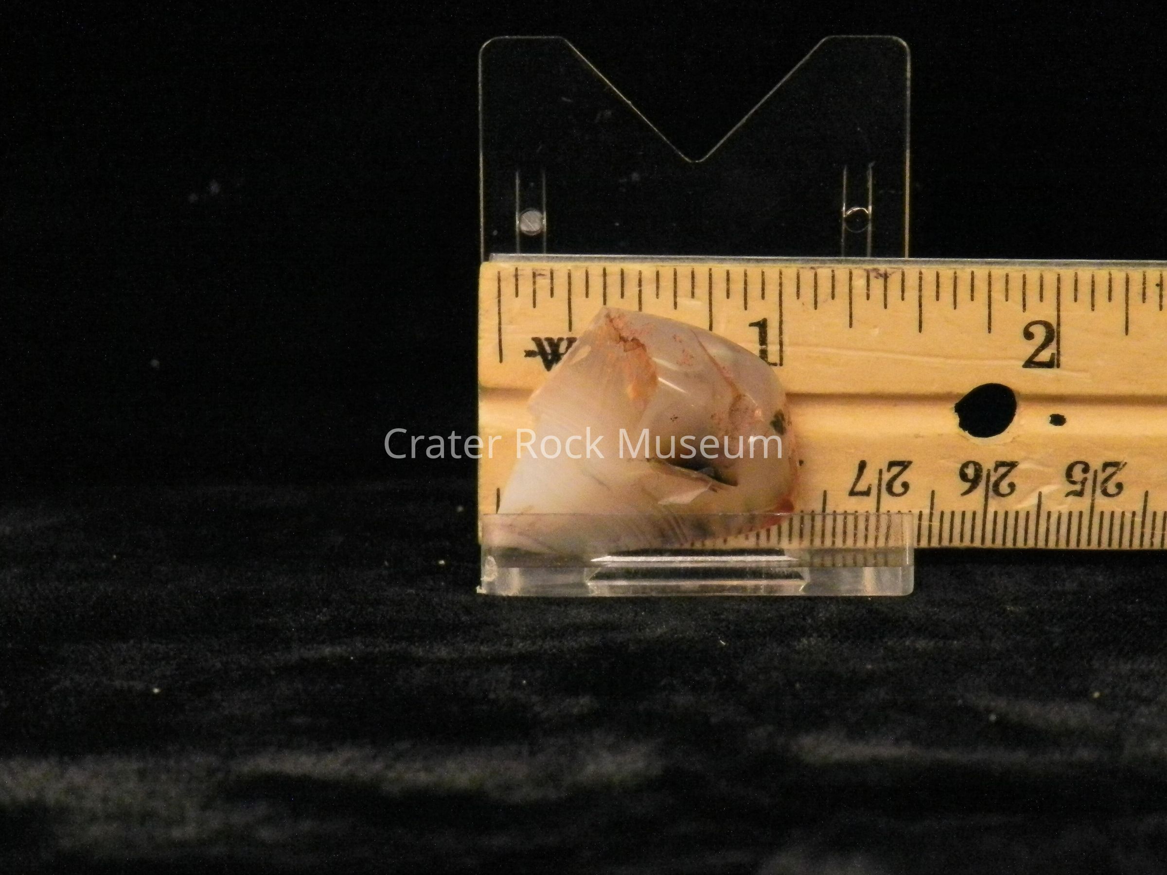 Description: Semi-triangular, with (4) polished angular sides. Pointed end is banded creamy white. The remainder is transparent tan to burnt orange, with a very slight dendritic structure.Collection