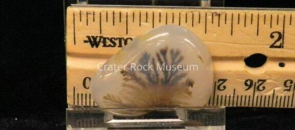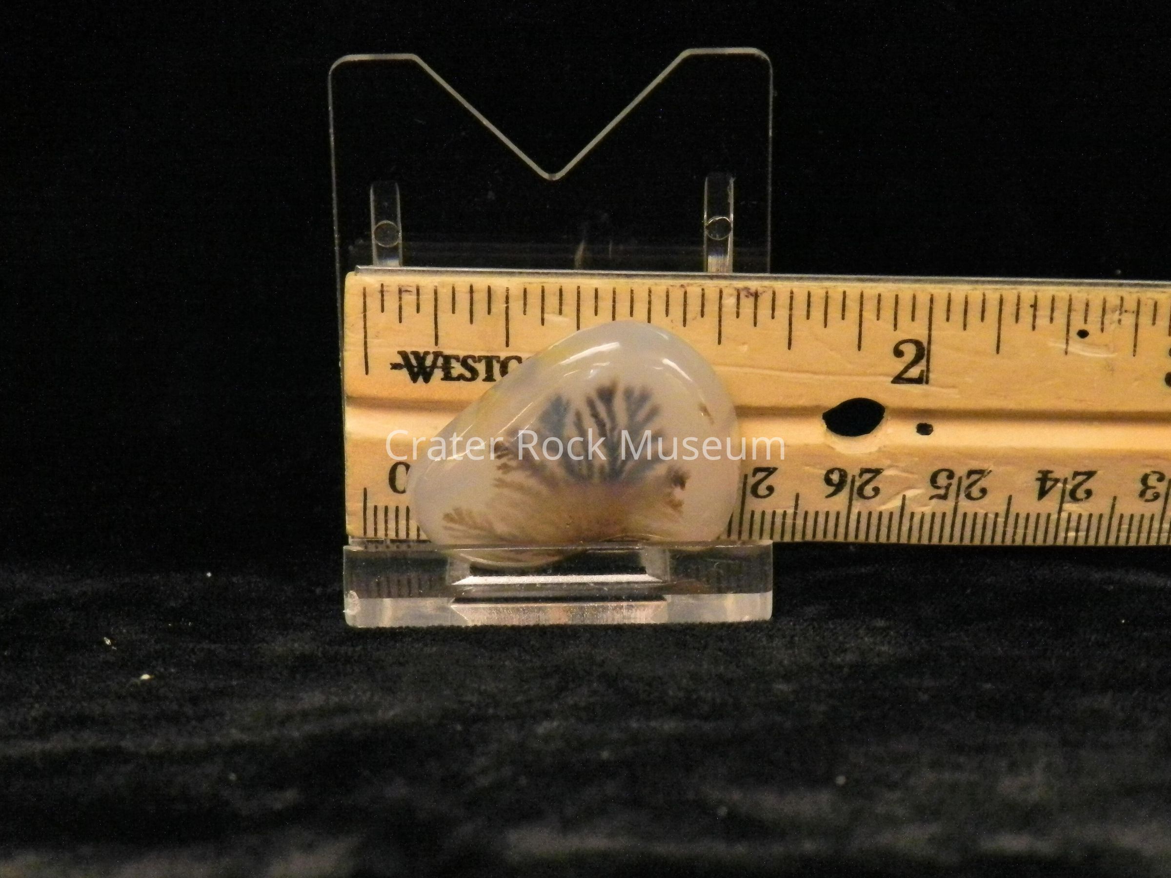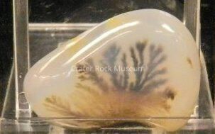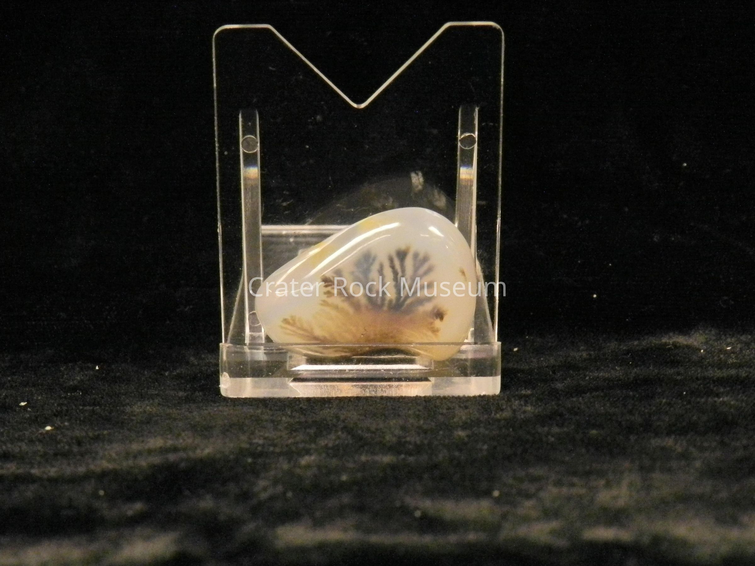Description: Somewhat "heart" shaped with multiple concave and convex structures on a polished face. Transparent beige with a brown multi-branching dendritic structure covering most of face.Collection