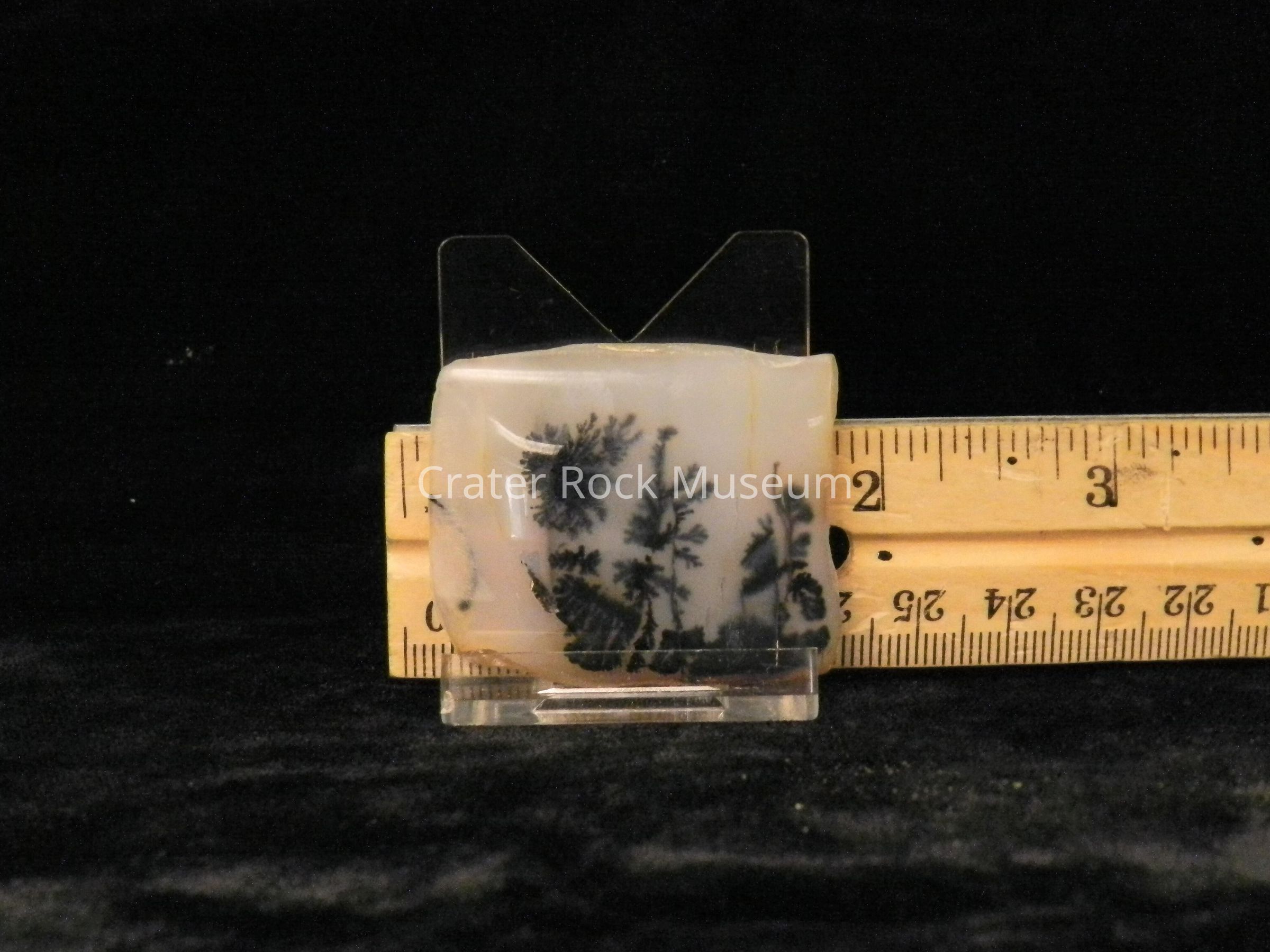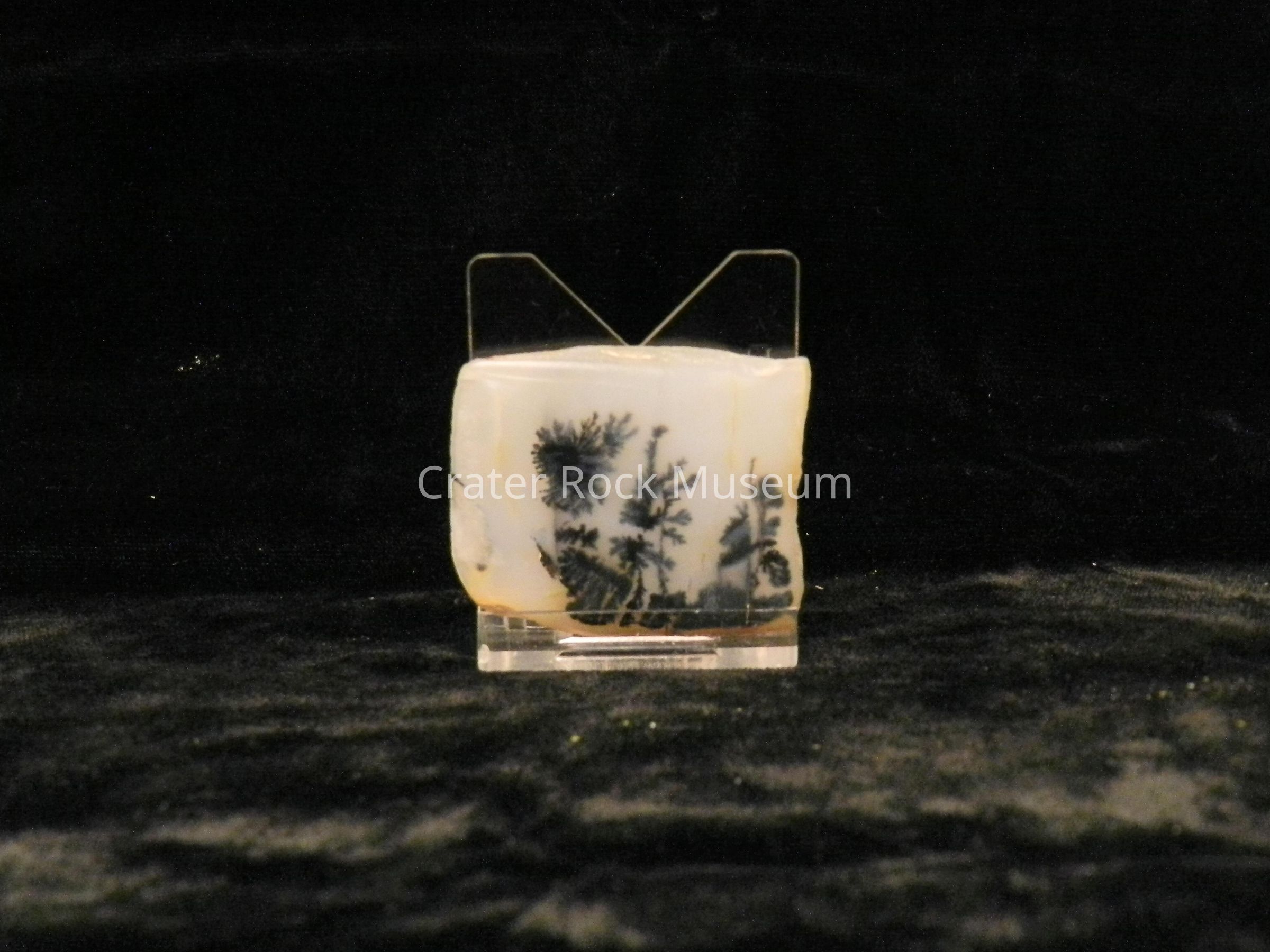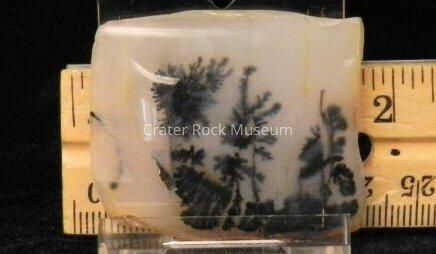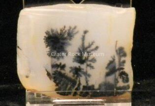 Description: Rectangular, with concave polished face. Translucent creamy white to blue-gray. Dendritic structure is in a square configuration with multiple black structures.Collection
