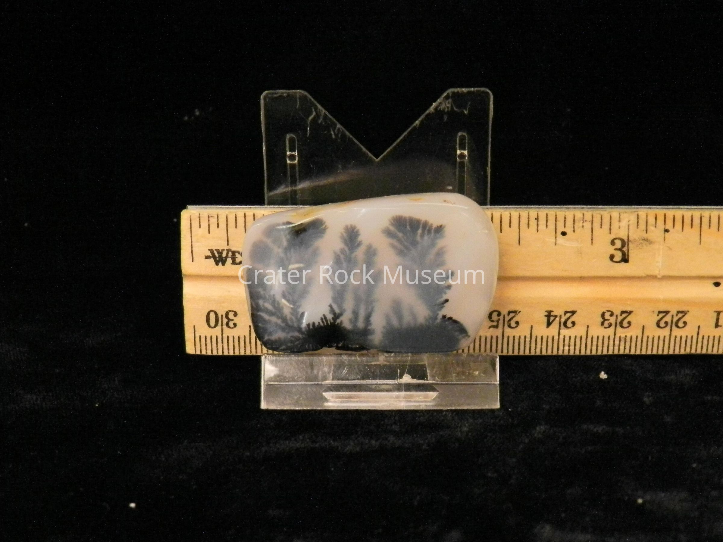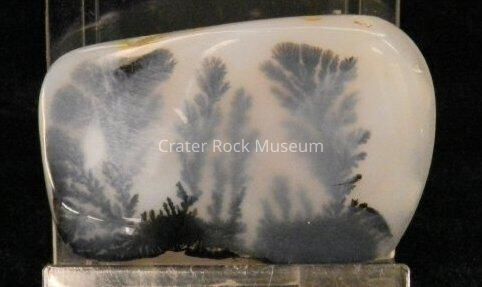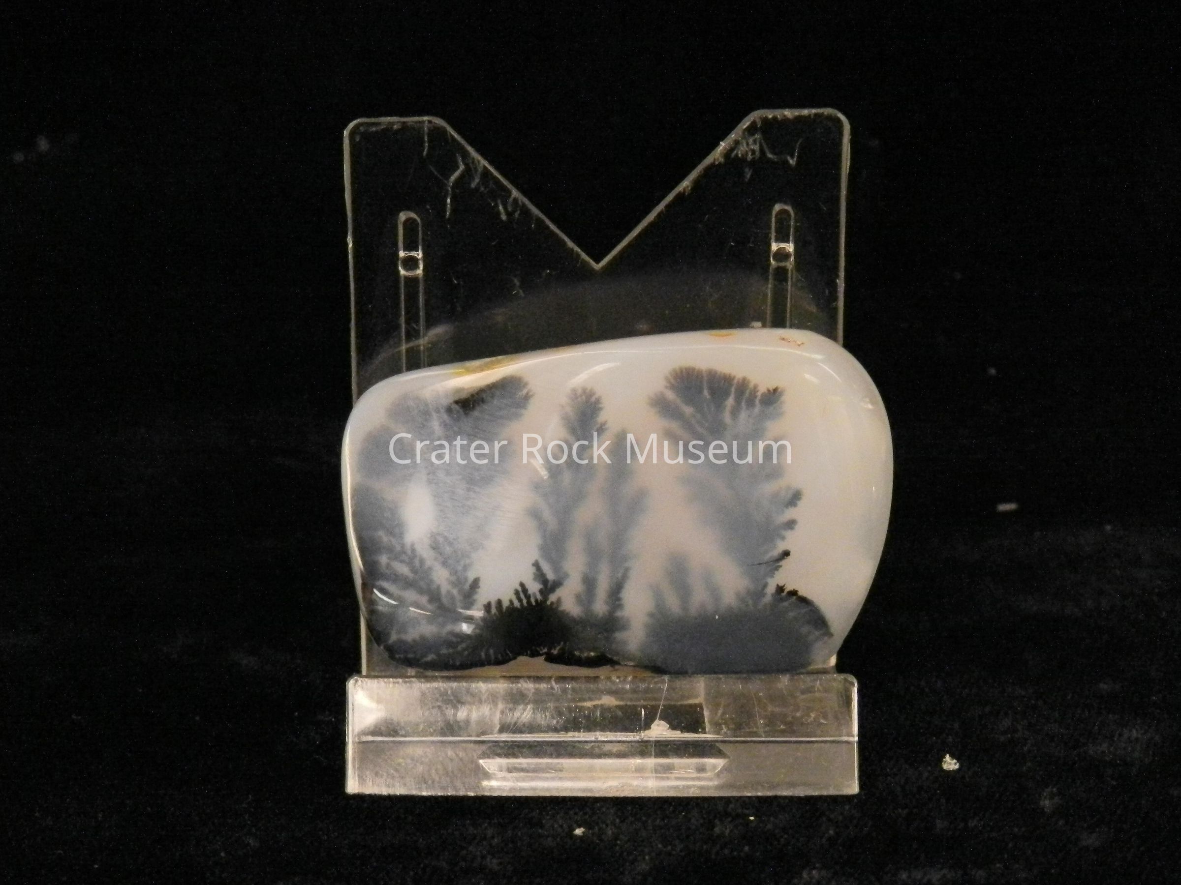 Description: Semi-rectangular with concave polished face. Translucent creamy white with multiple "tree-like", dark brown to black dendritic structures.Collection