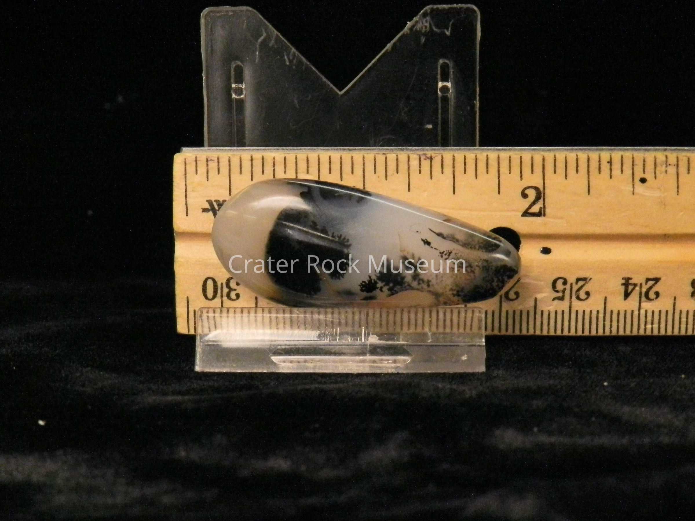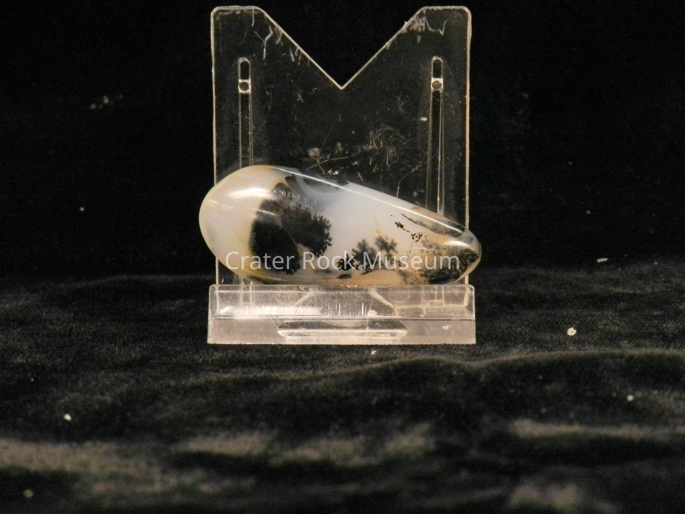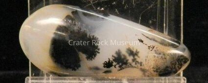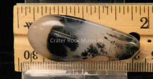 Description: Rounded, elongated "tear-drop" shape, polished on all sides. Translucent bands of creamy tan to black to blue-gray. Dendritic structure is fine-haired to solid black.Collection