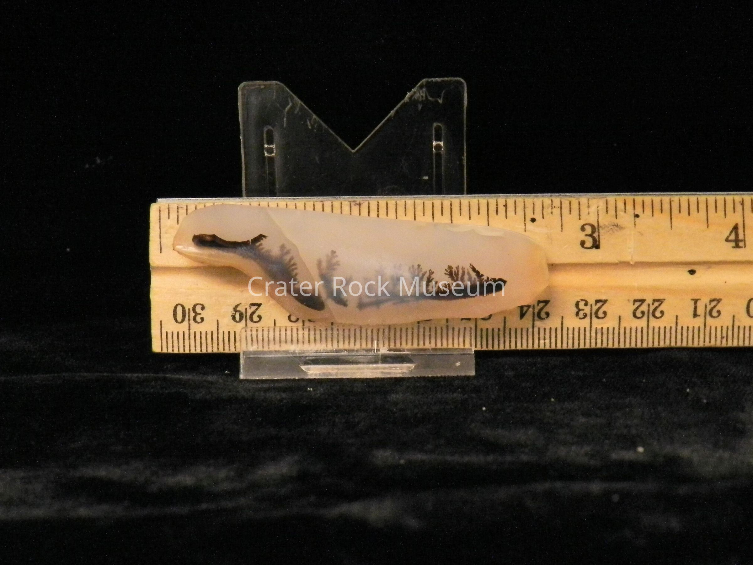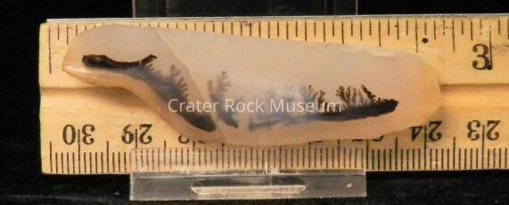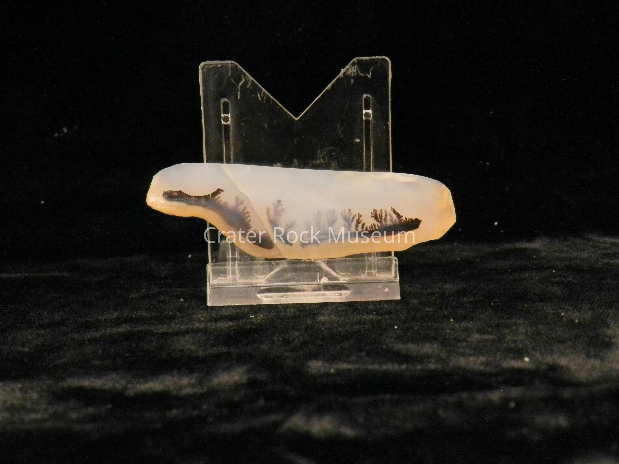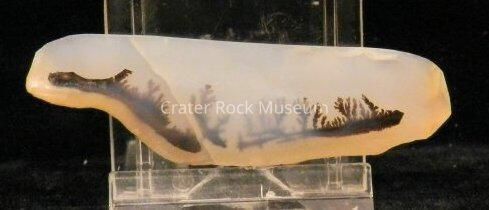 Description: Elongated, with flat back and convex polished face. Transparent creamy tan with brown dendritic structure running the length of one side.Collection