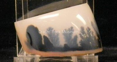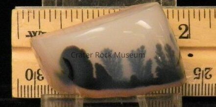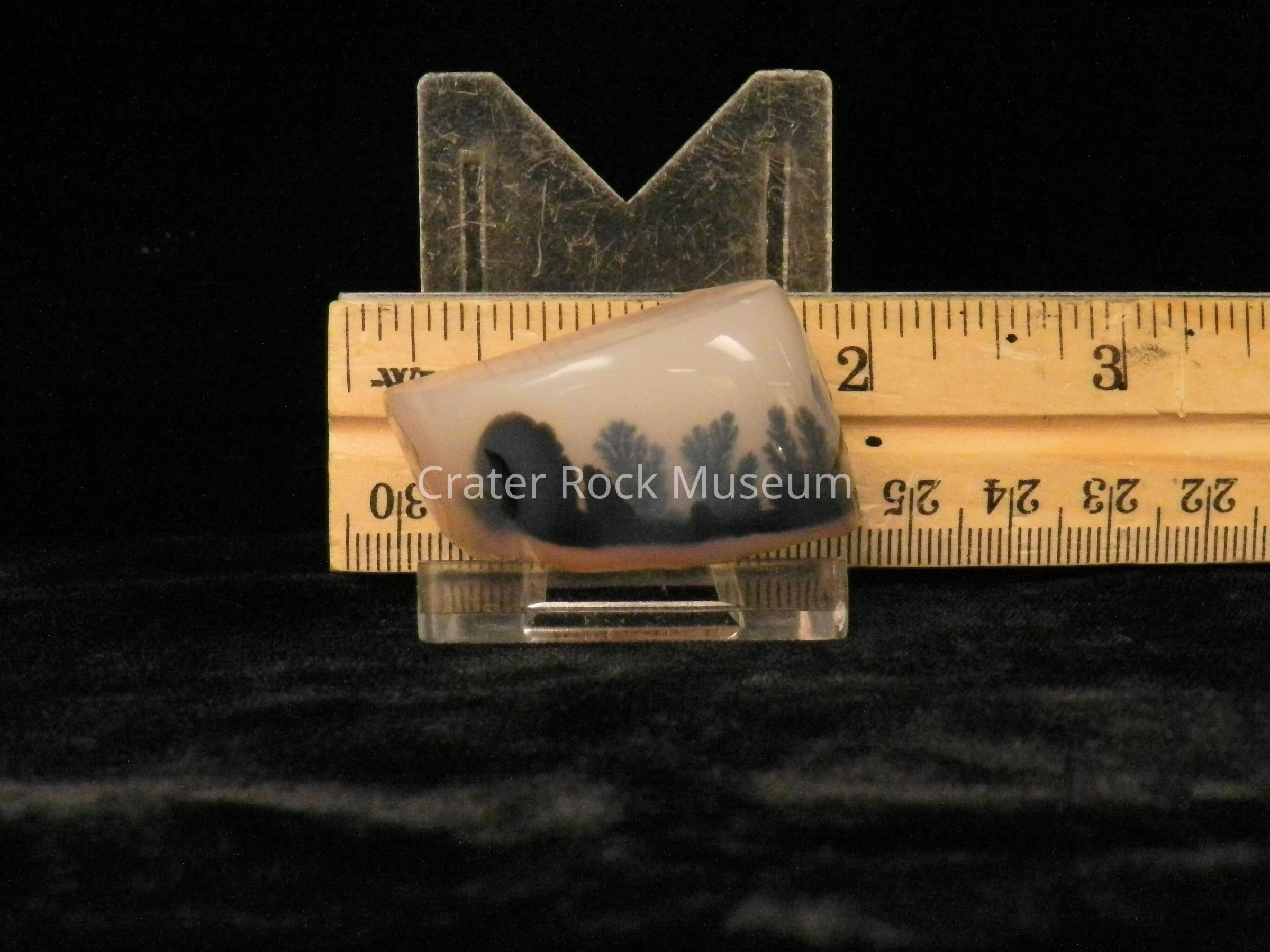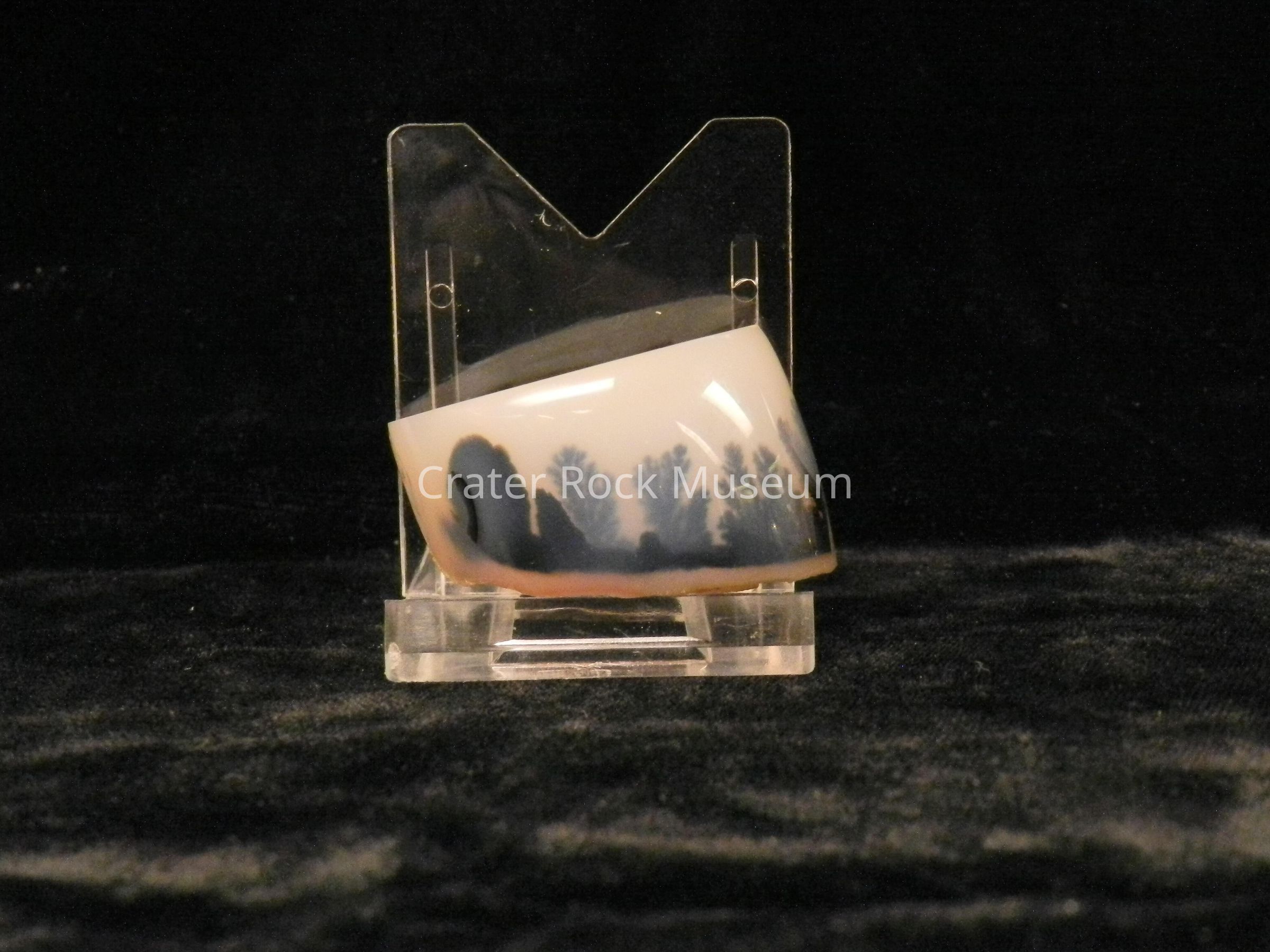 Description: Semi-circular, with (1) rough side and (1) smooth flat side and (1) highly convex polished side. Creamy white with some tan and a large dendritic structure extended along one edge. (multi-branched).Collection