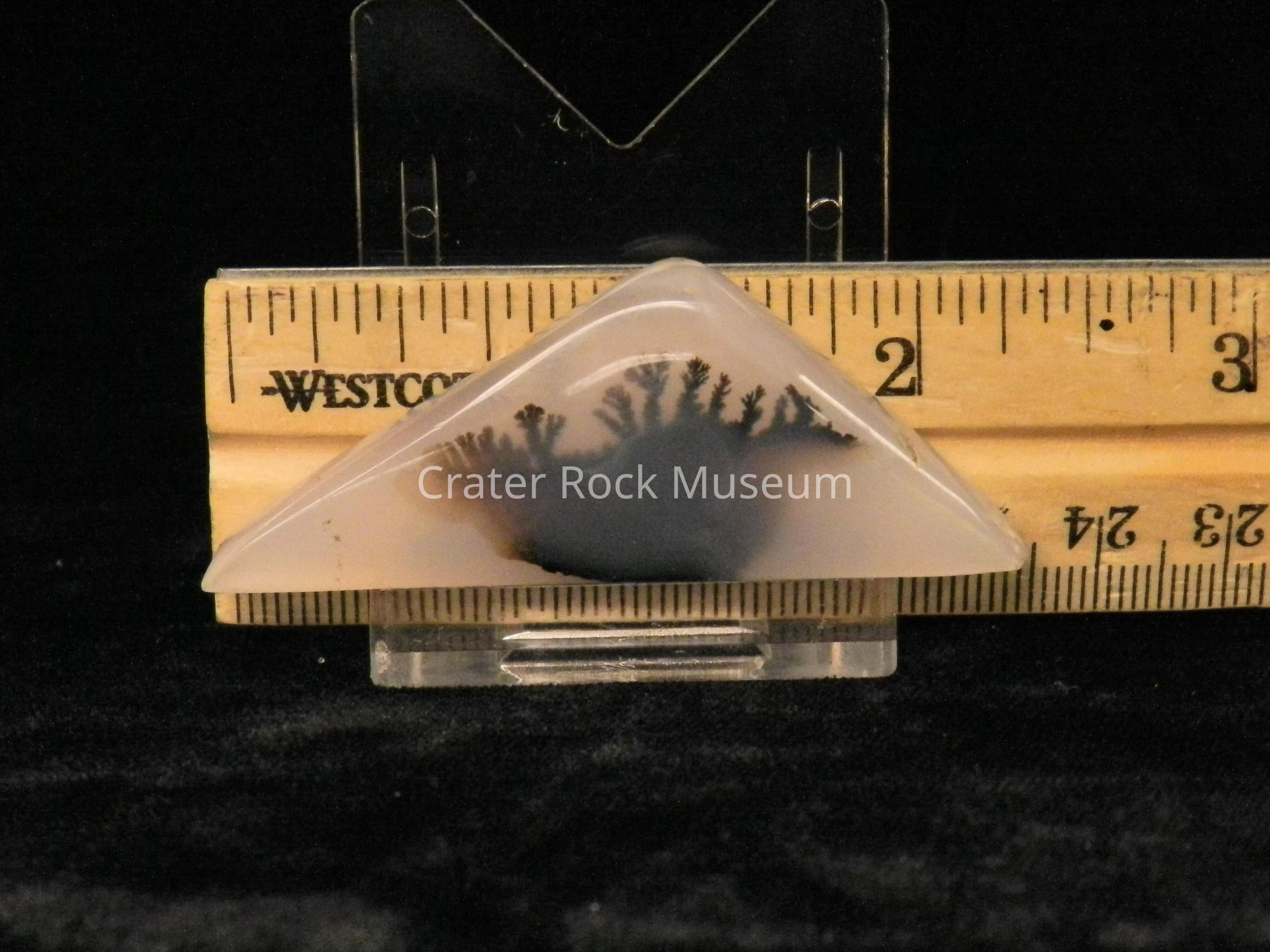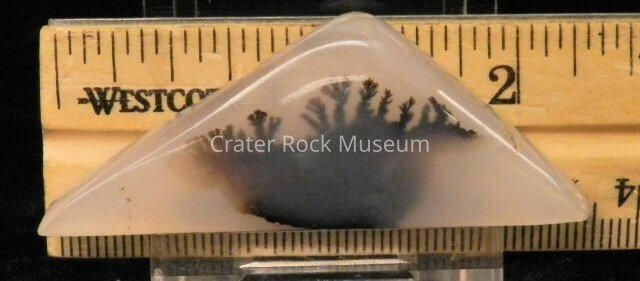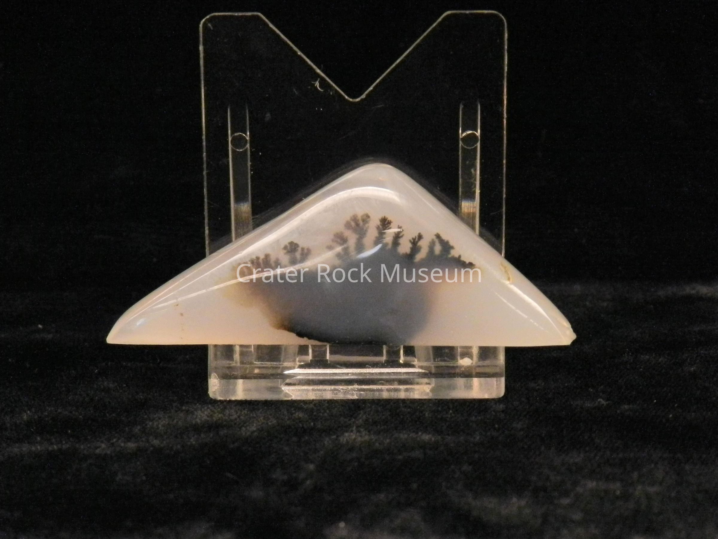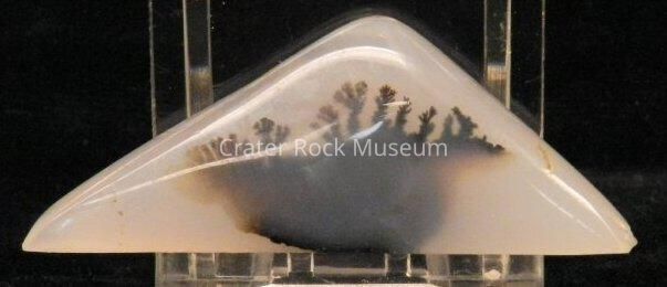 Description: Elongated triangle with flat back and polished face. Translucent creamy white with light to dark brown dendritic structure with multiple small branches.Collection